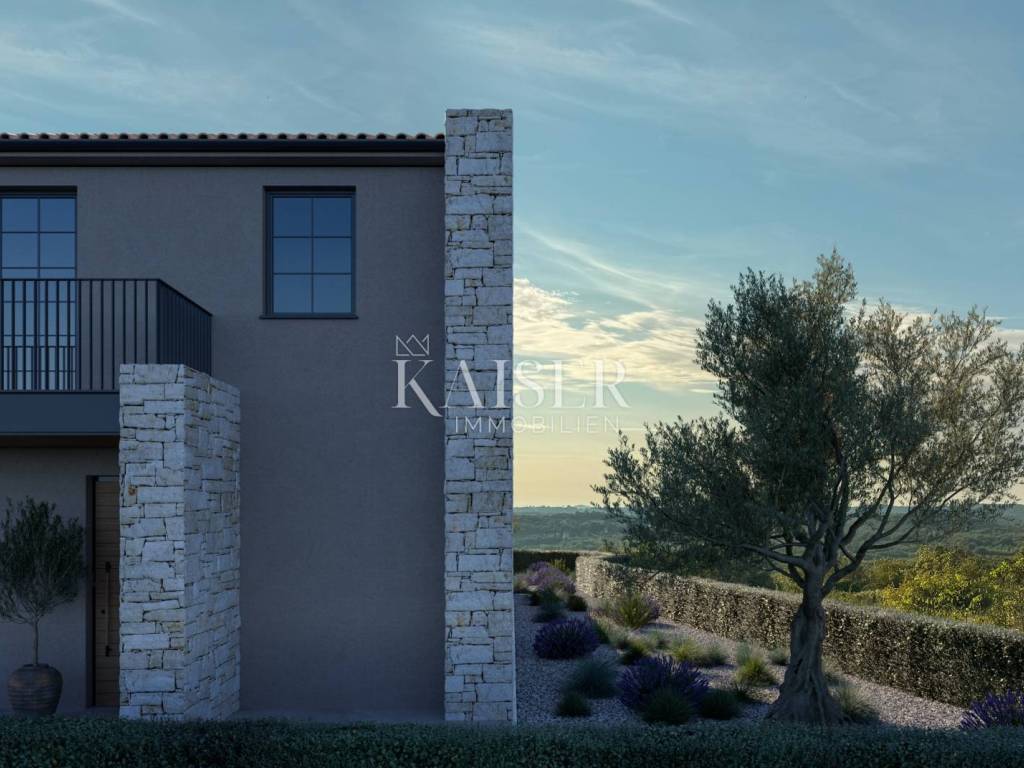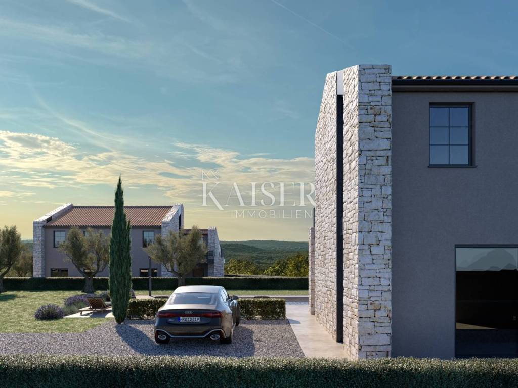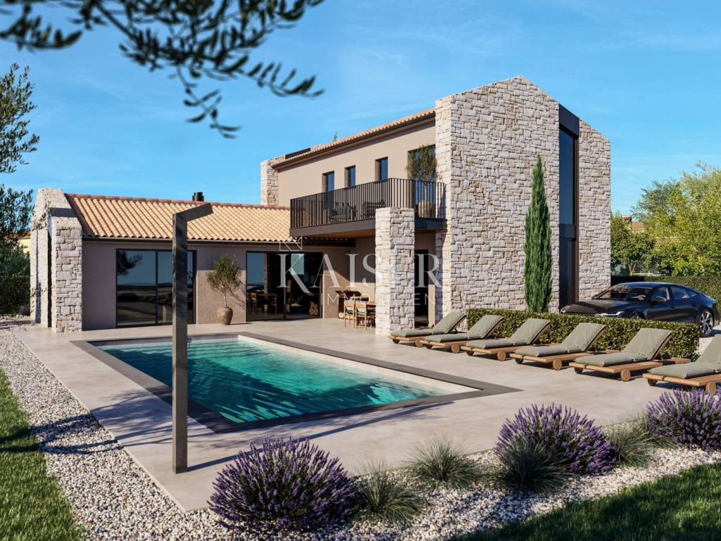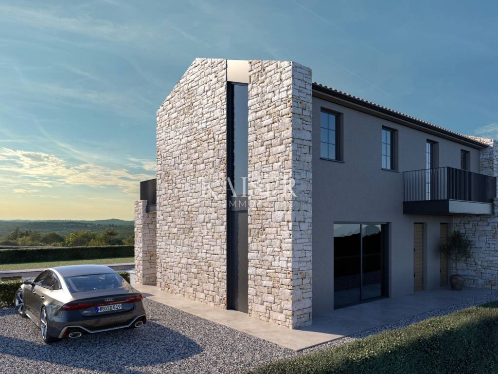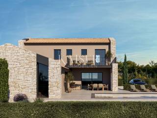 Kaiser Immobilien presents a beautiful villa under construction in a quiet location near Rovinj in the small town of Jural, designed by the famous designer and architect Sandro Užila. Preparations are underway for the start of construction, which is planned for the beginning of 2025, while completion of works and move-in are planned for 2026. The villa has 224 m2 gross and is located on a plot of 1100 m2. The villa consists of a ground floor and a first floor. The ground floor consists of: Living room - 32.91 m2 Kitchen and dining room - 39.81 m2 Utility room/Laundry room - 6.80 m2 Guest toilet - 2.94 m2 Sauna - 3.32 m2 Room 1 - 19.77 m2 Bathroom 1 - 5.47 m2 Covered terrace (50%) - 7.40 m2 Covered entrance (50%) - 1.76 m2 Staircase - 5.85 m2 Total ground floor: 126.03 m2 The first floor consists of: Hallway - 3.36 m2 Room 2 - 17.57 m2 Bathroom 2 - 5.19 m2 Room 3 - 21.50 m2 Bathroom 3 - 6.13 m2 Balcony (50%) - 1.76 m2 Uncovered terrace (50%) - 6.79 m2 Staircase - 7.40 m2 Total floor: 69.79 m2 Total usable living area is: 195.82 m2 The villa is sold unfurnished and ready to move in, but there is a possibility of furnishing at the request of the buyers. In that case, the price is formed differently. In the early phase, there is a possibility of agreement on the color of the materials (tiles, wall color, etc.). There is a possibility of paying extra for special requests. The house has two parking spaces. The distance from the sea and beach as well as the center of Rovinj is 20 km. The distance from the highway is 9 minutes drive. Payment is in installments of 30/35/35, but it is possible to agree differently.