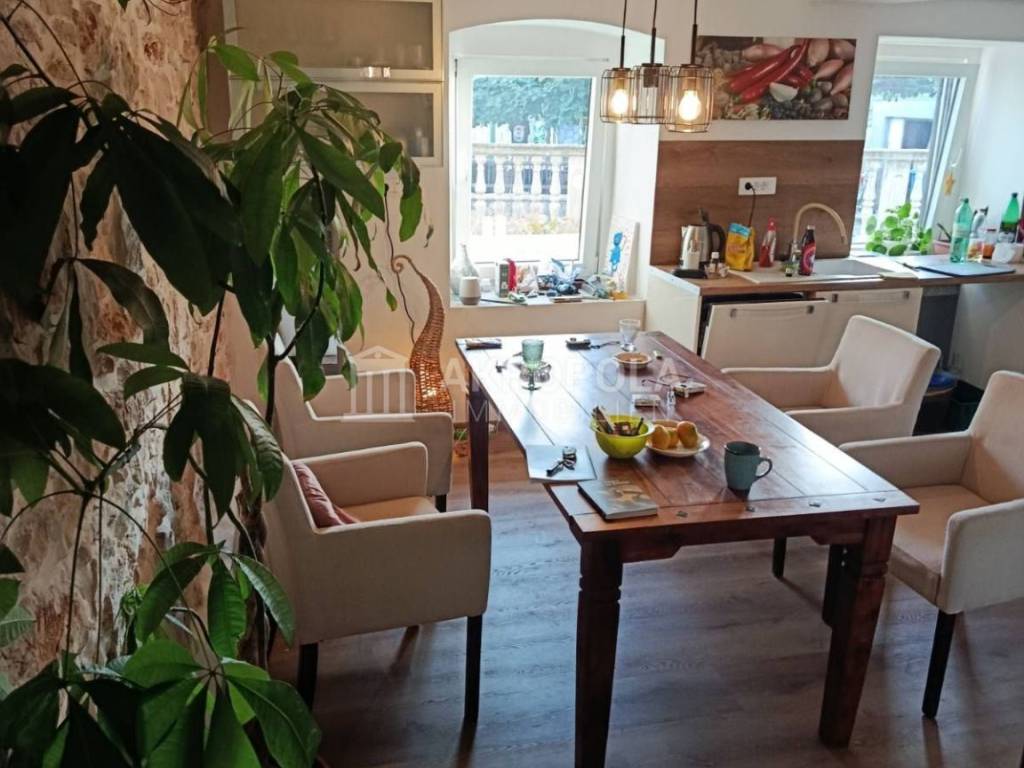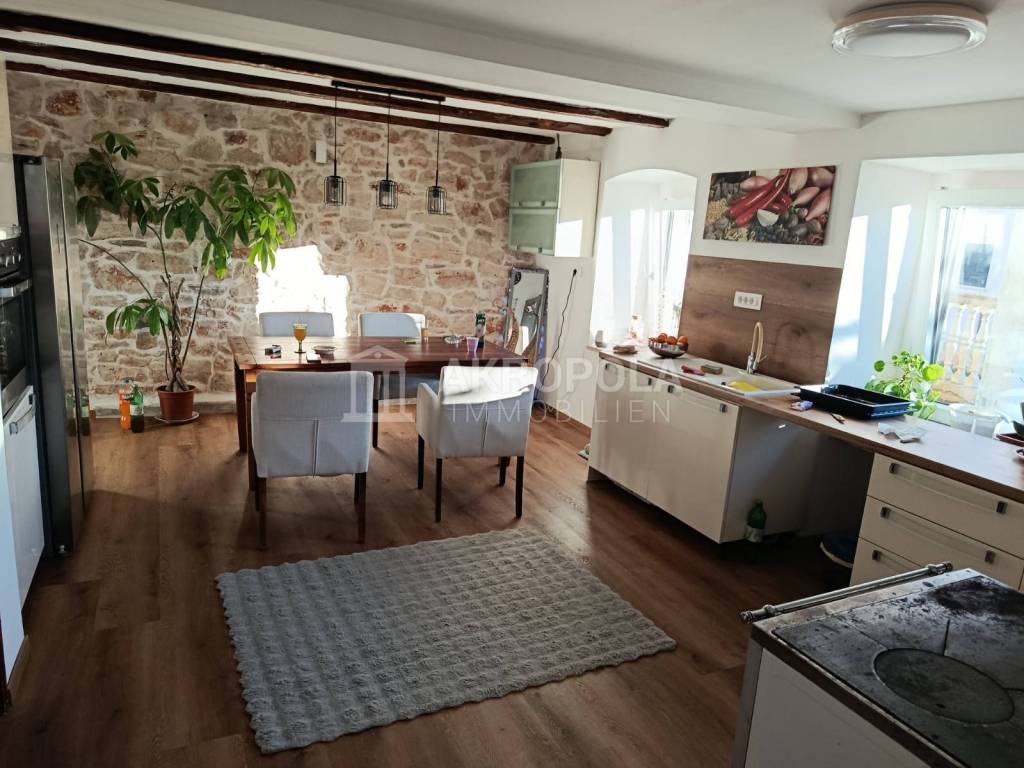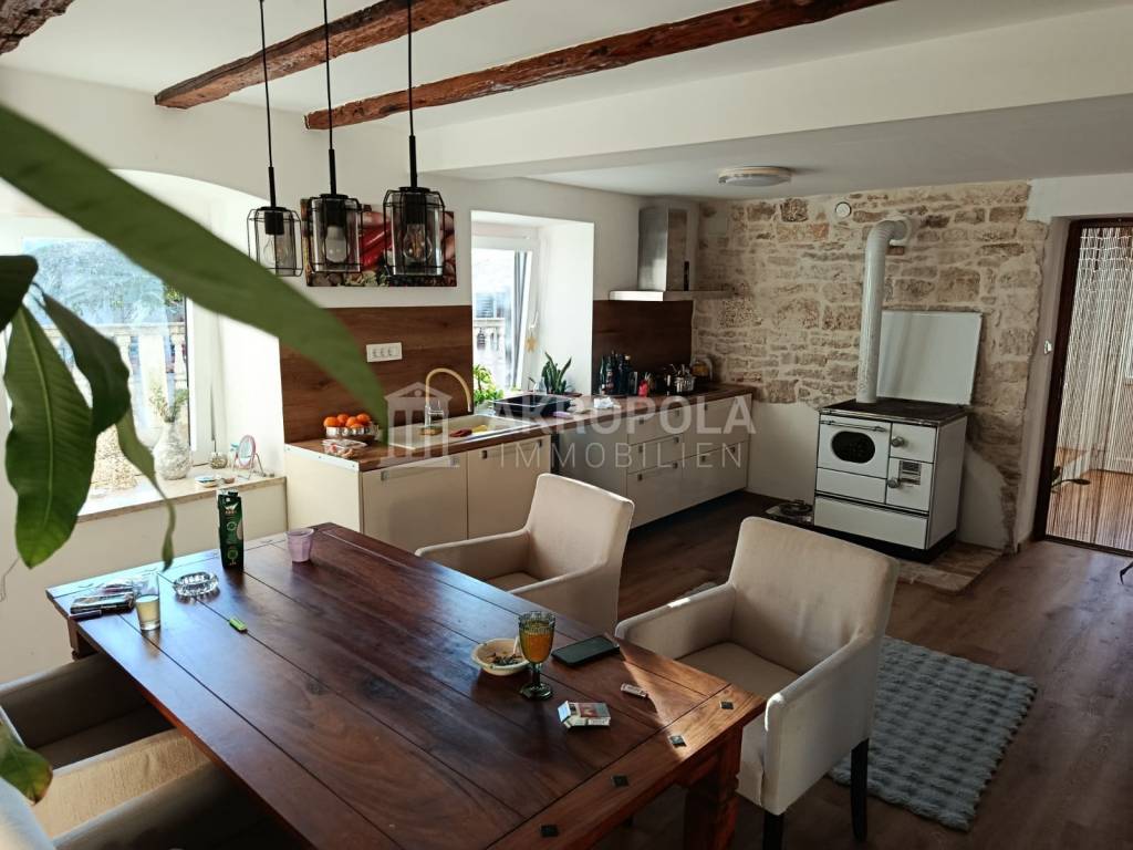 Semi-detached stone house 300 m2 completely renovated, 3 courtyards, tavern, auxiliary buildings. In a quiet Istrian village just 10 minutes from Svetvincenat and Vodnjan, an attractive semi-detached stone house is for sale that combines tradition and modern comfort. The house consists of two connected units, a restored stone house and a house from the 90s, which together form one harmonious home with a total area of 300 m2.