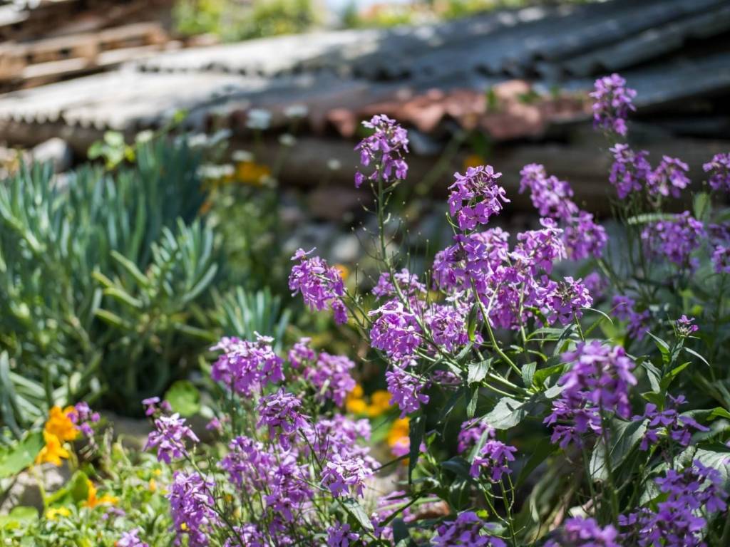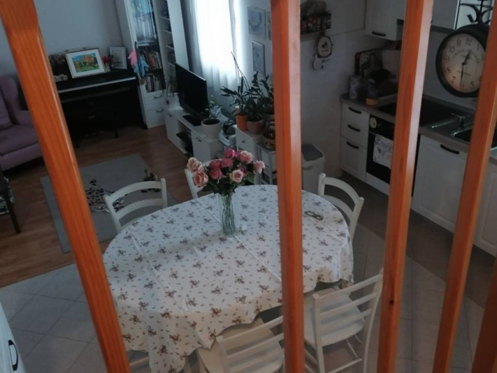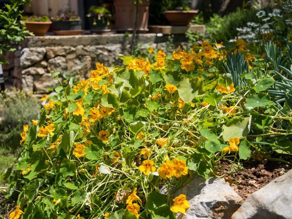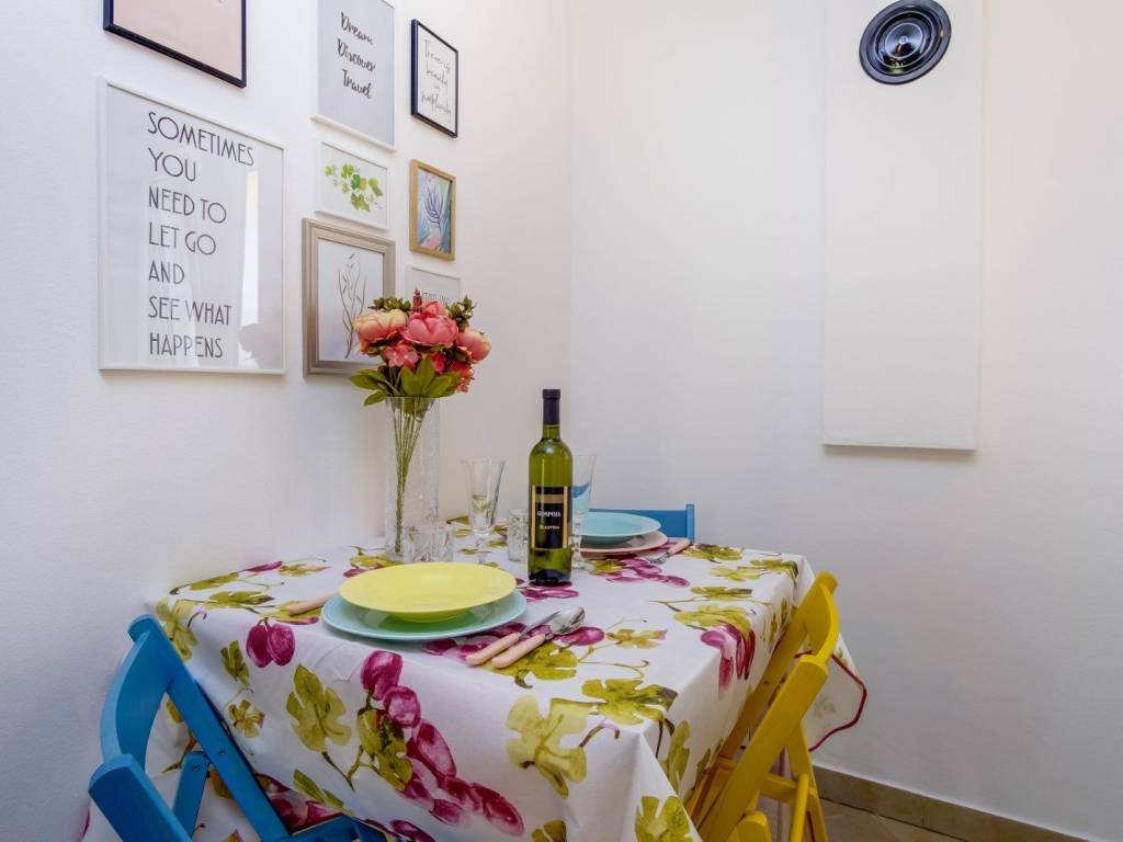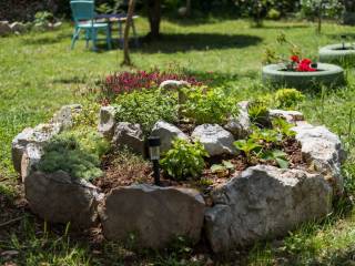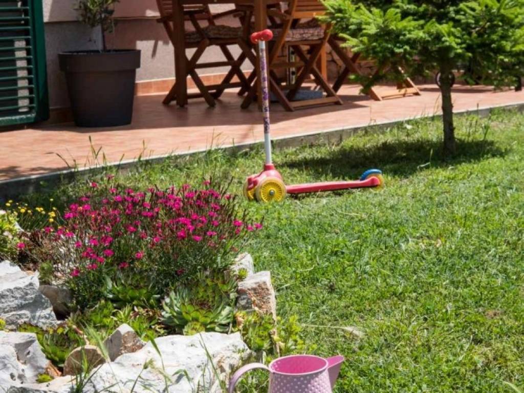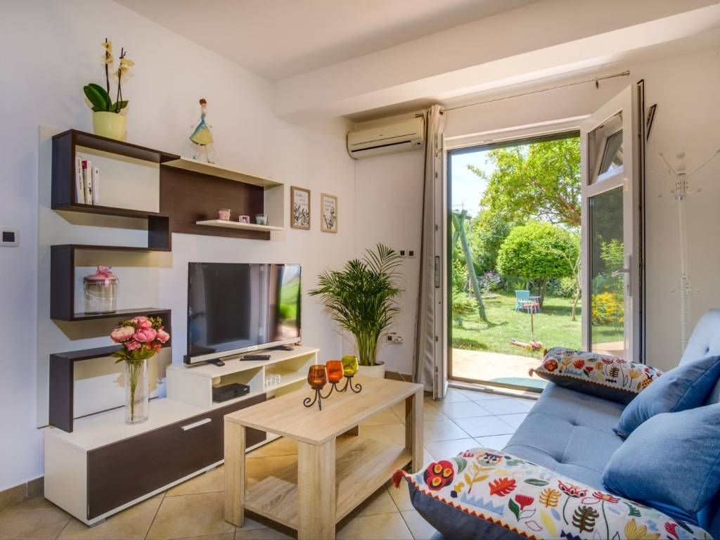 The apartment consists of a kitchen, a living room, a bedroom, a bathroom, and a terrace with a view of a beautiful green garden.