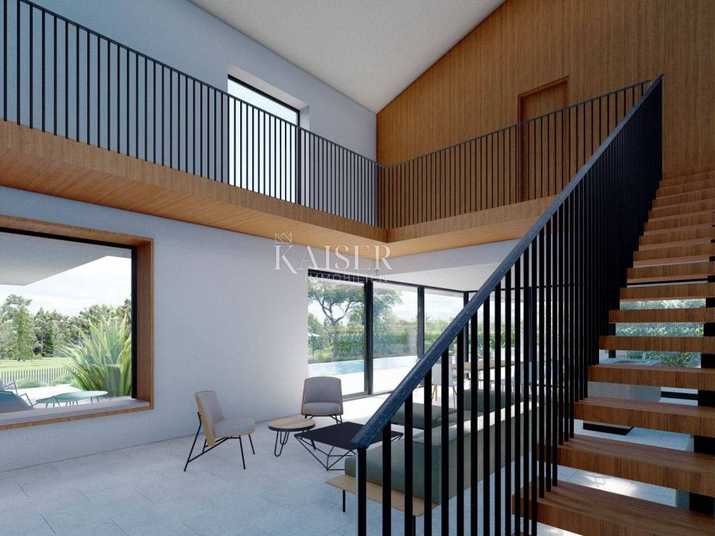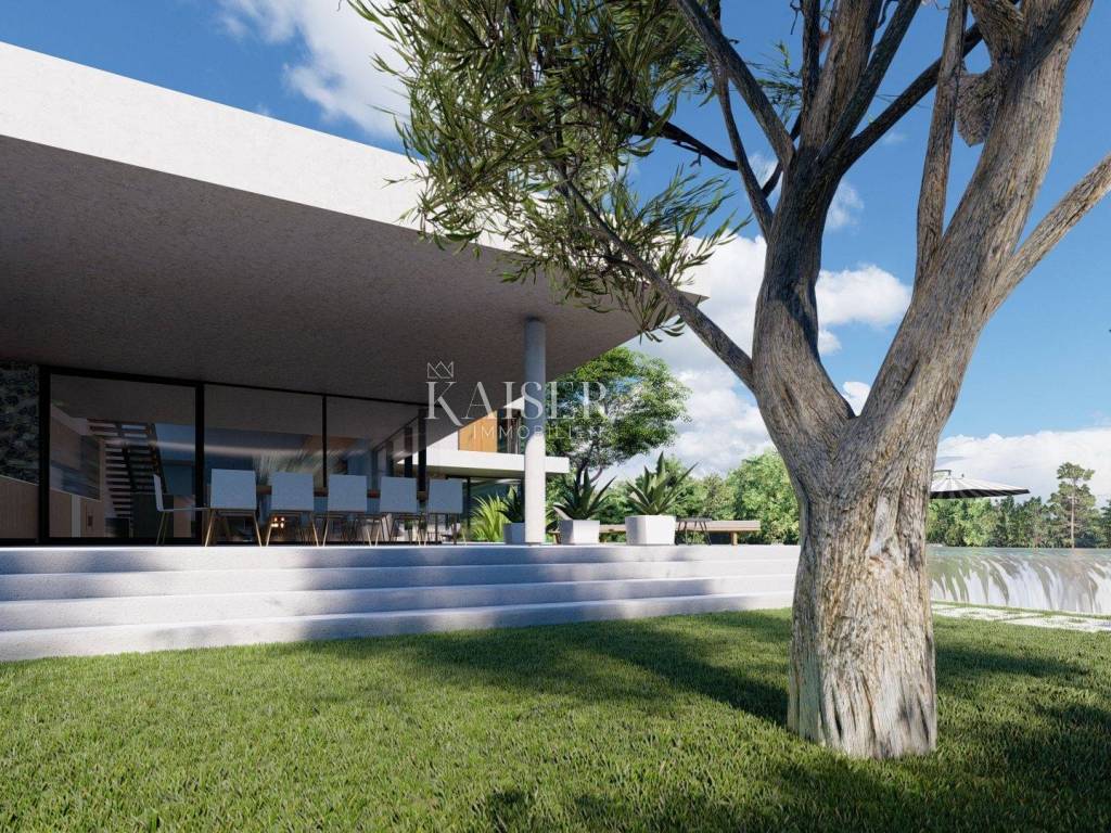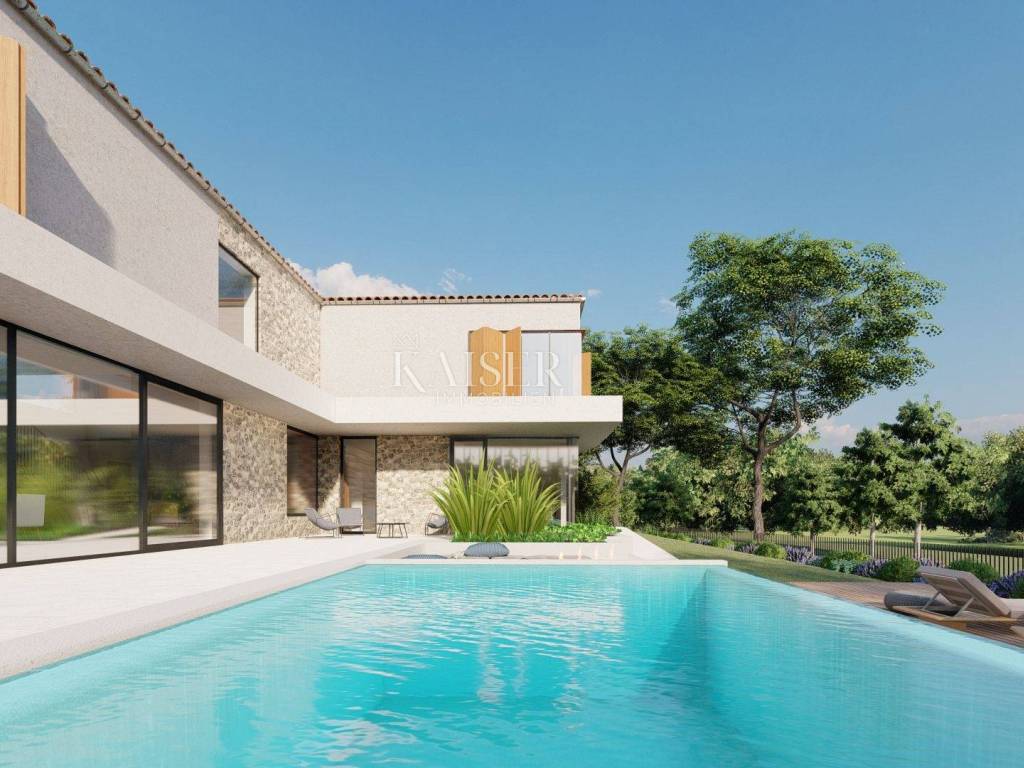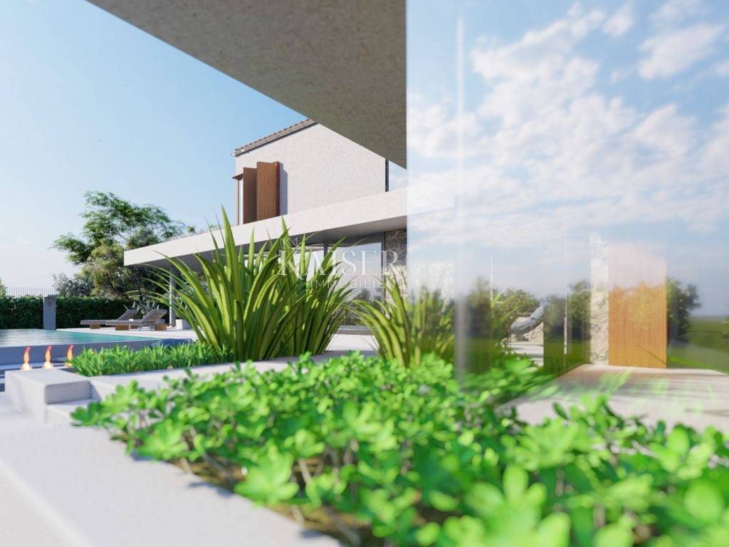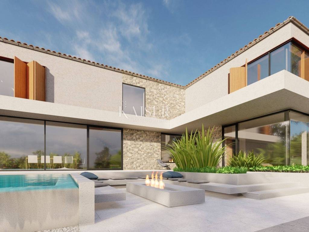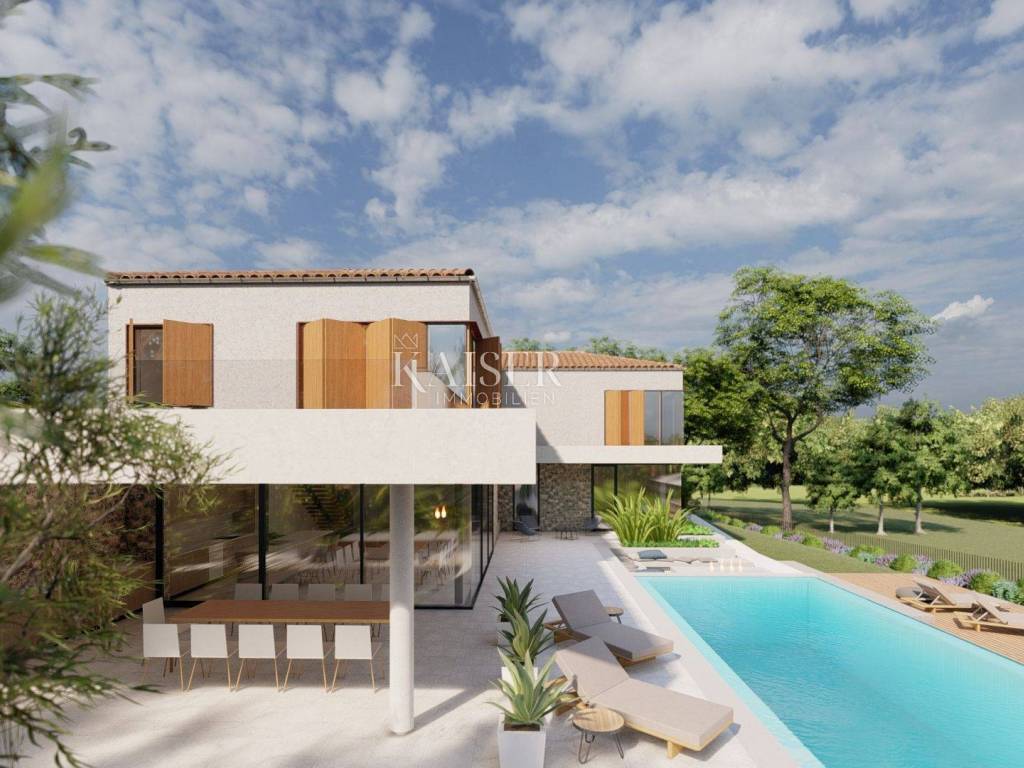 Kaiser Immobilien presents a new luxury property on the market, only 13 km from the city of Poreč. The property is located in a beautiful autochthonous Istrian town, very popular for the construction of villas and similar facilities. The property is located on a plot of 1100 m2, and the size of the property itself is 380 m2 gross. The shape of the property is designed in the shape of the letter L, with an outdoor pool in the middle that overflows on 2 sides. The size of the pool is 54m2. The property consists of a ground floor and a first floor and offers you a wonderful view of nature, and given its position, it is located in a very peaceful and quiet natural environment. On the ground floor of the property there is a spacious comfortable living room with a kitchen and a dining room. While upstairs there are 4 spacious bedrooms, each with its own bathroom, approx. 30m2. Due to the spacious high-quality windows, the view from the bedrooms is guaranteed to be relaxing and promising. Within the villa there is also a game room for enjoying your free time and wellness, which consists of a sauna and a shower. This beautiful villa really offers you different opportunities to relax and enjoy beautiful Istria and untouched nature. The villa is heated via a heat pump together with underfloor heating. The villa also has solar collectors for heating water and a water softening system that solves the problem of scale. The floors are finished with micro cement. This beautiful modern prefab villa is equipped with high quality and premium materials. Careful attention is paid to every detail that would be useful to the future owner. The villa is sold fully equipped with all its furniture, and the planned completion of construction is the end of 2023 or the beginning of 2024.