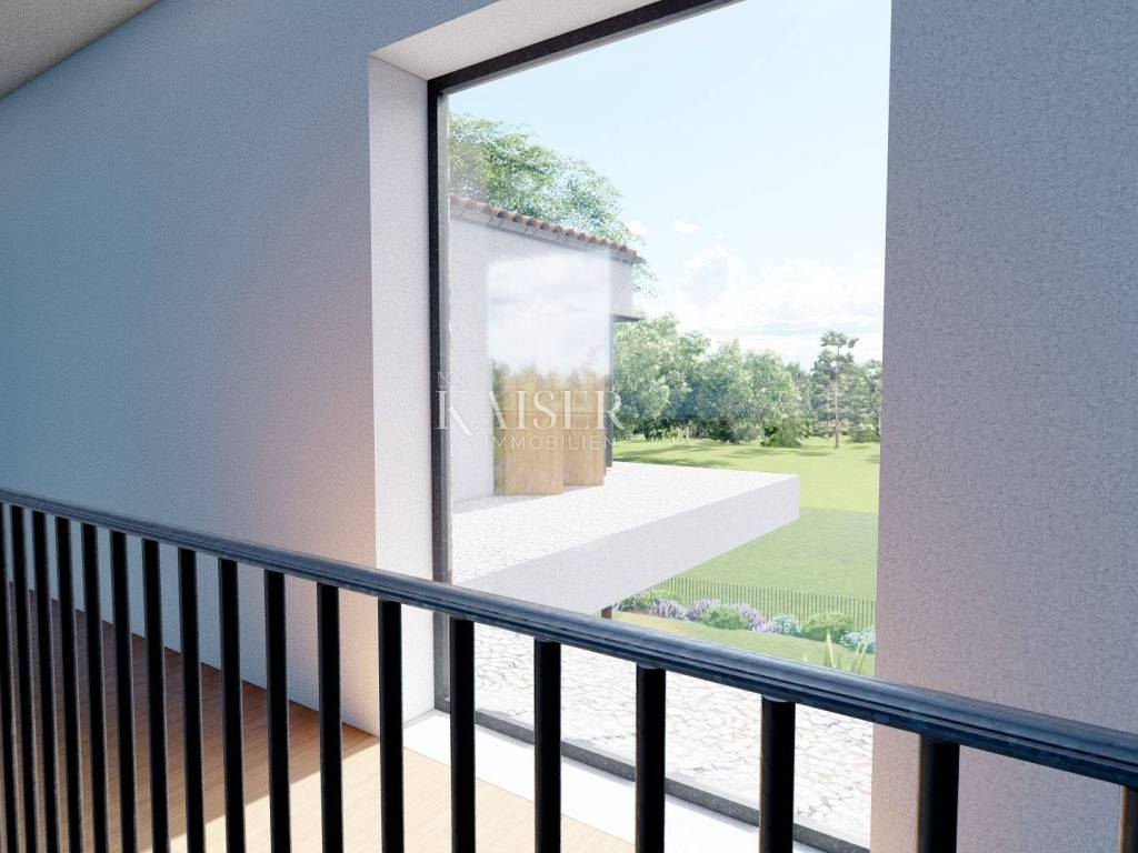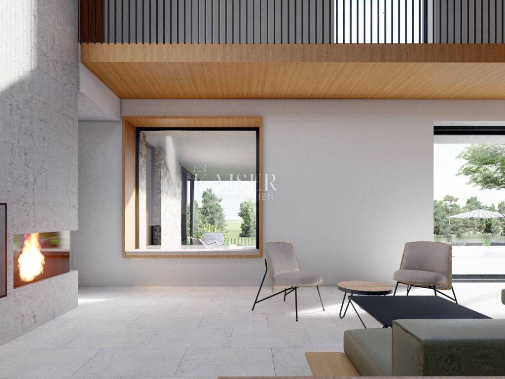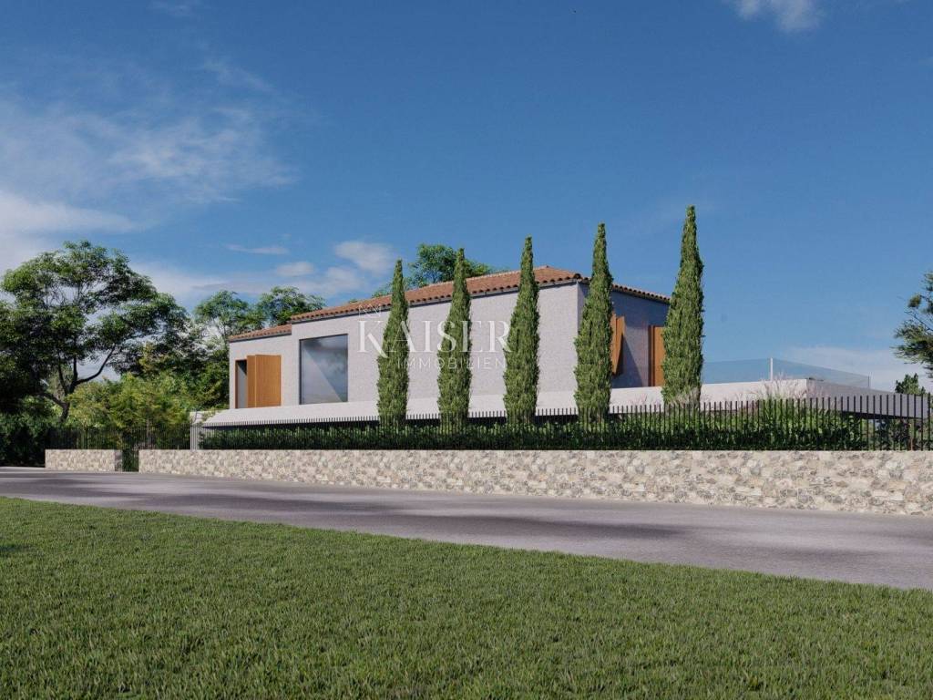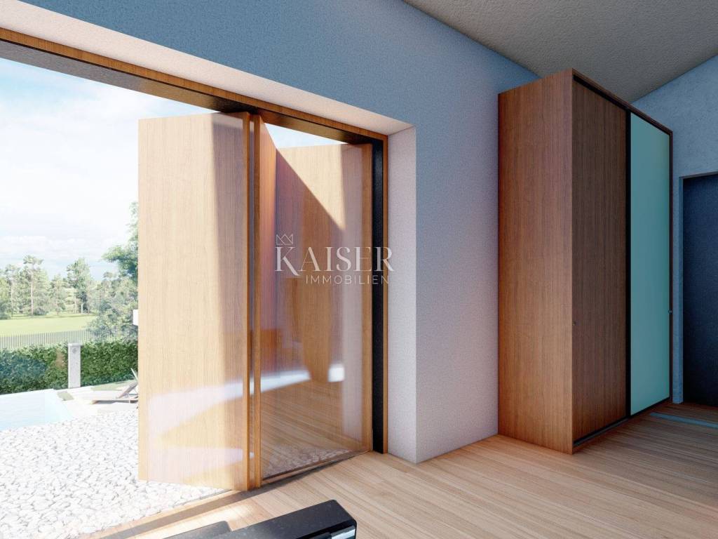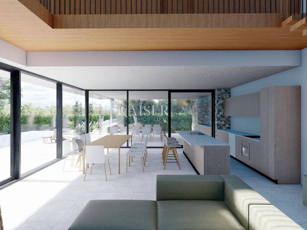 Kaiser Immobilien presents a new luxury property on the market, only 13 km from the city of Poreč. The property is located in a beautiful autochthonous Istrian town, very popular for the construction of villas and similar facilities. The property is located on a plot of 1100 m2, and the size of the property itself is 380 m2 gross. The shape of the property is designed in the shape of the letter L, with an outdoor pool in the middle that overflows on 2 sides. The size of the pool is 54m2. The property consists of a ground floor and a first floor and offers you a wonderful view of nature, and given its position, it is located in a very peaceful and quiet natural environment. On the ground floor of the property there is a spacious comfortable living room with a kitchen and a dining room. While upstairs there are 4 spacious bedrooms, each with its own bathroom, approx. 30m2. Due to the spacious high-quality windows, the view from the bedrooms is guaranteed to be relaxing and promising. Within the villa there is also a game room for enjoying your free time and wellness, which consists of a sauna and a shower. This beautiful villa really offers you different opportunities to relax and enjoy beautiful Istria and untouched nature. The villa is heated via a heat pump together with underfloor heating. The villa also has solar collectors for heating water and a water softening system that solves the problem of scale. The floors are finished with micro cement. This beautiful modern prefab villa is equipped with high quality and premium materials. Careful attention is paid to every detail that would be useful to the future owner. The villa is sold fully equipped with all its furniture, and the planned completion of construction is the end of 2023 or the beginning of 2024.