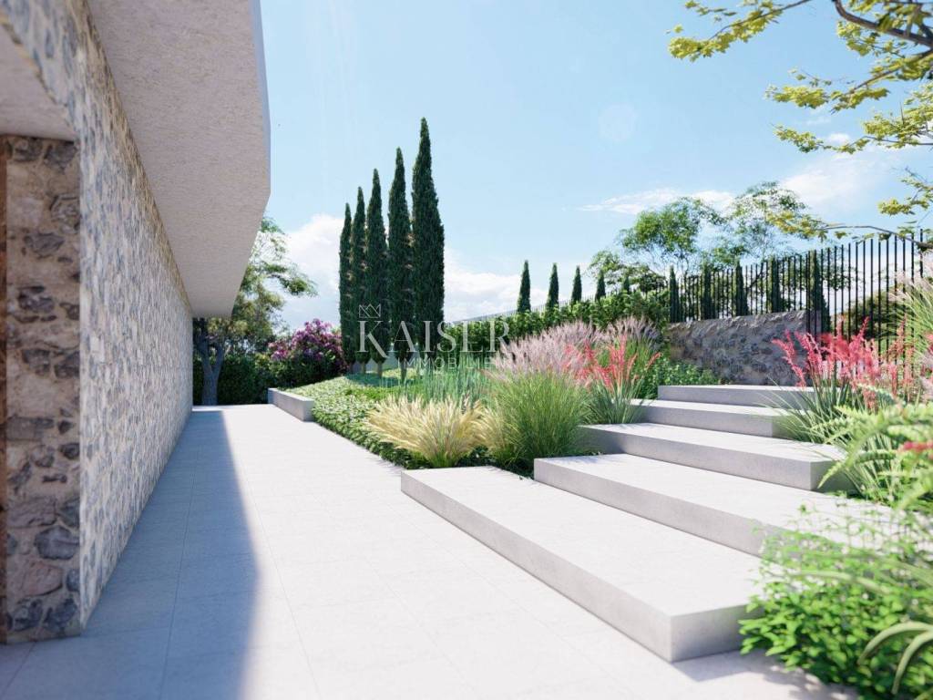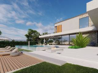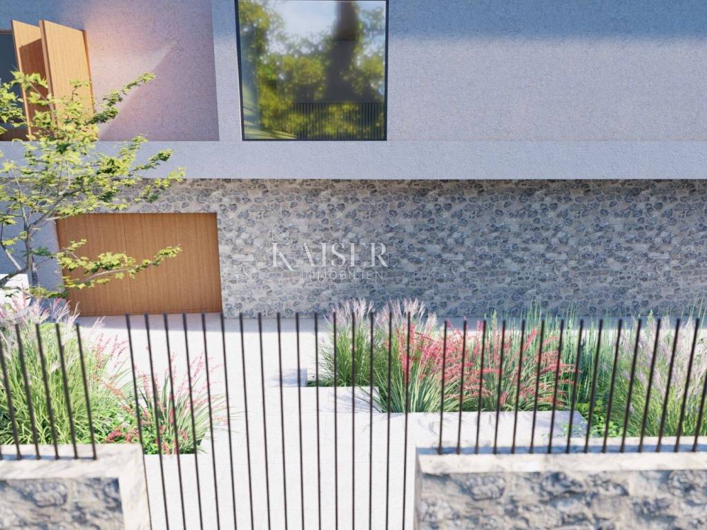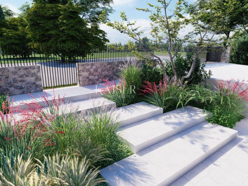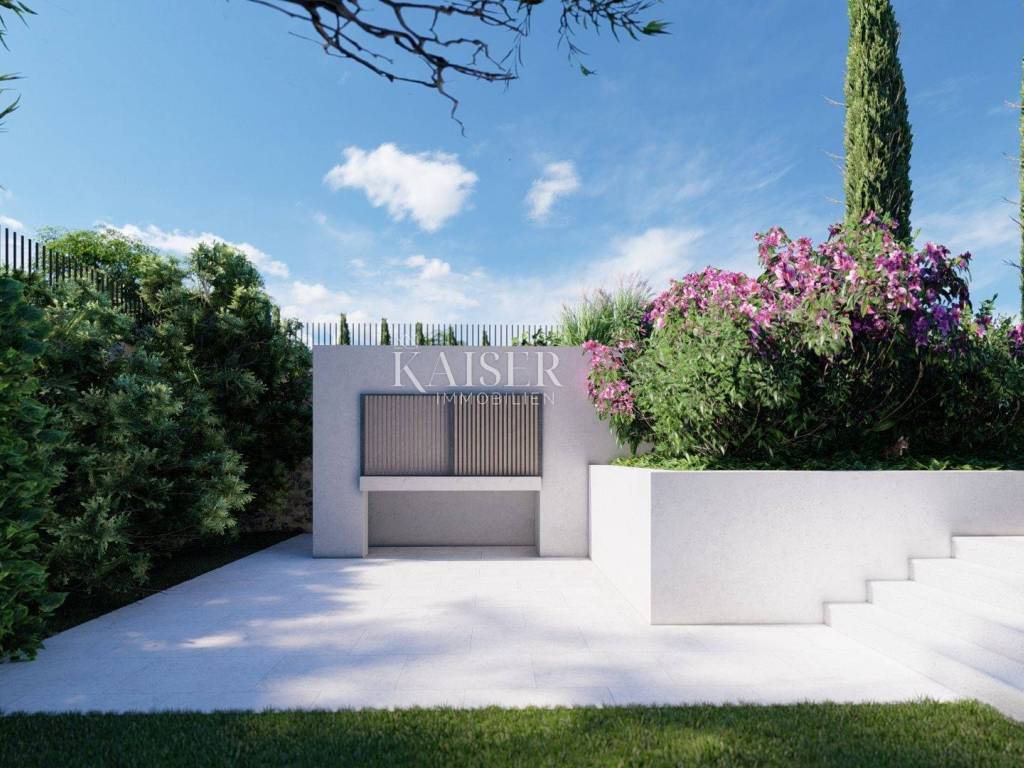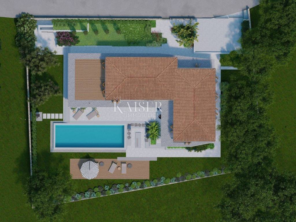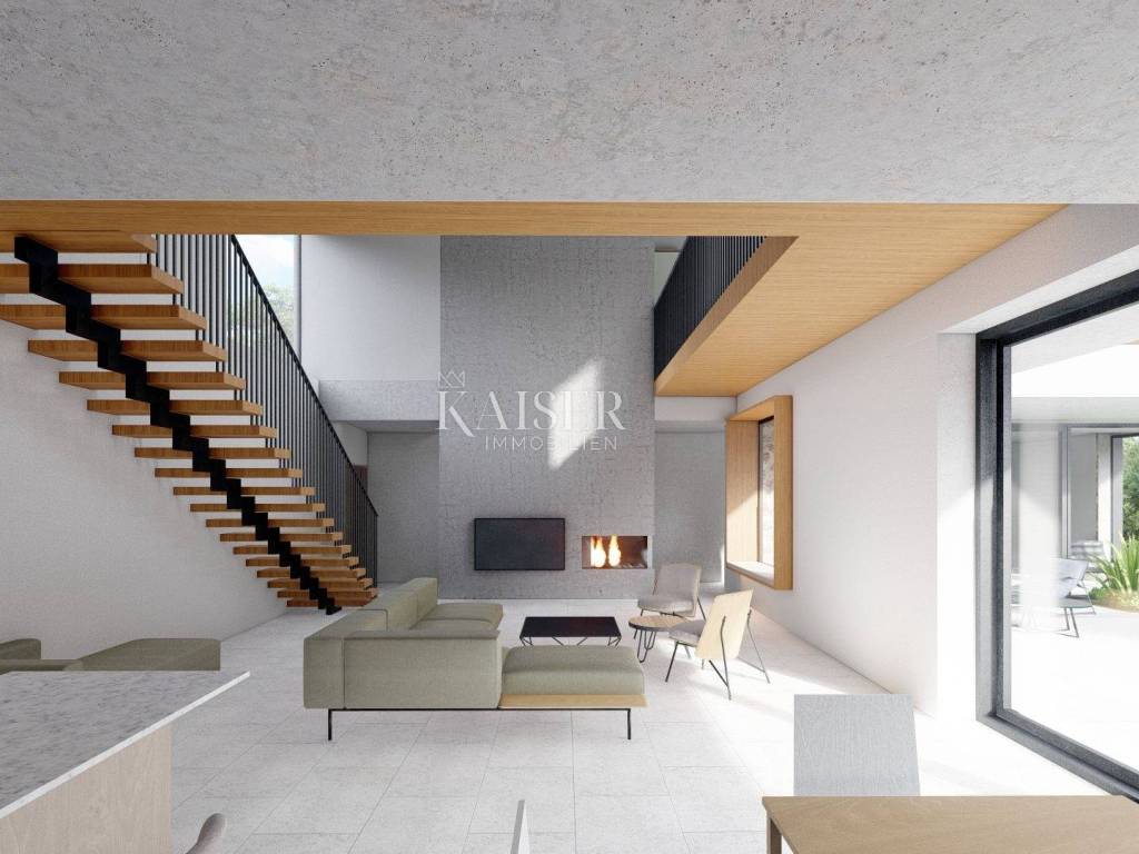 Kaiser Immobilien presents a new luxury property on the market, only 13 km from the city of Poreč. The property is located in a beautiful autochthonous Istrian town, very popular for the construction of villas and similar facilities. The property is located on a plot of 1100 m2, and the size of the property itself is 380 m2 gross. The shape of the property is designed in the shape of the letter L, with an outdoor pool in the middle that overflows on 2 sides. The size of the pool is 54m2. The property consists of a ground floor and a first floor and offers you a wonderful view of nature, and given its position, it is located in a very peaceful and quiet natural environment. On the ground floor of the property there is a spacious comfortable living room with a kitchen and a dining room. While upstairs there are 4 spacious bedrooms, each with its own bathroom, approx. 30m2. Due to the spacious high-quality windows, the view from the bedrooms is guaranteed to be relaxing and promising. Within the villa there is also a game room for enjoying your free time and wellness, which consists of a sauna and a shower. This beautiful villa really offers you different opportunities to relax and enjoy beautiful Istria and untouched nature. The villa is heated via a heat pump together with underfloor heating. The villa also has solar collectors for heating water and a water softening system that solves the problem of scale. The floors are finished with micro cement. This beautiful modern prefab villa is equipped with high quality and premium materials. Careful attention is paid to every detail that would be useful to the future owner. The villa is sold fully equipped with all its furniture, and the planned completion of construction is the end of 2023 or the beginning of 2024.