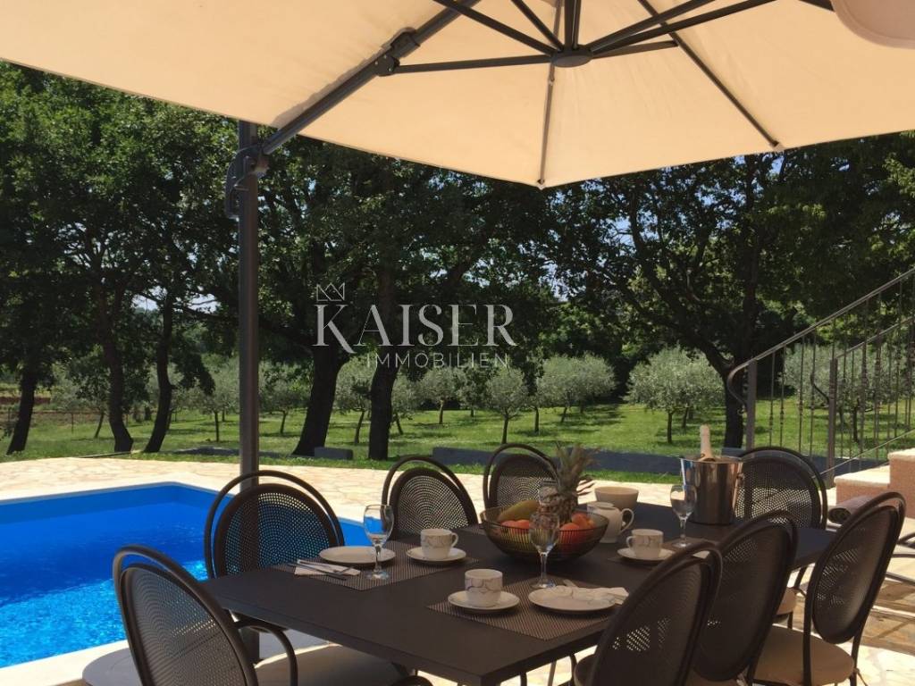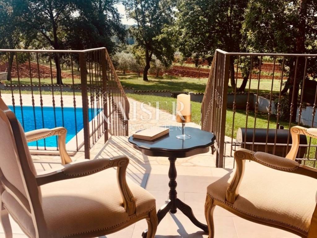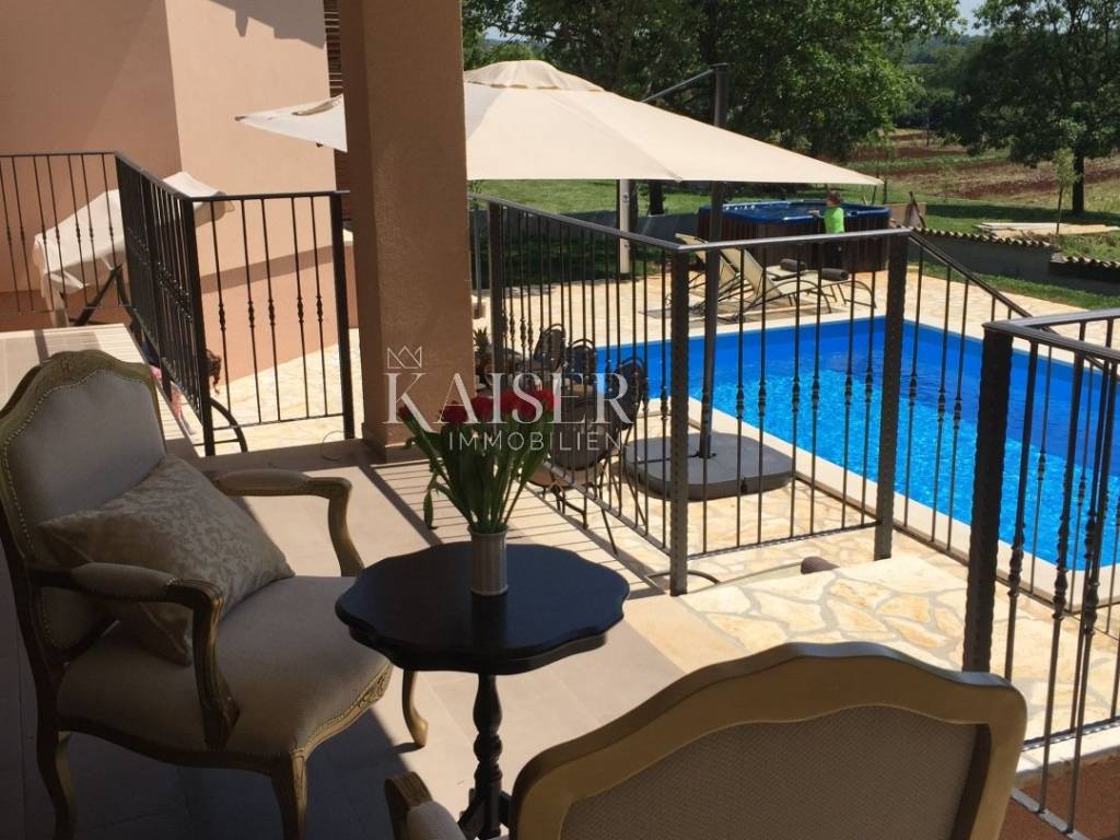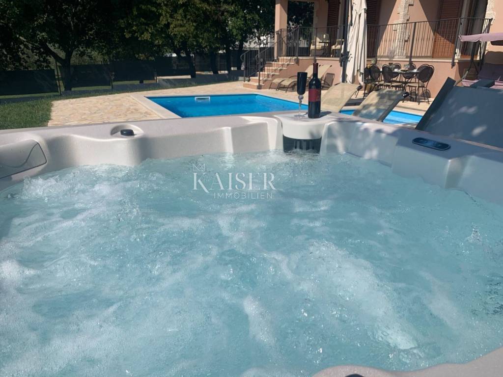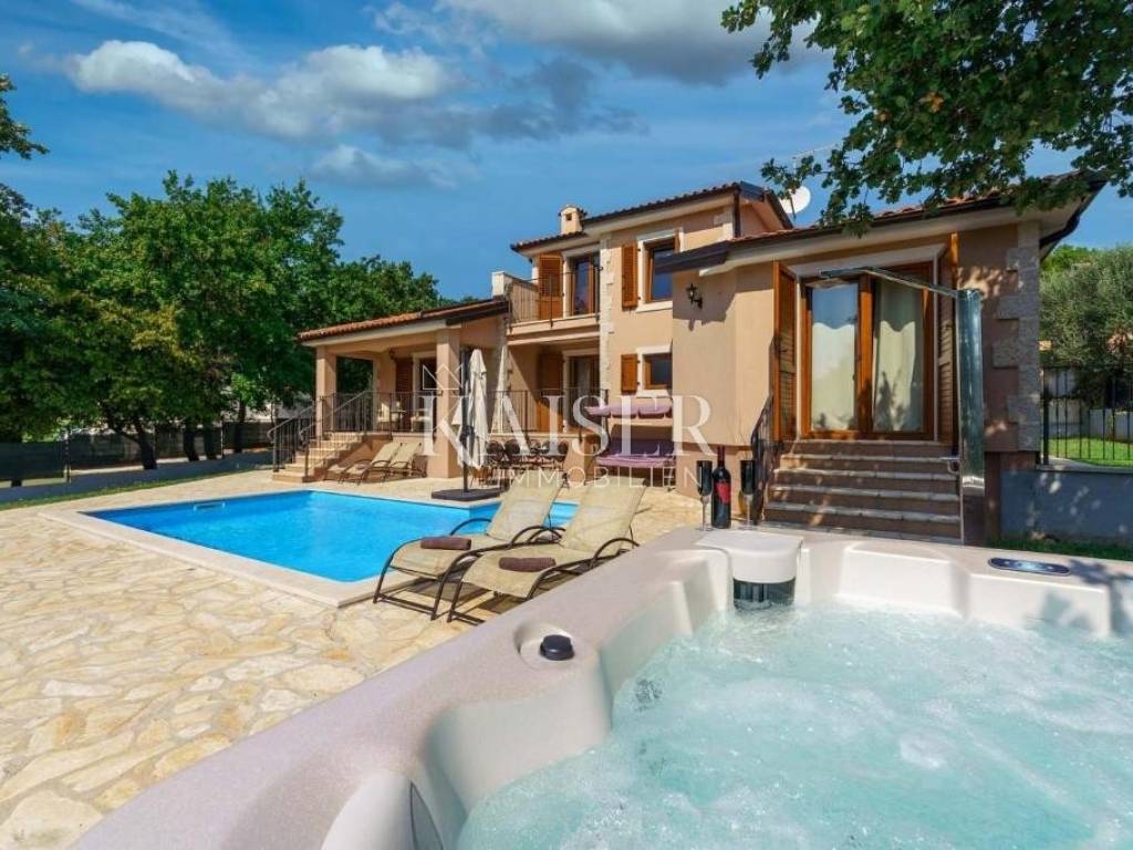 Kaiser Immobilien offers for sale a beautiful rustic villa only 4 km from the sea. The villa is located on its own unique plot, separated from the city crowd, in a small area near the city of Poreč, to be precise, only 6 km from the center of the city of Poreč. On the ground floor of the villa there are two bedrooms, each with its own bathroom, a modernly equipped living room with a fireplace, a kitchen, a dining room and another smaller toilet. The lower part of the villa provides access to the outdoor covered terrace and a beautiful view of the pool and nature. On the first floor of the house there are two more bedrooms that share one larger bathroom. One room opens onto an outdoor terrace. In the courtyard of the villa there is a swimming pool of 24 m2, a terrace for sunbathing and relaxing with an outdoor shower, a jacuzzi for 5 people, a barbecue, and 3 parking spaces. The entire yard around the villa, i.e. the entire garden, is completely decorated with botany specific to this part of Istria, with a beautiful lawn and beautiful plants. The place is small, autochthonous, and offers an oasis of peace and enjoyment and an escape from the everyday hustle and bustle. If you want this beautiful fully equipped villa to become your new home, contact the Kaiser Immobilien agency.
