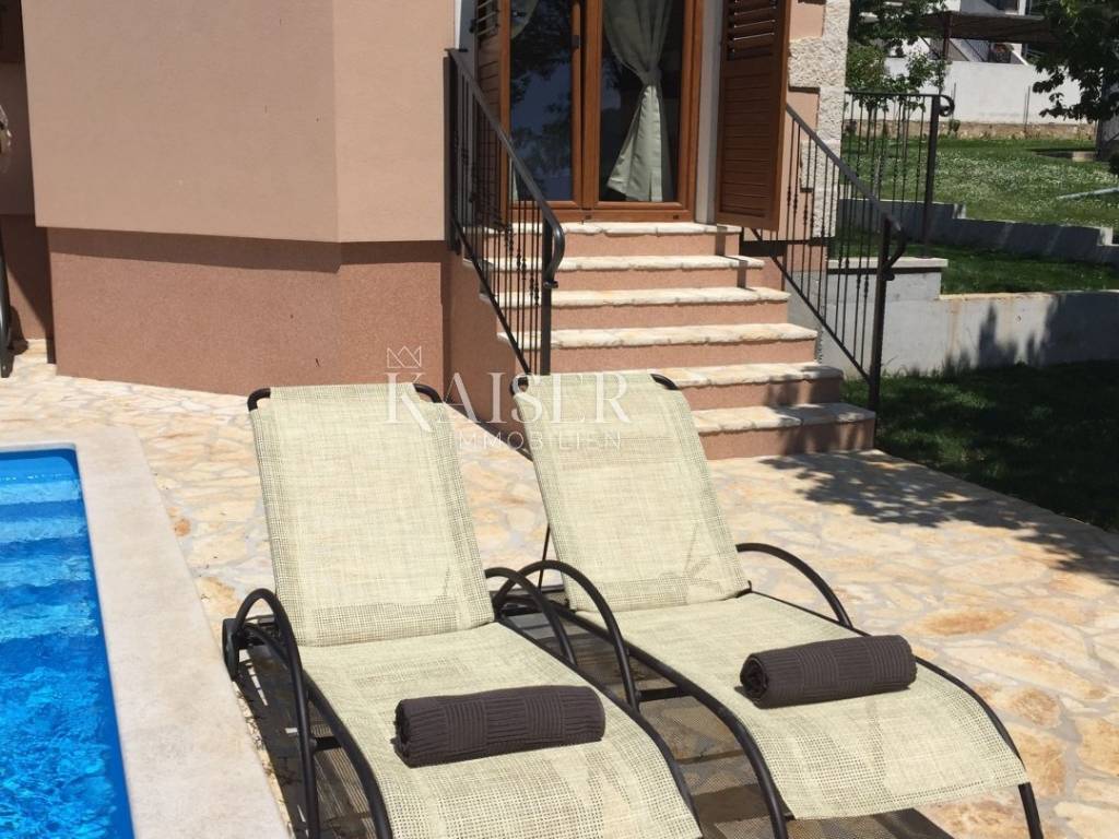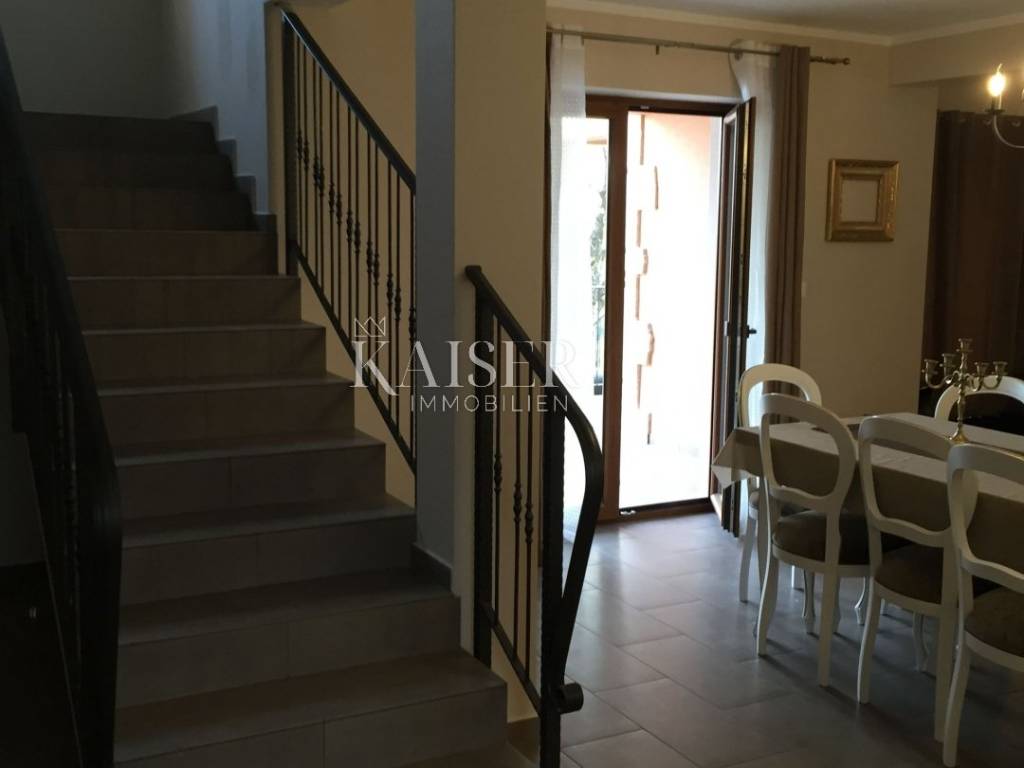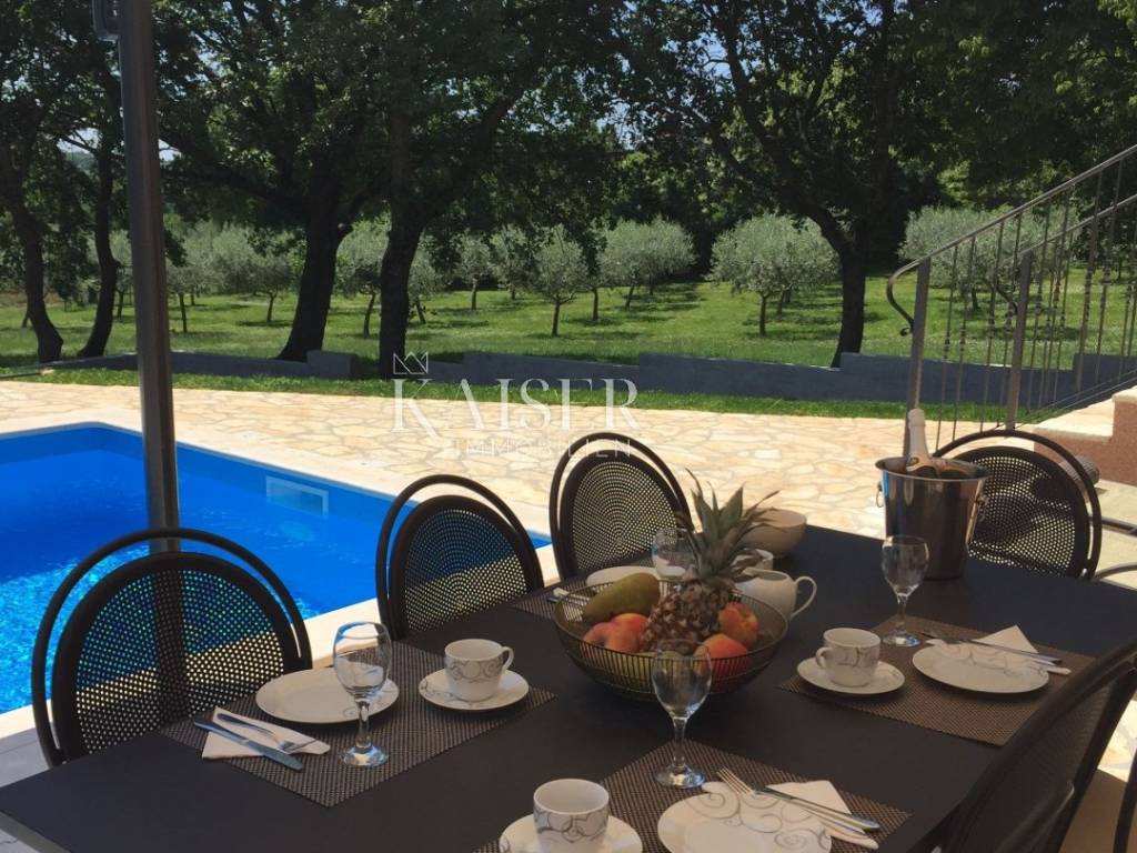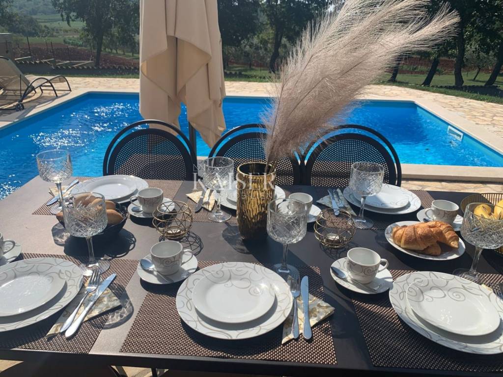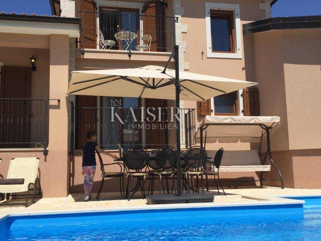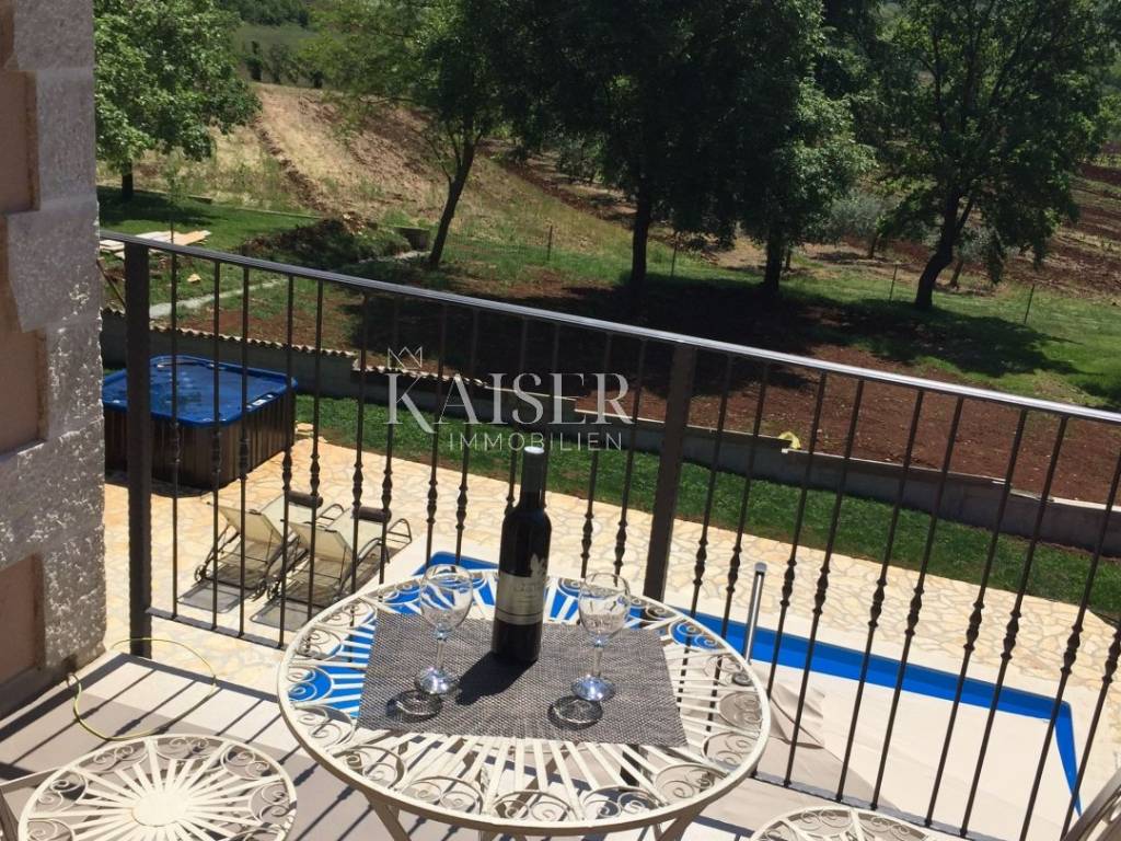 Kaiser Immobilien offers for sale a beautiful rustic villa only 4 km from the sea. The villa is located on its own unique plot, separated from the city crowd, in a small area near the city of Poreč, to be precise, only 6 km from the center of the city of Poreč. On the ground floor of the villa there are two bedrooms, each with its own bathroom, a modernly equipped living room with a fireplace, a kitchen, a dining room and another smaller toilet. The lower part of the villa provides access to the outdoor covered terrace and a beautiful view of the pool and nature. On the first floor of the house there are two more bedrooms that share one larger bathroom. One room opens onto an outdoor terrace. In the courtyard of the villa there is a swimming pool of 24 m2, a terrace for sunbathing and relaxing with an outdoor shower, a jacuzzi for 5 people, a barbecue, and 3 parking spaces. The entire yard around the villa, i.e. the entire garden, is completely decorated with botany specific to this part of Istria, with a beautiful lawn and beautiful plants. The place is small, autochthonous, and offers an oasis of peace and enjoyment and an escape from the everyday hustle and bustle. If you want this beautiful fully equipped villa to become your new home, contact the Kaiser Immobilien agency.