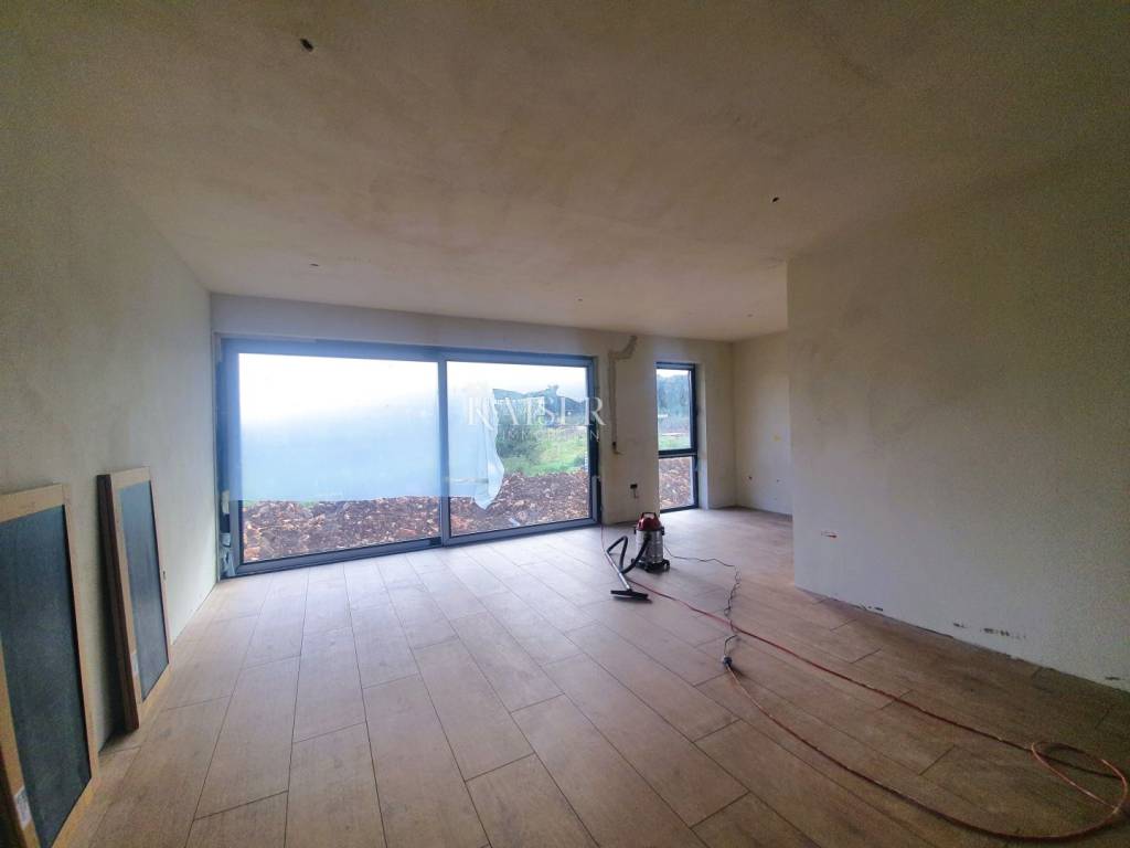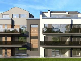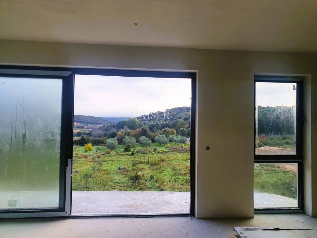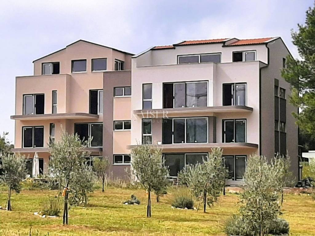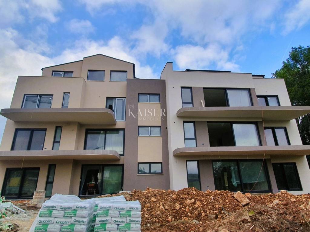 Kaiser Immobilien presents a brand new modern apartment on the first floor of a residential building. The building consists of a ground floor and three floors, and is located on the very beautiful edge of untouched nature, forest, gardens and olive groves, which are a green zone and will no longer be built on. This settlement consists of several residential units, not far from the very center of Rovinj, yet in its peaceful and natural oasis and only 200 meters from the sea and the first beautiful popular beaches. The apartment is under construction, as is the entire building, and it is planned to be completed by June 2024. This beautiful new modern apartment in its contents will have 2 bedrooms, 2 bathrooms and a spacious and light-filled living room, kitchen and dining room. Within the apartment there are as many as 3 exit terraces, two on the first side of the building and one large and spacious terrace on the back side that connects the living room with the bedroom. The apartment will be heated using underfloor heating and will have two more air conditioners. The apartment has a part that will be used as a storage room and a space in the basement that can be used for storing things or for some other purpose. The apartment is sold with installed ceramics, furnished bathrooms with sanitary facilities and furnished balconies. In the project of the apartment, the balconies are closed with glass fences, that part is being changed, due to the fact that glass is quite difficult to maintain, and a new project has been made that shows that instead of glass, a metal fence will be placed on the balconies with rods placed vertically and quite densely arranged, very modern and designer., visible in the photo gallery. At the planned completion, it is planned to install an elevator that will connect all floors in the entire building. For the drainage system of water from the sewage system, a separate septic tank will currently be used for the entire building, and the city of Rovinj plans to install a public sewage system in 3 to 4 years. The building in which the apartment is located consists of a total of two connected buildings with the same arrangement of apartments. The apartment has a beautiful view of the village on one side and the nature on the back. Right next to the apartment there is a pine forest and walking paths for spending time in nature. Considering that the apartment is made with large windows with glass walls, the apartment has a lot of light and sun all day on sunny days, and this is especially important in winter when you can save a lot on heating because of the sun. This apartment is ideal for living or for a tourist investment in the form of renting in the summer season because the beaches and the sea are very close. If you want this wonderful new apartment to become your new home, contact the Kaiser Immobilien agency
