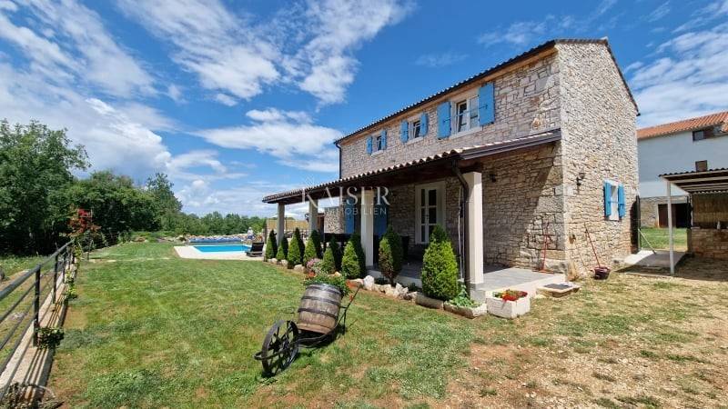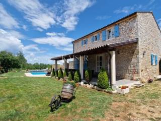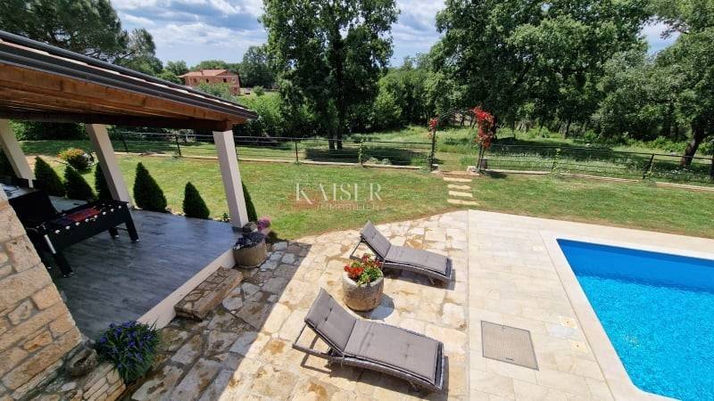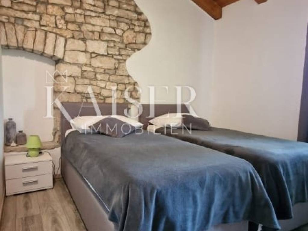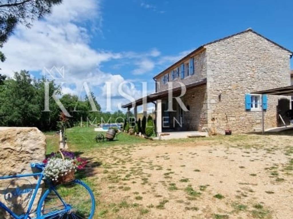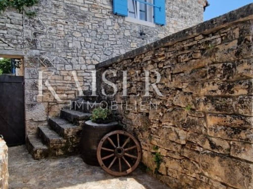 Kaiser Immobilien presents a beautiful Istrian autochthonous stone house, on the edge of a small Istrian village with its property in nature. The house is spread over a property of 7000 m2. The house was built in the traditional Istrian style with the addition of modern elements. It is located on its own unique plot, which is connected to a large estate in the form of a forest, a promenade, a meadow, hilly and flat terrain. As such, the property offers various possibilities of use for sports purposes, agricultural cultivation or simply just enjoying pure, untouched nature. Complete privacy of enjoyment is offered. The house consists of a ground floor and an upper floor, on the ground floor there is a kitchen, dining room and living room, while on the upper floor there are 3 bedrooms and a large bathroom. Decorated with a combination of modern and traditional. The exterior of the house is decorated with large stone terraces, and another covered terrace with an outdoor kitchen and barbecue is attached to more than one side of the house. Necessary amenities such as shops, post office, school, kindergarten, pharmacy, pizzeria, restaurant, coffee bar are only about 2 km from the property. In this case of sale, there are two possibilities of sale. Namely, the property consists of 12 plots and a house, the seller offers for 730,000.00 Euro a house with agricultural plots that make up a property of 7000 m2, or the whole property, and that's it. house with a property of approx. 9000m2, one part of which is for construction, and they contain two more legalized buildings that can be built, the whole would amount to 940,000.00 Euros. In addition to the house, there are 2 more legalized buildings on the property, namely another house that is habitable, with all the elements, however, adaptation is needed, and another demolished building, however, legalized for construction. Therefore, the property offers different housing options. If you see yourself in one of these two housing combinations on this property and want this property to become your new home, contact the Kaiser Immobilien agency. The commission of the agency for the buyer is 3% + VAT and is paid in case of real estate purchase, when the first legal deed is concluded.