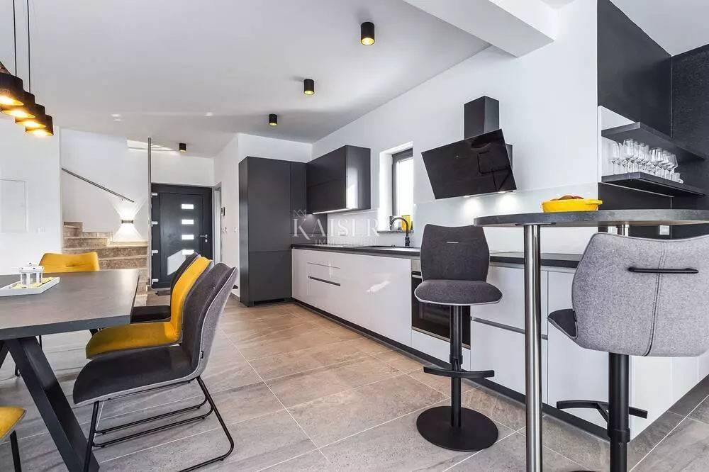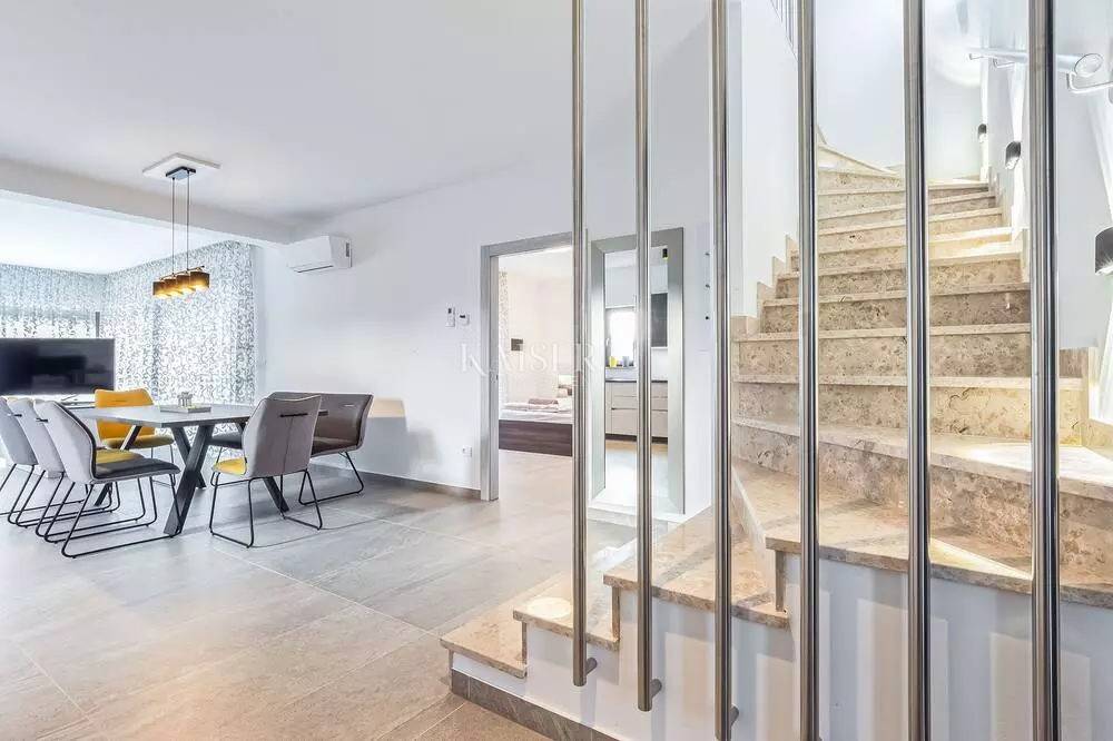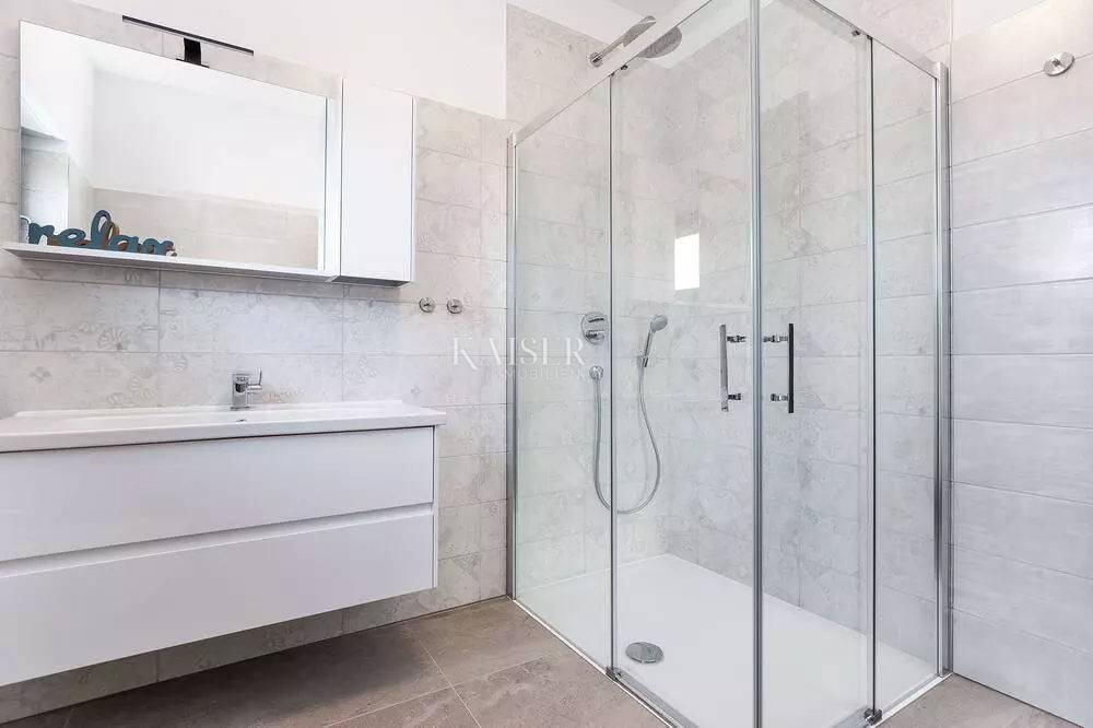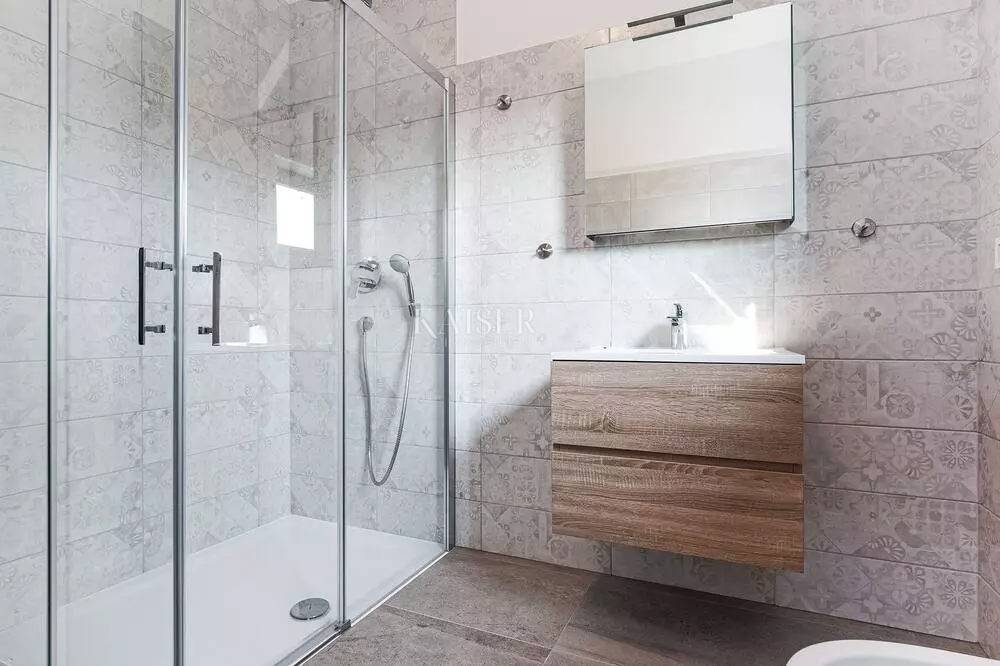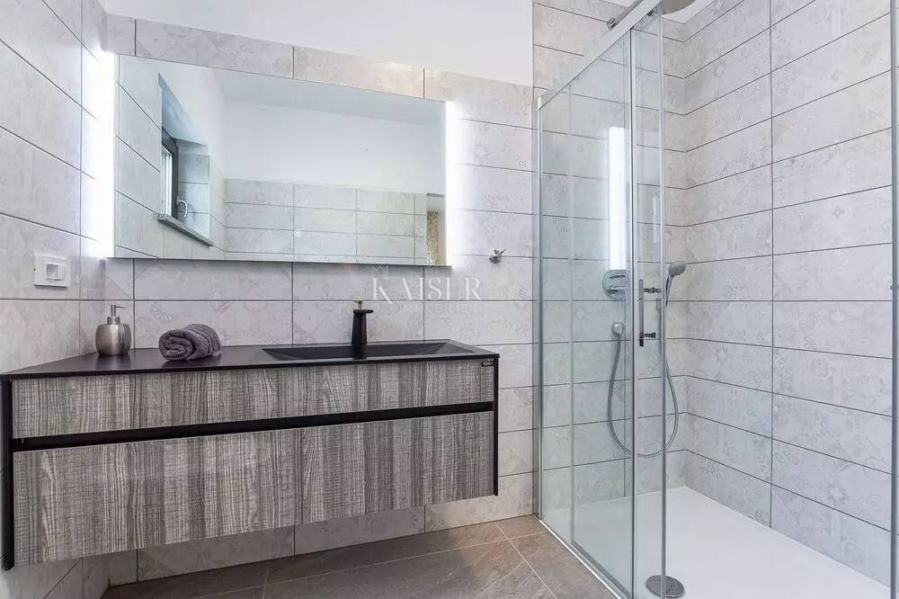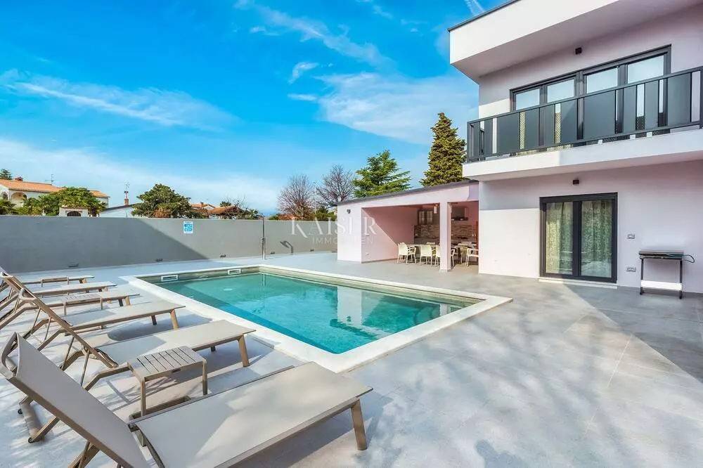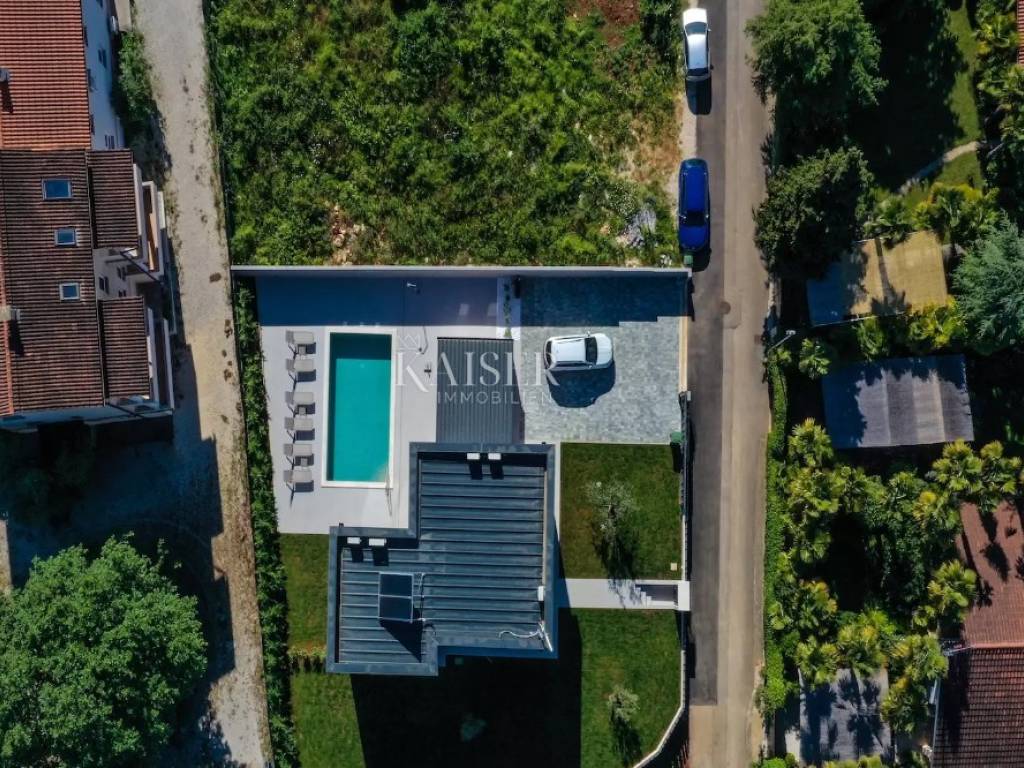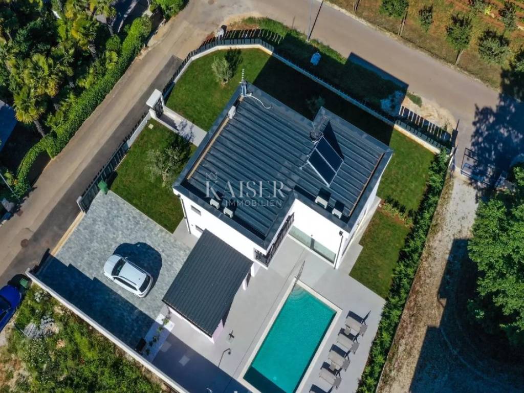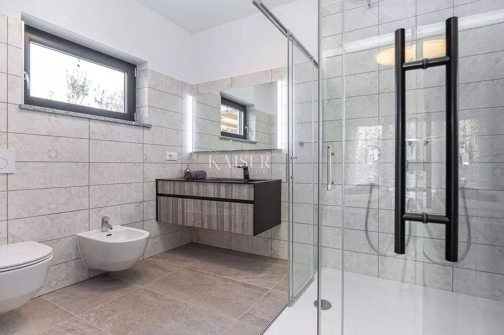 Kaiser Immobilien represents a true beauty among villas located only 800 m from the sea in the town of Poreč. The villa is sold fully equipped with all its contents. This beautiful villa built as a detached building on two floors in a quiet area of the city of Poreč. The villa consists of 4 bedrooms and 4 bathrooms, each belonging to its own bedroom. All bedrooms are air-conditioned and have TVs in the rooms. Three bedrooms are located on the first floor of the villa, while one bedroom is located on the ground floor. On the ground floor of the villa there is a kitchen, a dining room and a living room. The whole concept of the interior is based on a lot of light, since the villa is made with wide carpentry that gives a lot of light throughout the day. The villa was built to a very high quality and modern, and every detail and the needs of the new owners were taken care of. In this sense, the carpentry of the villa is three-layer, which absolutely does not let in noise, and there are electric blinds and mosquito nets on the windows. The villa is heated by a floor heating system via Viesmann heat pumps, while the rooms also have their own air conditioners. The villa is equipped with high-quality furniture, all custom-made by certified carpenters. The roof of the villa is made of aluminum sheet where there are also solar panels for heating water. The facade of the villa is made of 10 cm thick anthracite. There are alarm sensors on the entire carpentry of the villa. Outside the villa there is a lawn with an irrigation system, while one part is paved where you can park up to 4 vehicles. The size of the pool of the villa is 8x4, the pool is heated and made of material kurir. The edge of the pool is lined with Brač stone, which is known above all as a very solid, high-quality and long-lasting stone. Right next to the pool there is a shower for additional refreshment, and a very walkable, comfortable area around the pool for swimming and sunbathing. There is an outdoor toilet nearby. In the courtyard of the villa, there is an outdoor kitchen with a barbecue and all the elements that will make enjoying summer days and warm evenings even more beautiful. The villa is located only 800 m from the sea, and is close to all necessary amenities. The whole village as well as the beach can be visited on foot or by bicycle, everything is very close and that is exactly what gives this wonderful villa its special charm. If you want this beautiful villa in a wonderful location to become your new home, contact the agency Kaiser Immobilien Poreč. The commission of the agency for the buyer is 3% + VAT and is paid in case of real estate purchase, when the first legal deed is concluded.