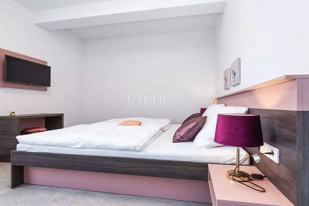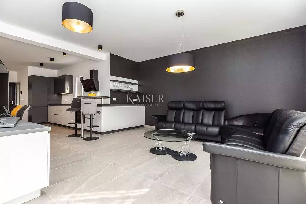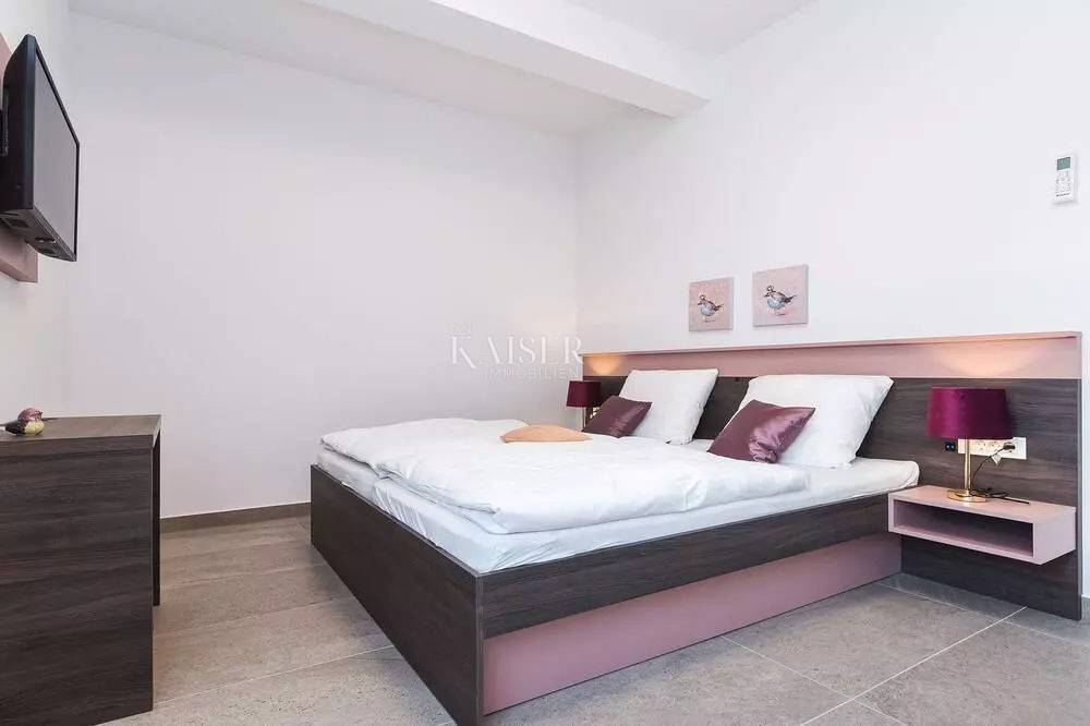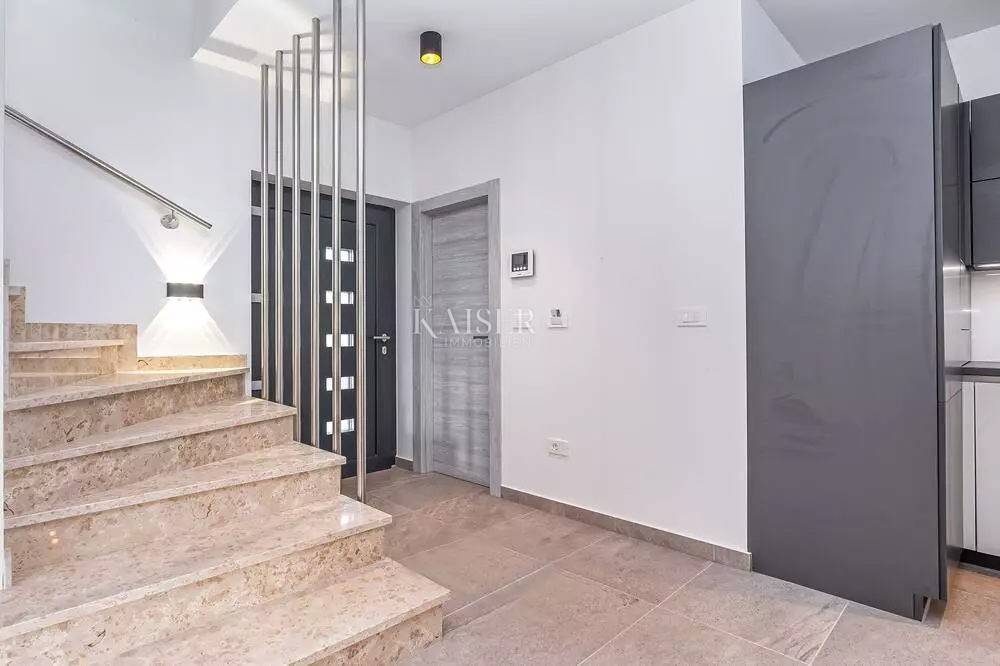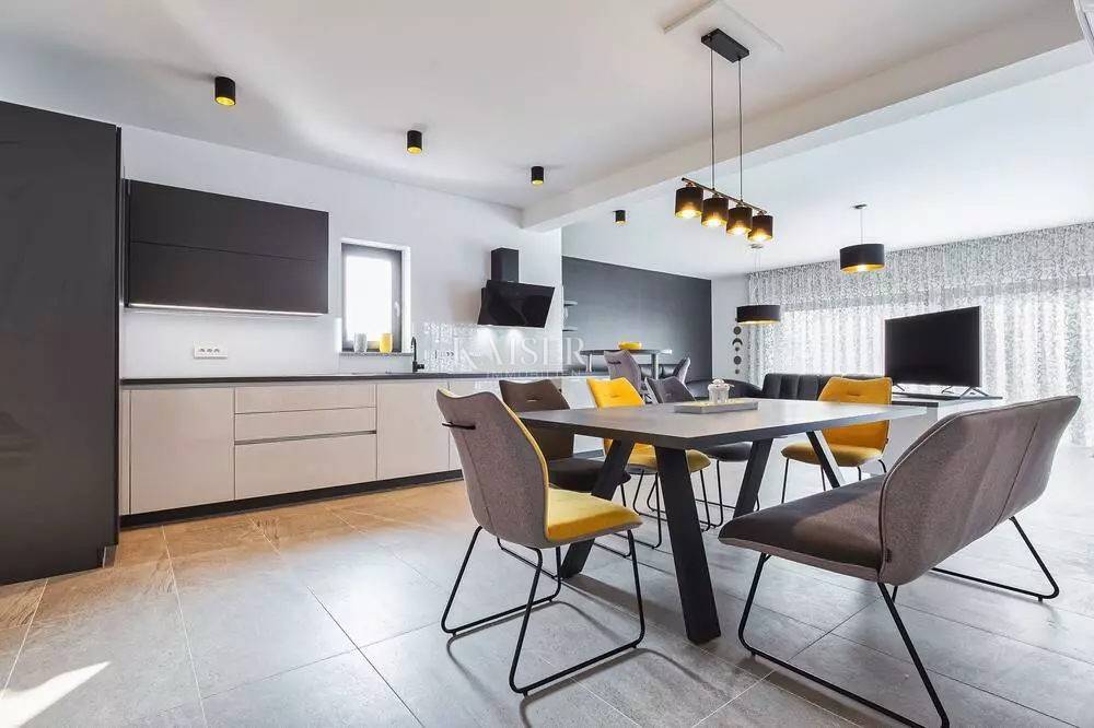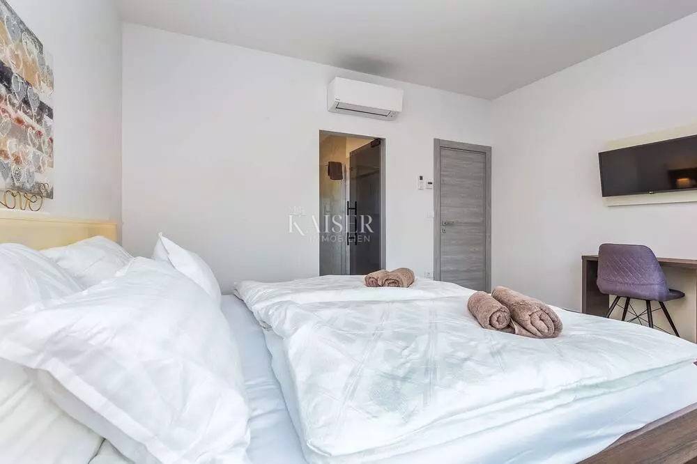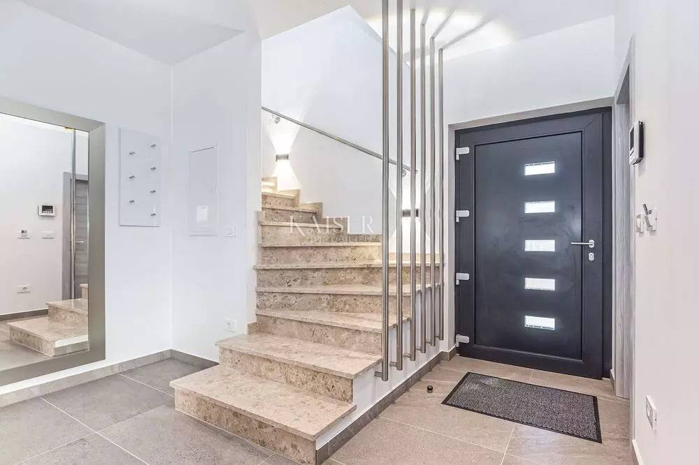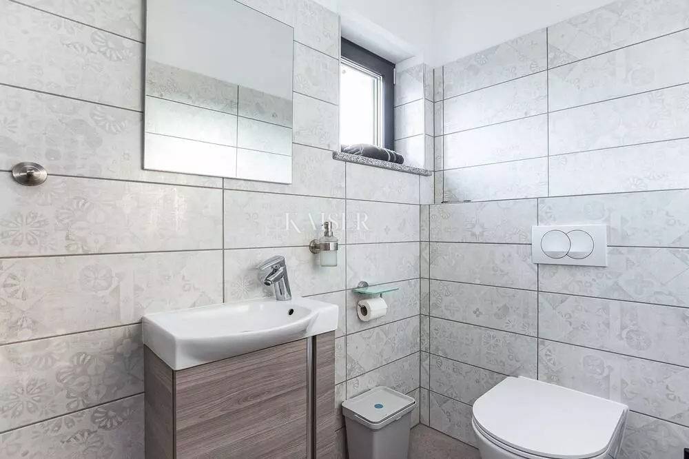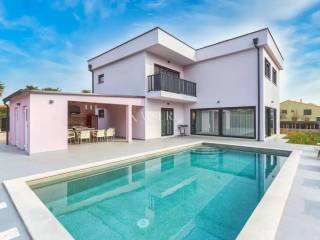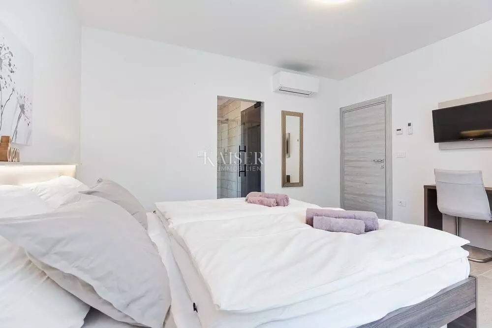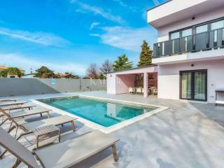 Kaiser Immobilien represents a true beauty among villas located only 800 m from the sea in the town of Poreč. The villa is sold fully equipped with all its contents. This beautiful villa built as a detached building on two floors in a quiet area of the city of Poreč. The villa consists of 4 bedrooms and 4 bathrooms, each belonging to its own bedroom. All bedrooms are air-conditioned and have TVs in the rooms. Three bedrooms are located on the first floor of the villa, while one bedroom is located on the ground floor. On the ground floor of the villa there is a kitchen, a dining room and a living room. The whole concept of the interior is based on a lot of light, since the villa is made with wide carpentry that gives a lot of light throughout the day. The villa was built to a very high quality and modern, and every detail and the needs of the new owners were taken care of. In this sense, the carpentry of the villa is three-layer, which absolutely does not let in noise, and there are electric blinds and mosquito nets on the windows. The villa is heated by a floor heating system via Viesmann heat pumps, while the rooms also have their own air conditioners. The villa is equipped with high-quality furniture, all custom-made by certified carpenters. The roof of the villa is made of aluminum sheet where there are also solar panels for heating water. The facade of the villa is made of 10 cm thick anthracite. There are alarm sensors on the entire carpentry of the villa. Outside the villa there is a lawn with an irrigation system, while one part is paved where you can park up to 4 vehicles. The size of the pool of the villa is 8x4, the pool is heated and made of material kurir. The edge of the pool is lined with Brač stone, which is known above all as a very solid, high-quality and long-lasting stone. Right next to the pool there is a shower for additional refreshment, and a very walkable, comfortable area around the pool for swimming and sunbathing. There is an outdoor toilet nearby. In the courtyard of the villa, there is an outdoor kitchen with a barbecue and all the elements that will make enjoying summer days and warm evenings even more beautiful. The villa is located only 800 m from the sea, and is close to all necessary amenities. The whole village as well as the beach can be visited on foot or by bicycle, everything is very close and that is exactly what gives this wonderful villa its special charm. If you want this beautiful villa in a wonderful location to become your new home, contact the agency Kaiser Immobilien Poreč. The commission of the agency for the buyer is 3% + VAT and is paid in case of real estate purchase, when the first legal deed is concluded.
