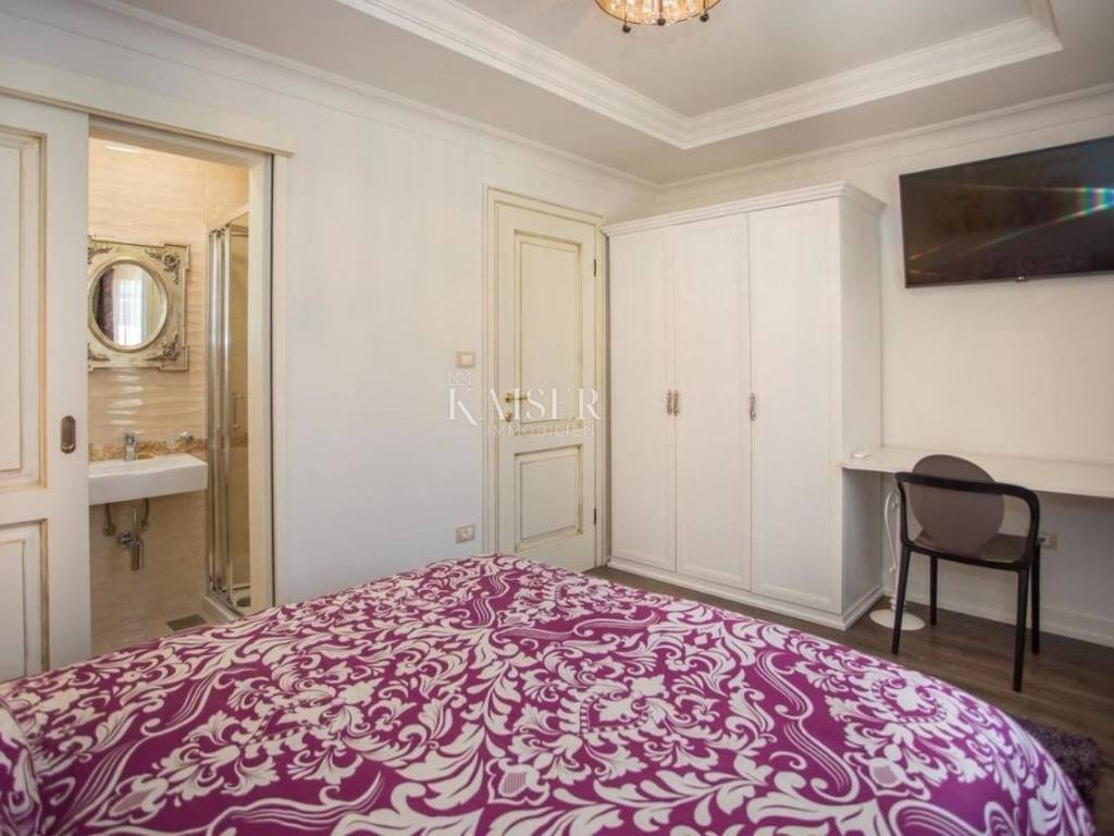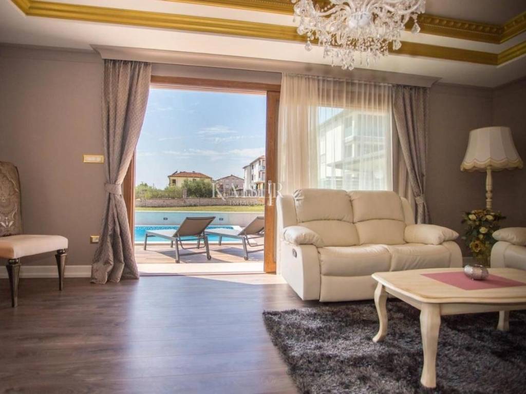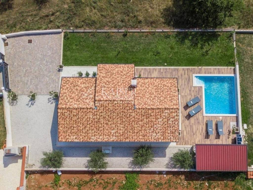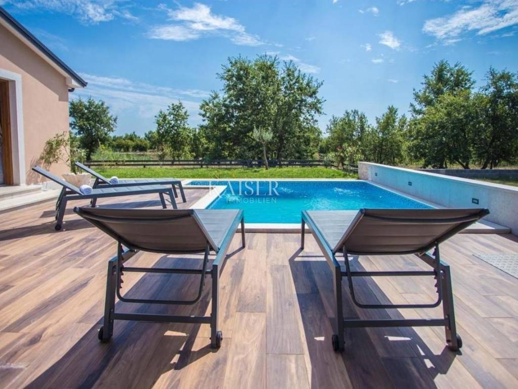 Kaiser Immobilien offers for sale a beautiful one-story house near the town of Poreč. On the West coast of Istria, near the largest vineyards and the best olive oils, near the city of Poreč and the most beautiful beaches, this charming one-story house with a swimming pool and a spacious garden is located. This beautiful modern house is located on an independent plot, in a small rural area, close to all the most important amenities for life, in complete privacy and comfort of life given its location. It has 85 m2 of residential square footage on a plot of 1063 m2. All the contents of living are arranged on the ground floor of the house, with plenty of sunlight and daylight penetrating through large glass walls. At the very entrance there is an entrance hall from which you enter the living room connected to the kitchen and dining room. The house has two bedrooms and two bathrooms. One bathroom belongs to one bedroom. The entire space is heated via air conditioning, and thanks to the glass walls, the space is constantly kept at a moderate temperature during sunny days. In the living room there is a fireplace that further beautifies the space, and there is a possibility of installing a pellet stove. The entire space is equipped with specially selected furniture, as well as additional modern lines and lights that give a special attractive appearance. The house is sold furnished. The terrace is decorated with a modern covered lounge area for dining and relaxing, where there is also a barbecue. The lawn is well maintained, as is the pool and the area around the pool. The special feature of the property is an additional part of the yard that is unused and offers the possibility of building another property if there is a need for it. This beautiful one-story house is rented out in the summer and offers the possibility of additional income. Distance of the property to the city: Poreč - Pula Airport, 45 km Poreč - Ljubljana, 162 km Poreč - Vienna, 544 km Poreč - Prague, 868 km Poreč - Munich, 565 km If you want this beautiful one-story house to become your new home, or is needed for touristic purposes in the form of renting., contact the agent on the phone number 00385 923782803, or on the email address: ivana@kaiser-immobilien.hr. Agency commission is 3% + VAT.