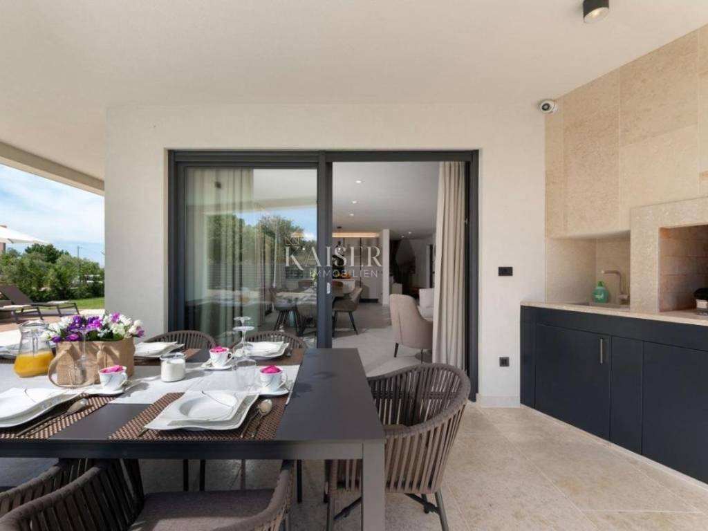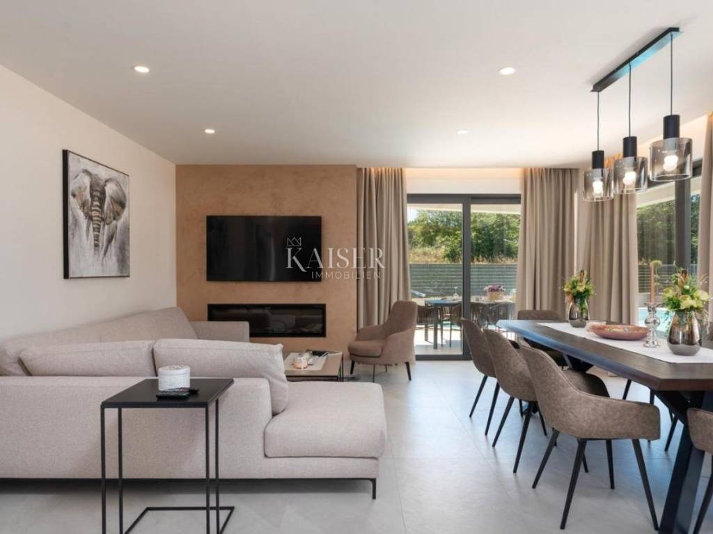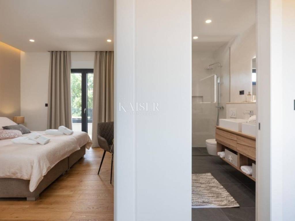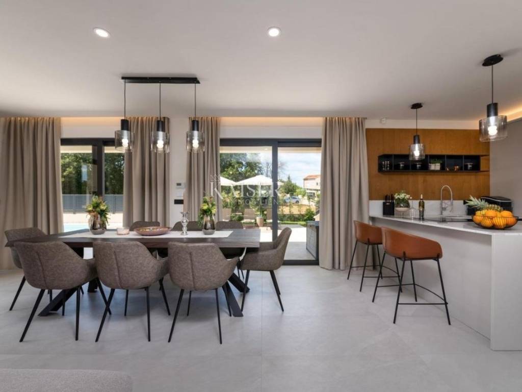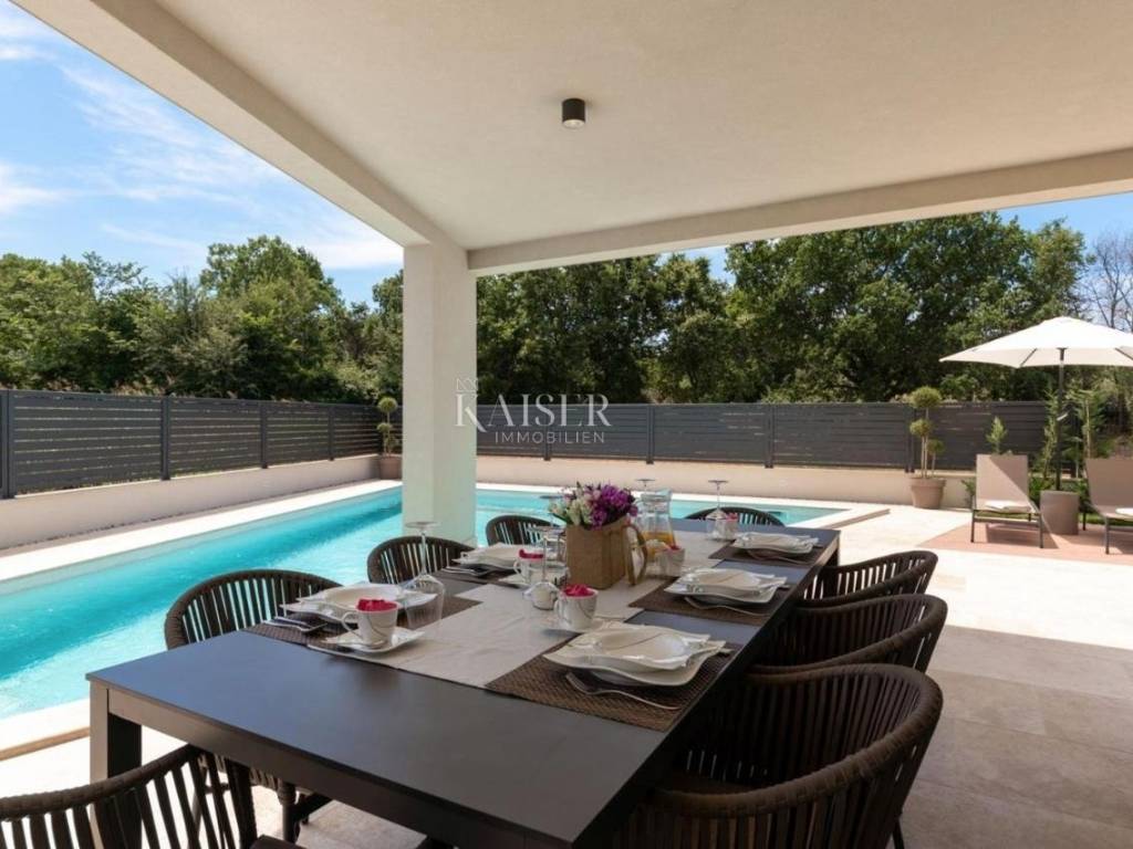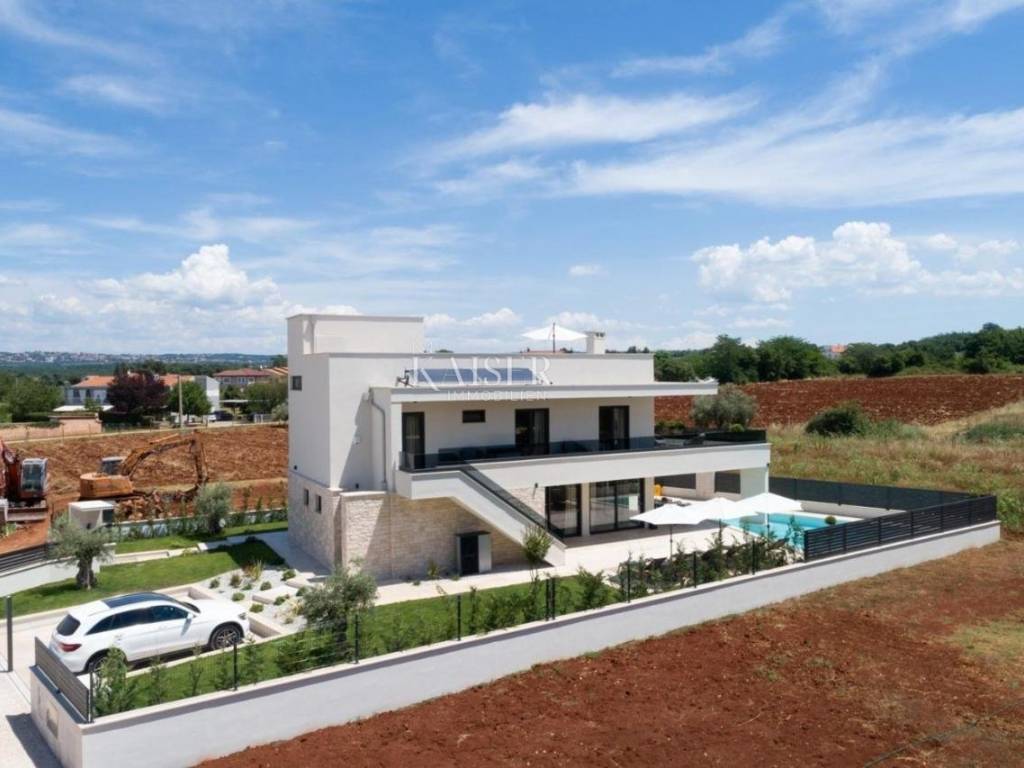 Kaiser Immobilien offers for sale a magnificent villa in a wonderful quiet location, only a few kilometers from the city of Poreč and the first beaches. The villa is located in a small Istrian rural area, where peace and relaxing everyday life reign, and with its very modern design, it fits well into the neighborhood and its appearance adorns the part of the village where it is located. In the sea of villas that are on the market today, it is difficult to design and build a villa that is completely different and that knocks you off your feet at first glance, and this is exactly what the owners of this beauty managed to do, and with great effort and careful selection of materials and design managed to create a beautiful house that attracts the eyes of passers-by. Every centimeter of the house and the garden that surrounds it has been carefully designed and decorated to the smallest detail, which is also visible in the pictures. The entire villa is equipped with carefully selected designer furniture and is sold as such, fully furnished. The villa consists of a ground floor and a first floor. The villa has three bedrooms, three bathrooms, a pantry, a living room, a dining room and a kitchen. Underfloor heating runs through the entire villa on the first floor, and the upper floor is heated with heat pumps and fan coils, and the rooms are additionally equipped with air conditioners. On the ground floor of the villa there is a kitchen, living room, dining room and pantry, as well as access to the lower covered terrace of 50 m2 and a swimming pool. There is also an outdoor kitchen in the part of the yard. We go up to the floor of the villa by internal or external stairs, where there are three bedrooms, one master bedroom has its own bathroom, while the remaining two bedrooms share one bathroom. All three rooms have access to the outdoor terrace of 70 m2, which offers a wonderful panoramic view of the sea and the village. There are two parking spaces within the villa. The pool of the villa has a very modern design and contains salt water. From the floor of the villa there is a wonderful view of the sea, which is only a few kilometers away. The property is sold fully furnished. Distance of the property to the city: Poreč - Pula Airport, 45 km Poreč - Ljubljana, 162 km Poreč - Vienna, 544 km Poreč - Prague, 868 km Poreč - Munich, 565 km If you want this new, modern villa to become your new home. , contact the agent at phone number 00385 923782803, or at the email address: ivana@kaiser-immobilien.hr. Agency commission is 3% + VAT.