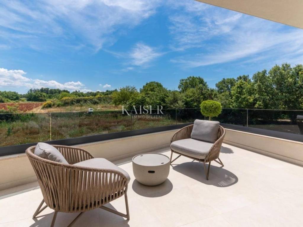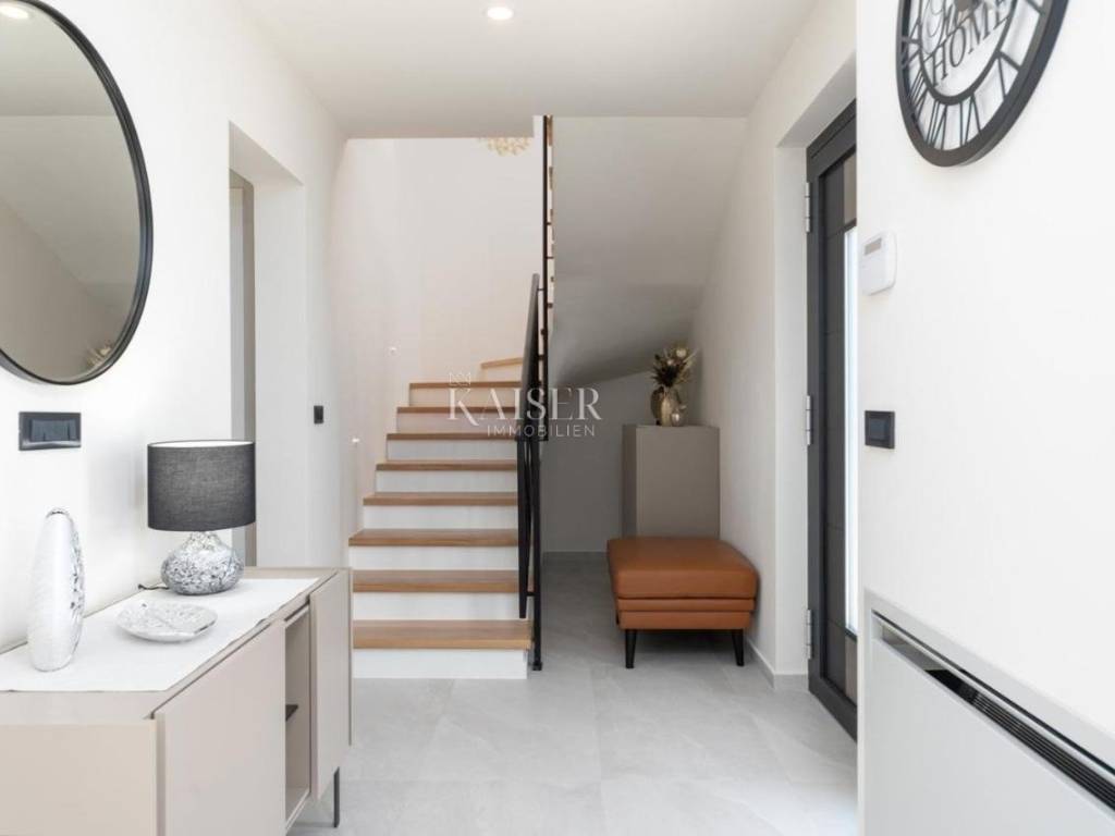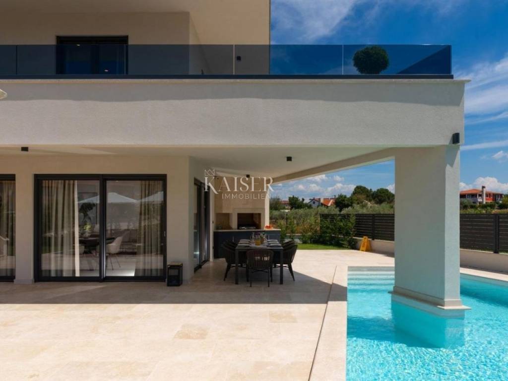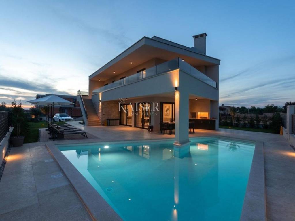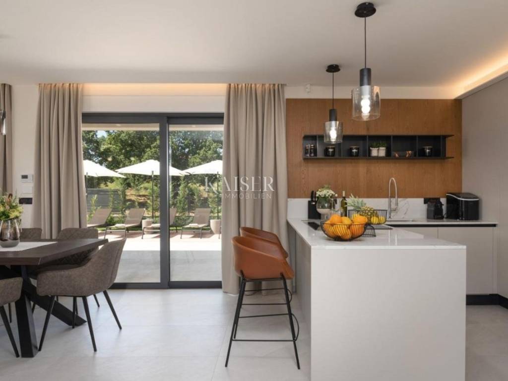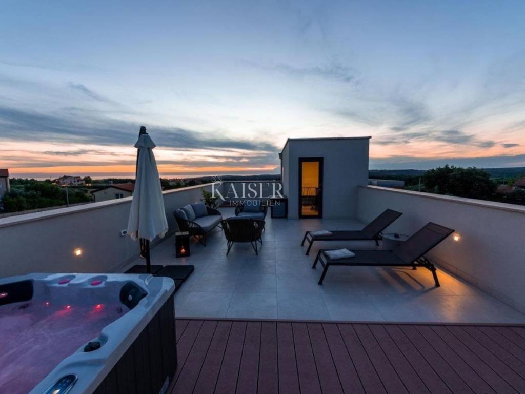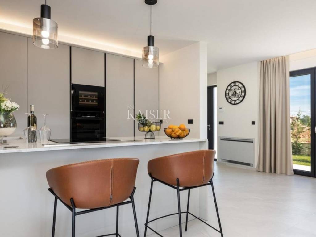 Kaiser Immobilien offers for sale a magnificent villa in a wonderful quiet location, only a few kilometers from the city of Poreč and the first beaches. The villa is located in a small Istrian rural area, where peace and relaxing everyday life reign, and with its very modern design, it fits well into the neighborhood and its appearance adorns the part of the village where it is located. In the sea of villas that are on the market today, it is difficult to design and build a villa that is completely different and that knocks you off your feet at first glance, and this is exactly what the owners of this beauty managed to do, and with great effort and careful selection of materials and design managed to create a beautiful house that attracts the eyes of passers-by. Every centimeter of the house and the garden that surrounds it has been carefully designed and decorated to the smallest detail, which is also visible in the pictures. The entire villa is equipped with carefully selected designer furniture and is sold as such, fully furnished. The villa consists of a ground floor and a first floor. The villa has three bedrooms, three bathrooms, a pantry, a living room, a dining room and a kitchen. Underfloor heating runs through the entire villa on the first floor, and the upper floor is heated with heat pumps and fan coils, and the rooms are additionally equipped with air conditioners. On the ground floor of the villa there is a kitchen, living room, dining room and pantry, as well as access to the lower covered terrace of 50 m2 and a swimming pool. There is also an outdoor kitchen in the part of the yard. We go up to the floor of the villa by internal or external stairs, where there are three bedrooms, one master bedroom has its own bathroom, while the remaining two bedrooms share one bathroom. All three rooms have access to the outdoor terrace of 70 m2, which offers a wonderful panoramic view of the sea and the village. There are two parking spaces within the villa. The pool of the villa has a very modern design and contains salt water. From the floor of the villa there is a wonderful view of the sea, which is only a few kilometers away. The property is sold fully furnished. Distance of the property to the city: Poreč - Pula Airport, 45 km Poreč - Ljubljana, 162 km Poreč - Vienna, 544 km Poreč - Prague, 868 km Poreč - Munich, 565 km If you want this new, modern villa to become your new home. , contact the agent at phone number 00385 923782803, or at the email address: ivana@kaiser-immobilien.hr. Agency commission is 3% + VAT.