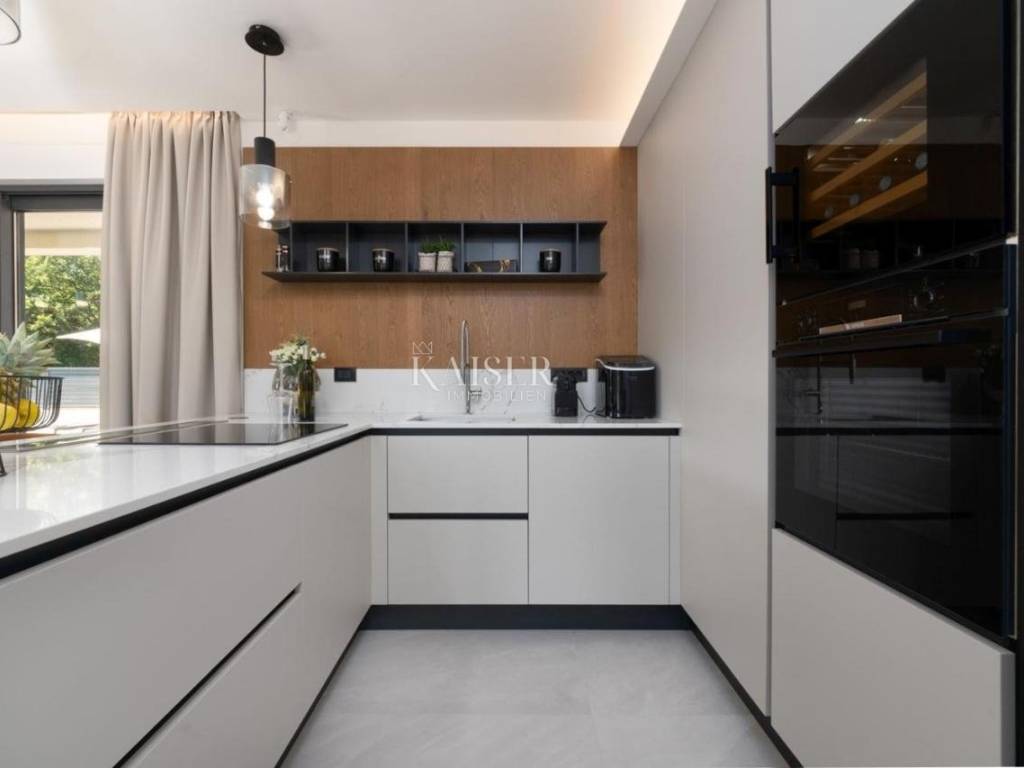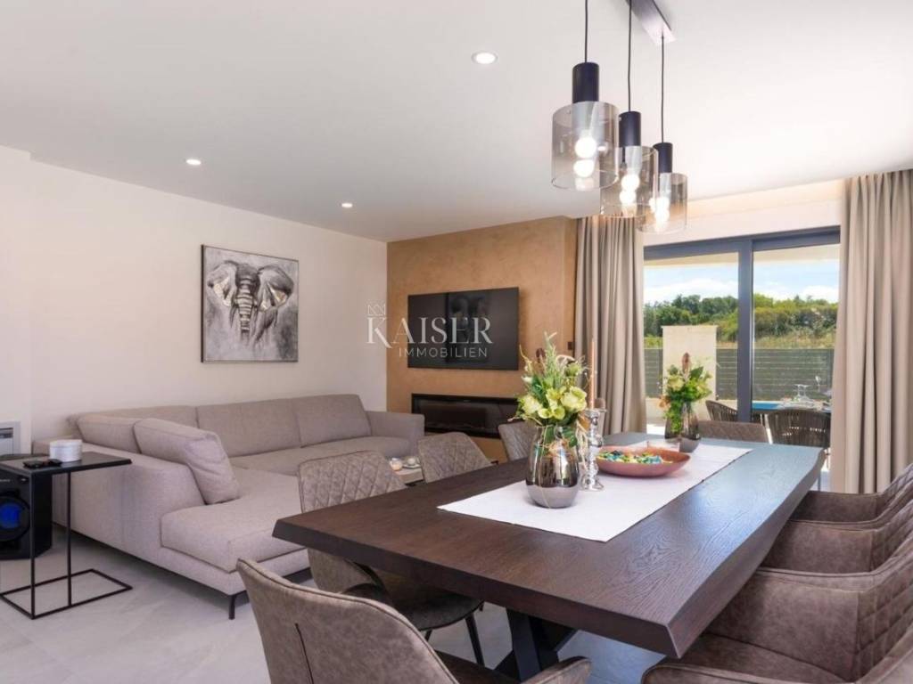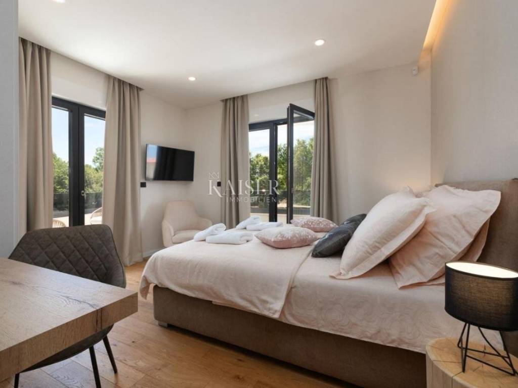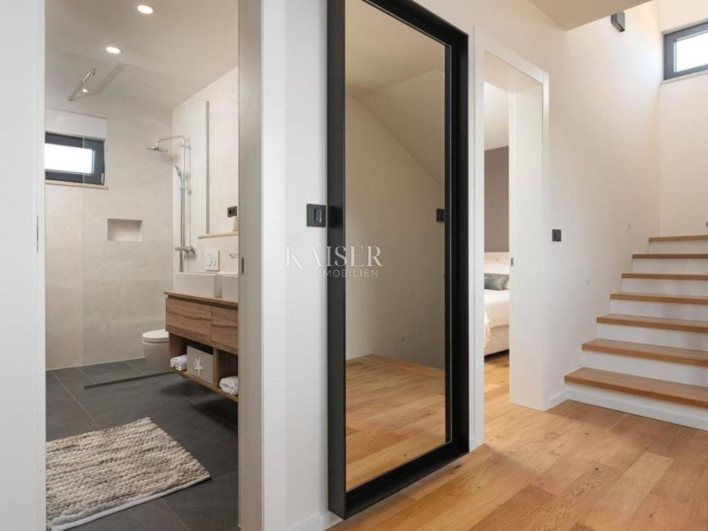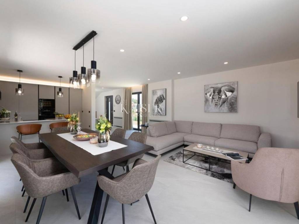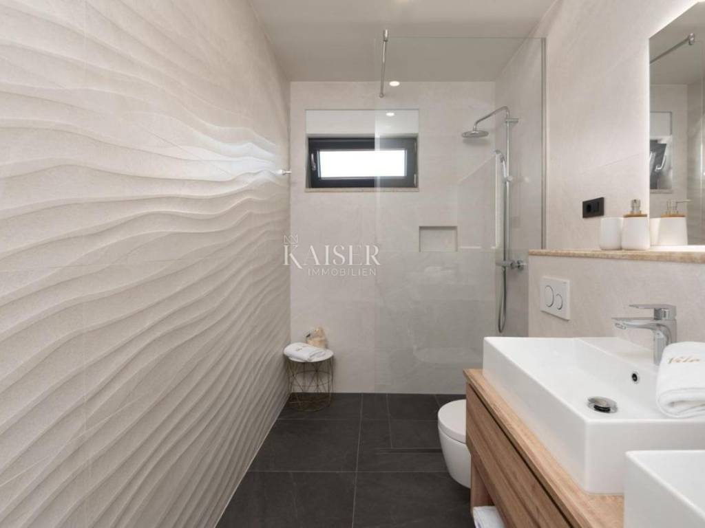 Kaiser Immobilien offers for sale a magnificent villa in a wonderful quiet location, only a few kilometers from the city of Poreč and the first beaches. The villa is located in a small Istrian rural area, where peace and relaxing everyday life reign, and with its very modern design, it fits well into the neighborhood and its appearance adorns the part of the village where it is located. In the sea of villas that are on the market today, it is difficult to design and build a villa that is completely different and that knocks you off your feet at first glance, and this is exactly what the owners of this beauty managed to do, and with great effort and careful selection of materials and design managed to create a beautiful house that attracts the eyes of passers-by. Every centimeter of the house and the garden that surrounds it has been carefully designed and decorated to the smallest detail, which is also visible in the pictures. The entire villa is equipped with carefully selected designer furniture and is sold as such, fully furnished. The villa consists of a ground floor and a first floor. The villa has three bedrooms, three bathrooms, a pantry, a living room, a dining room and a kitchen. Underfloor heating runs through the entire villa on the first floor, and the upper floor is heated with heat pumps and fan coils, and the rooms are additionally equipped with air conditioners. On the ground floor of the villa there is a kitchen, living room, dining room and pantry, as well as access to the lower covered terrace of 50 m2 and a swimming pool. There is also an outdoor kitchen in the part of the yard. We go up to the floor of the villa by internal or external stairs, where there are three bedrooms, one master bedroom has its own bathroom, while the remaining two bedrooms share one bathroom. All three rooms have access to the outdoor terrace of 70 m2, which offers a wonderful panoramic view of the sea and the village. There are two parking spaces within the villa. The pool of the villa has a very modern design and contains salt water. From the floor of the villa there is a wonderful view of the sea, which is only a few kilometers away. The property is sold fully furnished. Distance of the property to the city: Poreč - Pula Airport, 45 km Poreč - Ljubljana, 162 km Poreč - Vienna, 544 km Poreč - Prague, 868 km Poreč - Munich, 565 km If you want this new, modern villa to become your new home. , contact the agent at phone number 00385 923782803, or at the email address: ivana@kaiser-immobilien.hr. Agency commission is 3% + VAT.