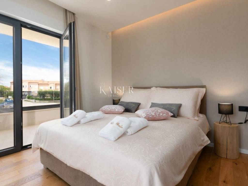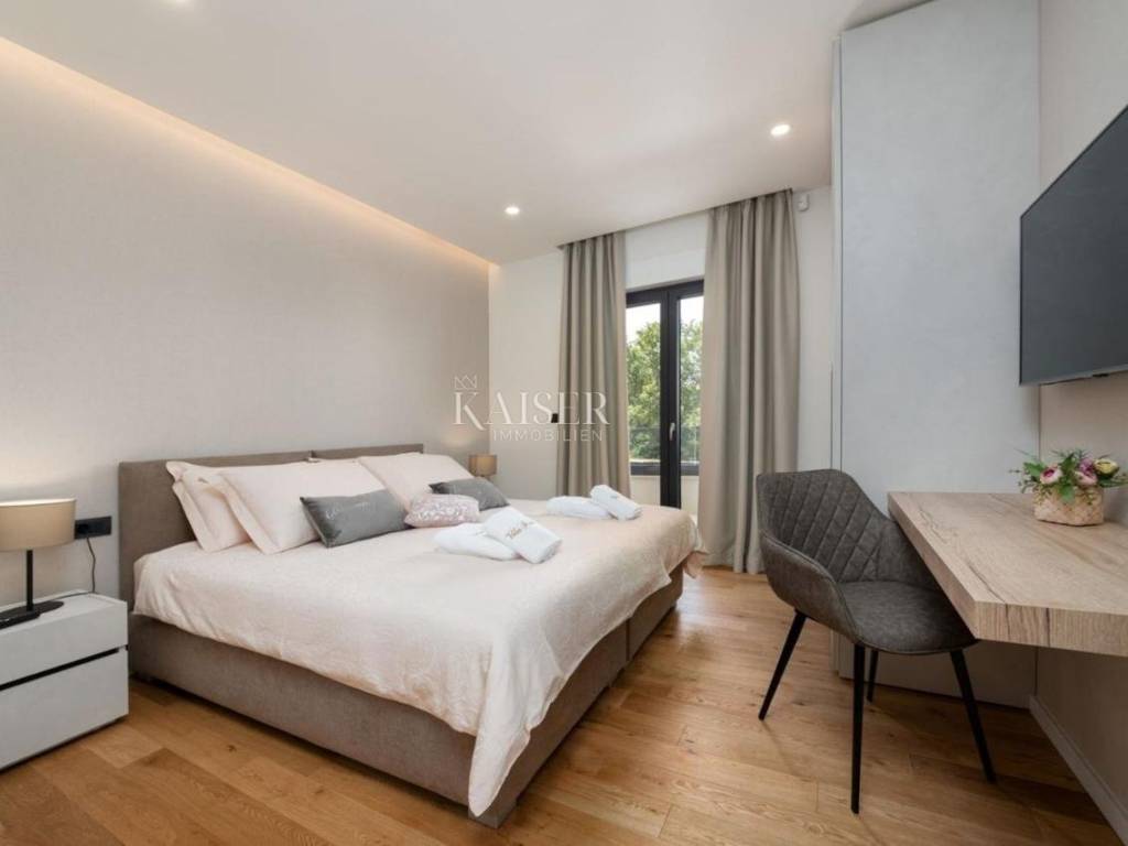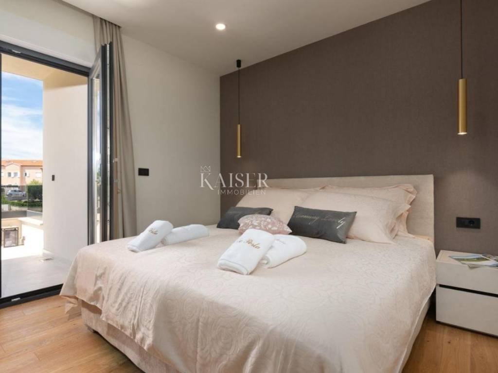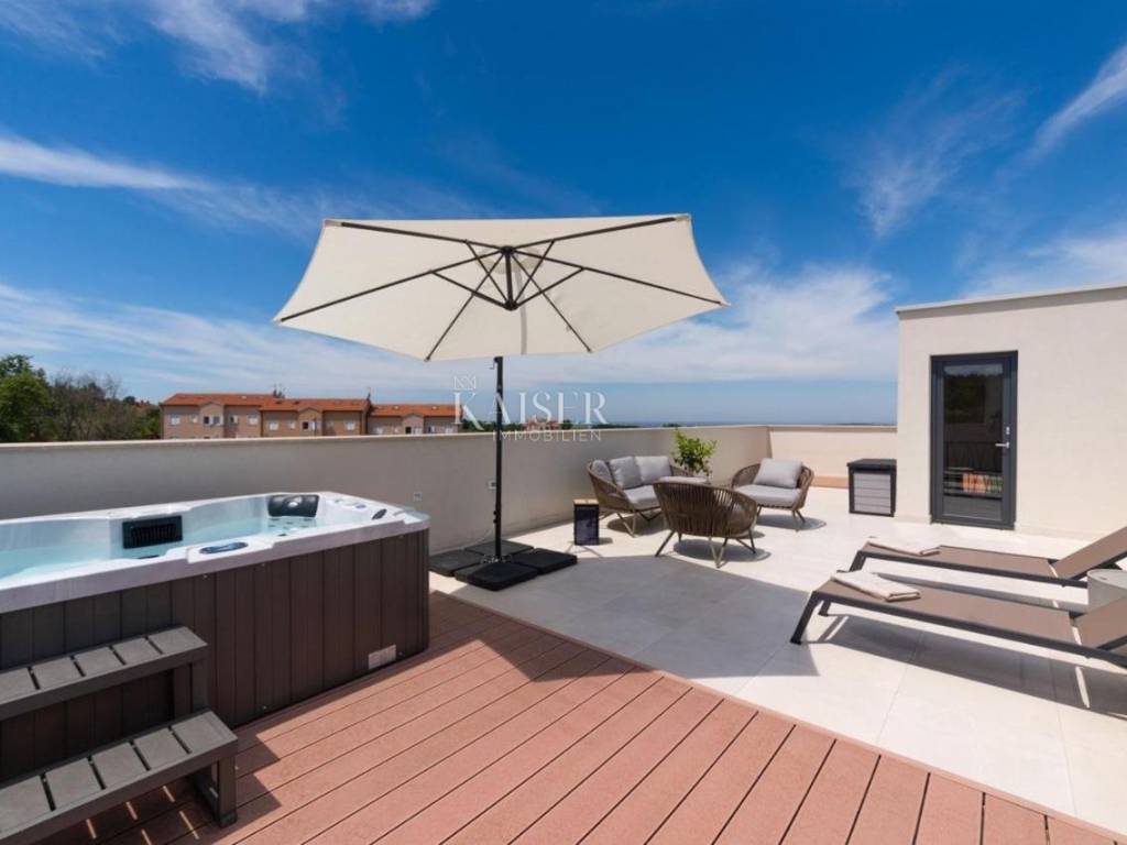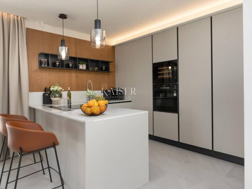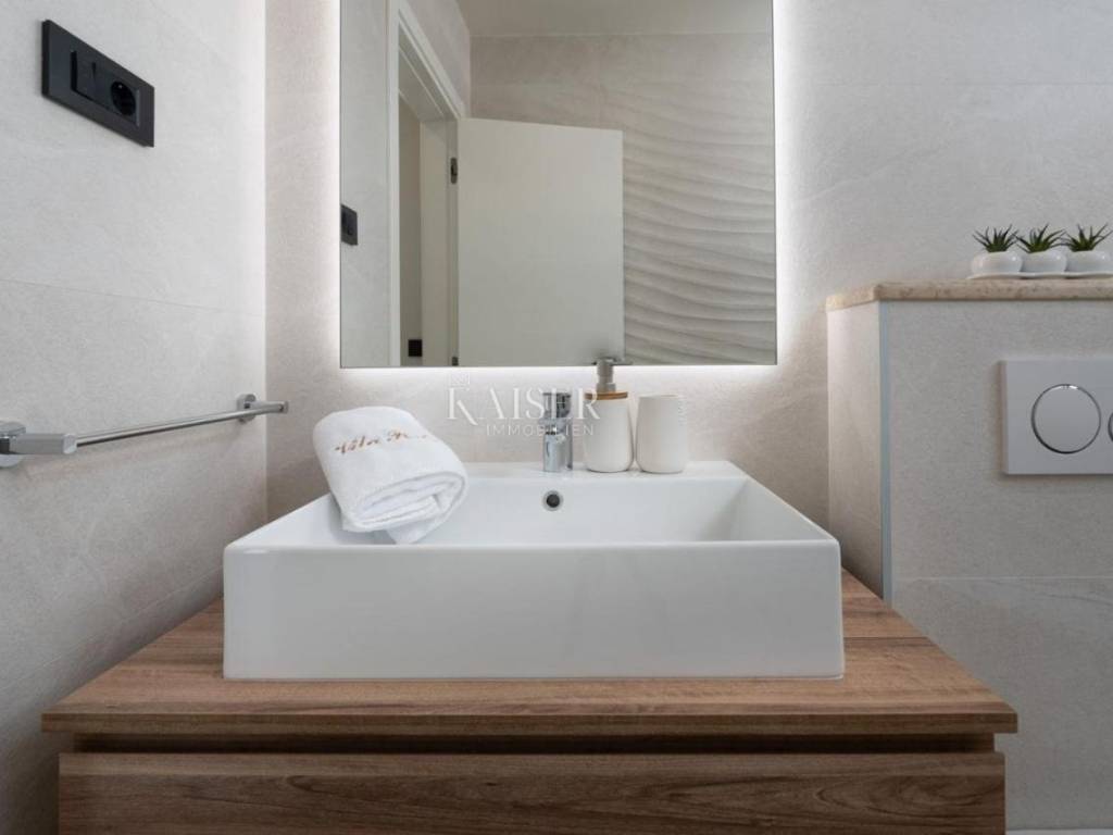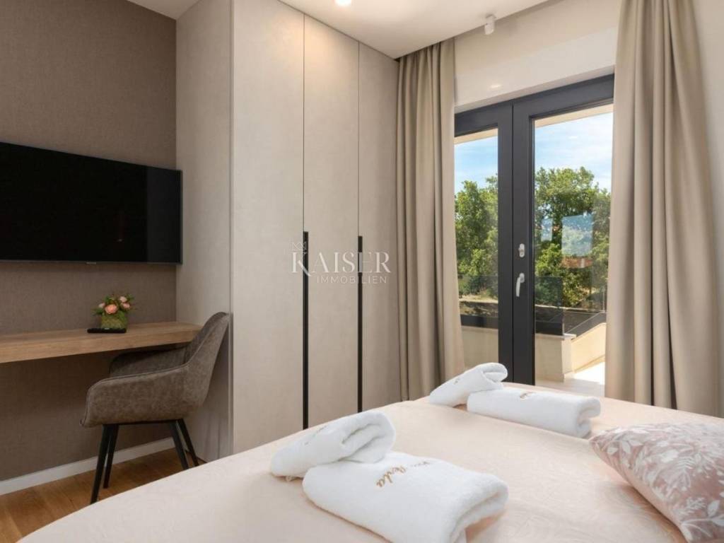 Kaiser Immobilien offers for sale a magnificent villa in a wonderful quiet location, only a few kilometers from the city of Poreč and the first beaches. The villa is located in a small Istrian rural area, where peace and relaxing everyday life reign, and with its very modern design, it fits well into the neighborhood and its appearance adorns the part of the village where it is located. In the sea of villas that are on the market today, it is difficult to design and build a villa that is completely different and that knocks you off your feet at first glance, and this is exactly what the owners of this beauty managed to do, and with great effort and careful selection of materials and design managed to create a beautiful house that attracts the eyes of passers-by. Every centimeter of the house and the garden that surrounds it has been carefully designed and decorated to the smallest detail, which is also visible in the pictures. The entire villa is equipped with carefully selected designer furniture and is sold as such, fully furnished. The villa consists of a ground floor and a first floor. The villa has three bedrooms, three bathrooms, a pantry, a living room, a dining room and a kitchen. Underfloor heating runs through the entire villa on the first floor, and the upper floor is heated with heat pumps and fan coils, and the rooms are additionally equipped with air conditioners. On the ground floor of the villa there is a kitchen, living room, dining room and pantry, as well as access to the lower covered terrace of 50 m2 and a swimming pool. There is also an outdoor kitchen in the part of the yard. We go up to the floor of the villa by internal or external stairs, where there are three bedrooms, one master bedroom has its own bathroom, while the remaining two bedrooms share one bathroom. All three rooms have access to the outdoor terrace of 70 m2, which offers a wonderful panoramic view of the sea and the village. There are two parking spaces within the villa. The pool of the villa has a very modern design and contains salt water. From the floor of the villa there is a wonderful view of the sea, which is only a few kilometers away. The property is sold fully furnished. Distance of the property to the city: Poreč - Pula Airport, 45 km Poreč - Ljubljana, 162 km Poreč - Vienna, 544 km Poreč - Prague, 868 km Poreč - Munich, 565 km If you want this new, modern villa to become your new home. , contact the agent at phone number 00385 923782803, or at the email address: ivana@kaiser-immobilien.hr. Agency commission is 3% + VAT.