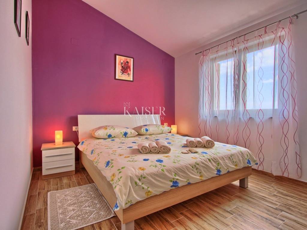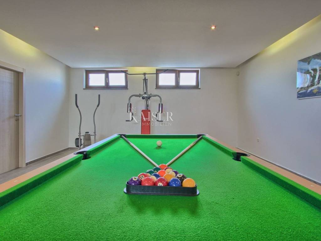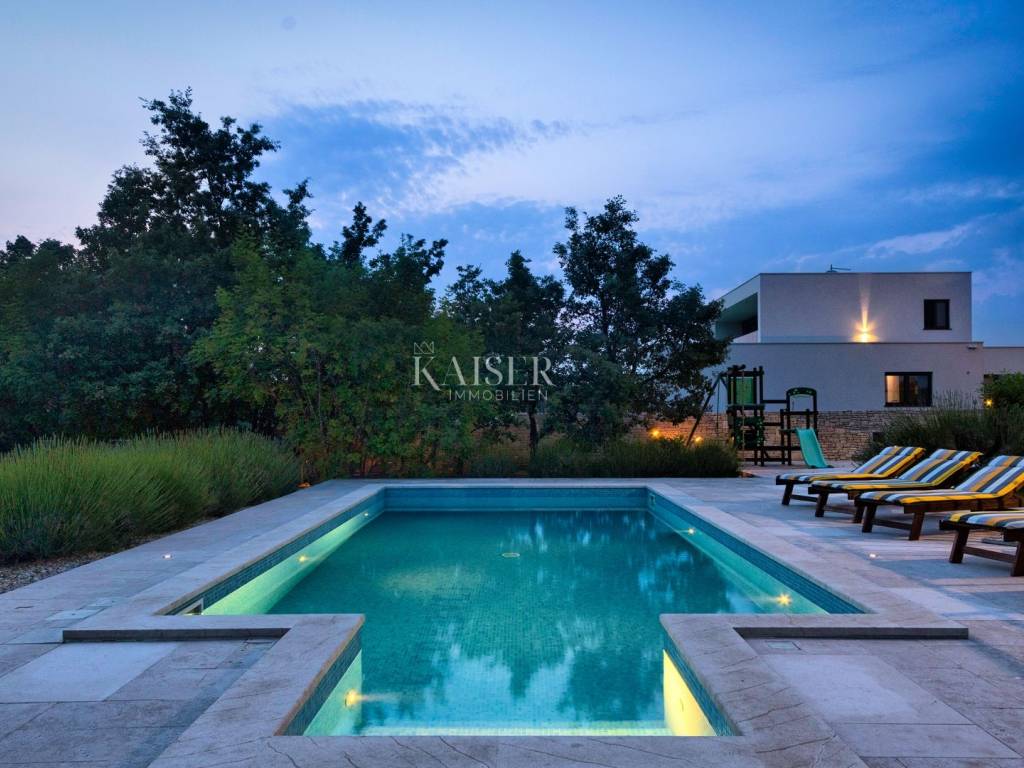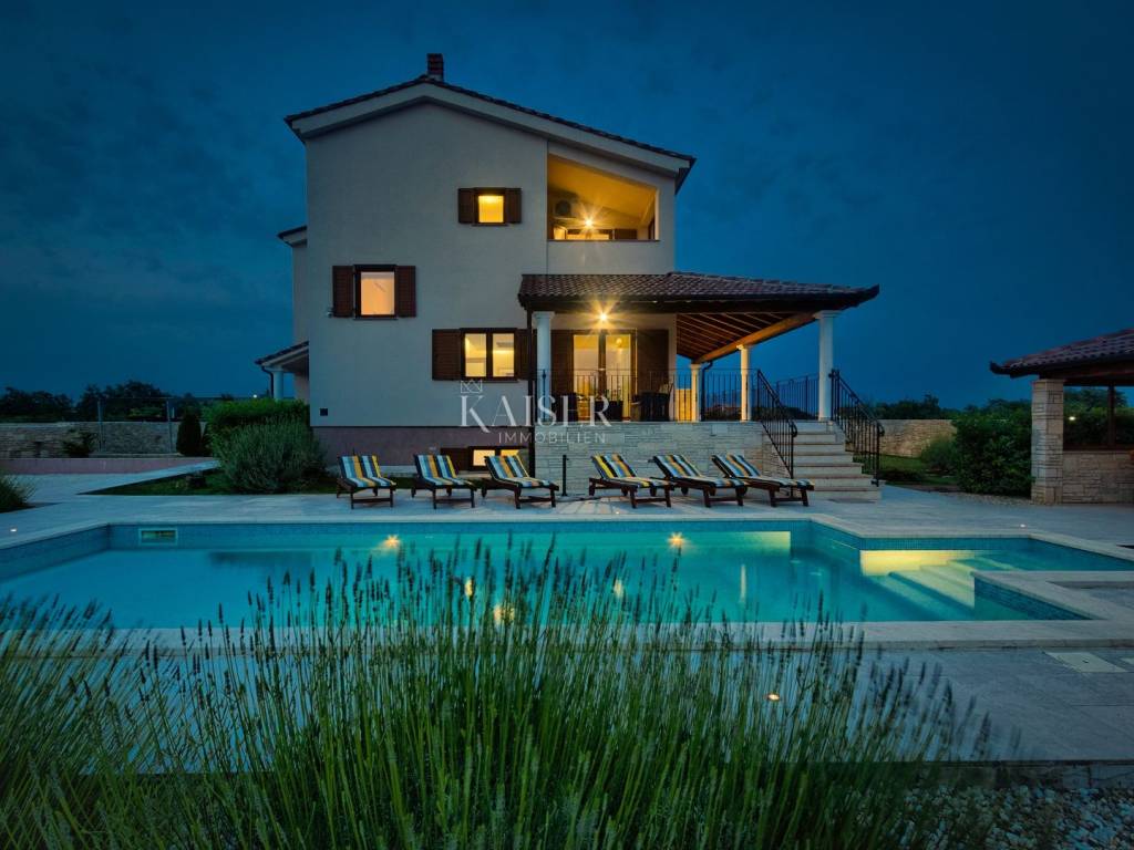 Kaiser Immobilien presents a unique villa in the heart of Istria. This beautiful property offers a handful of amenities to make your stay pleasant and special. The villa is located in a very quiet place in the very center of Istria, not far from all major cities. It is located on a plot of 2,000 m2, and with its spaciousness and well-utilized space, it ensures privacy and peace. The villa consists of 295 m2 of living space divided into basement, ground floor and first floor. The basement is used as a multifunctional space, for fitness and other sports activities. It also has a boiler room. The ground floor consists of a bedroom with its own hall and bathroom. Each bedroom is equipped with its own air conditioner, SAT/miTV and a safe. The living room with kitchen and dining room is separated by glass walls from the covered terrace (36m2) with a view of the pool and fireplace. The ground floor also provides a vestibule for a washer and dryer and a guest bathroom. There are three bedrooms with private bathrooms on the first floor, one of the bedrooms has its own exit to the balcony (7 m2) with a view of the pool. The villa provides internet, smoke sensors in all rooms, the living room and the basement, an alarm system as well as video surveillance from the outside and irrigation of part of the lawn. There is a heated pool of 36m2 in the garden, the terrace around the pool is 100m2. Covered grill fireplace with sitting table, which also includes a hydromassage tub Covered parking for two cars, and additional parking for two more vehicles, total parking area approx. 100m2 Children's multifunctional playground, 6-hole minigolf, multifunctional field (16x8m): mini football , basketball, volleyball