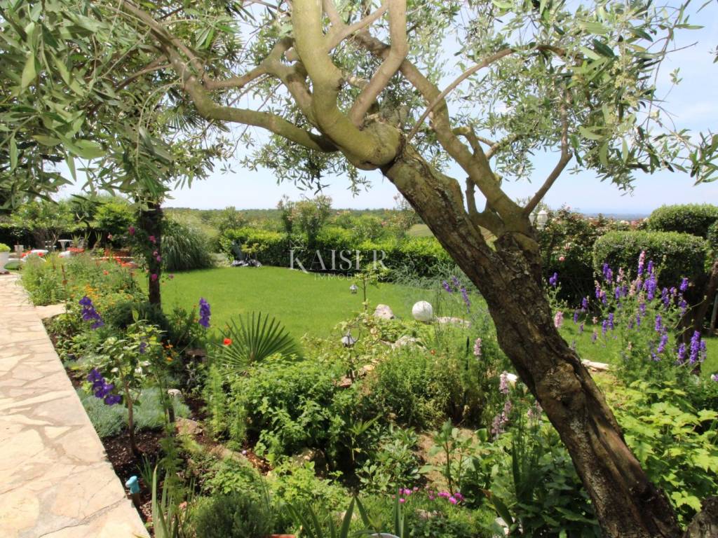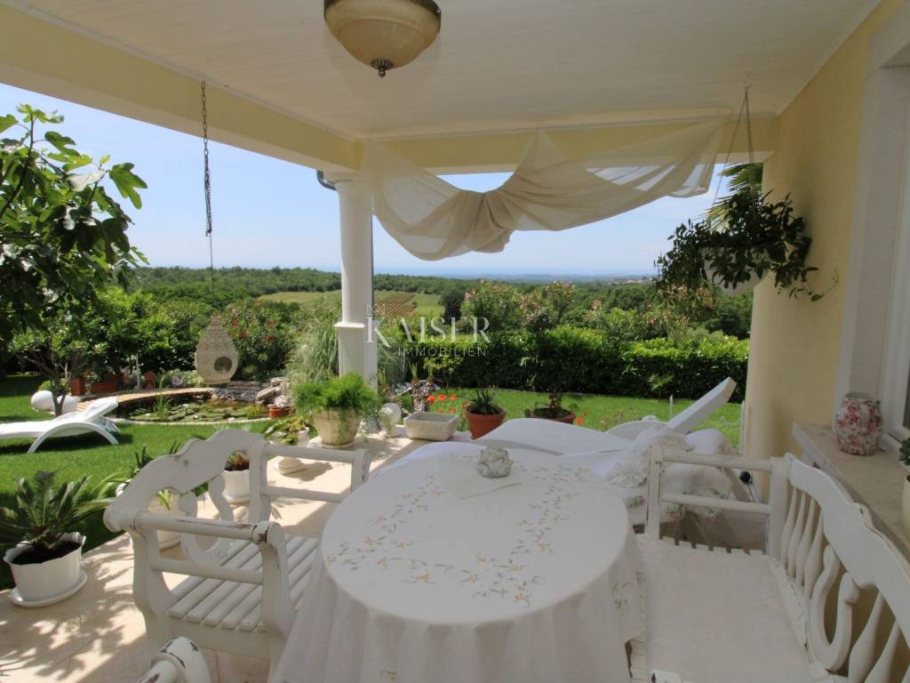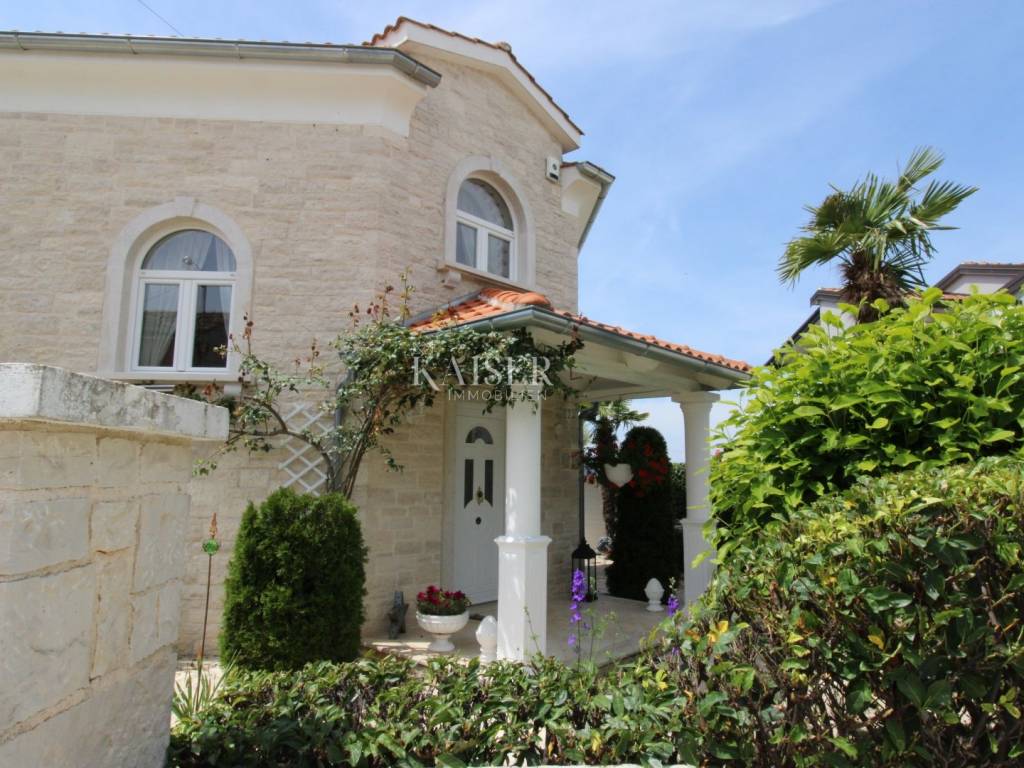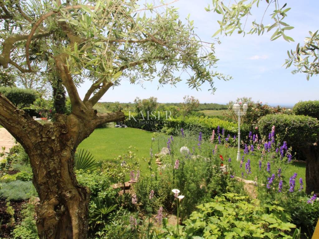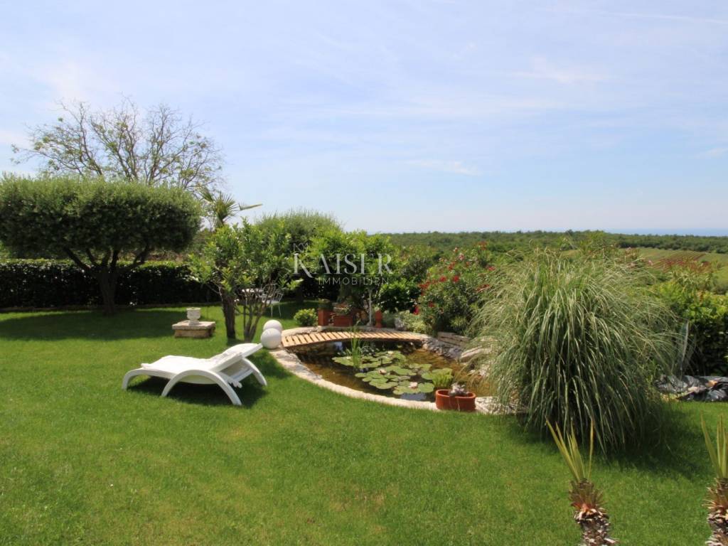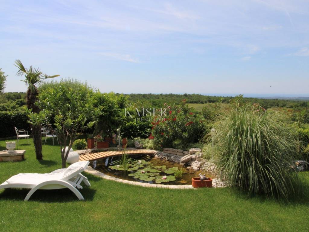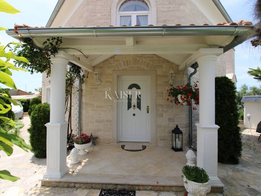 Kaiser Immobilien offers for sale a unique, imposing stone villa near the town of Poreč. On the west coast of Istria, with an enchanting view of the blue sea and the green landscape nearby, this real beauty is located among the villas, only 13 km from Poreč and the first beaches. The villa is located on an independent plot of 826 square meters, in a small autochthonous Istrian area that promises harmony of life and peace of everyday life. Access to the villa is provided by an asphalt road with all the infrastructure in the courtyard of the villa. This imposing, stone villa with a true Mediterranean flair is 265.86 square meters of gross surface area. The villa is surrounded by a beautiful covered terrace with a unique view of the sea with a constant breeze that will ensure your stay is pleasant. The exterior of the villa is decorated with a beautiful garden, which the owners take special care of and put a lot of effort into the appearance of the botany and landscaping of the yard. There are olive trees, fig trees, green ornamental plants, and the entire yard is surrounded by a well-kept, overgrown hedge. The biggest attraction of this beautiful environment was definitely the pond with a beautiful appearance, which is connected to the yard via a special wooden bridge. The entire yard is illuminated, as are the olive trees. In the yard there is also a wooden garden house and a summer kitchen. The entire yard is irrigated via an irrigation system. Upon entering the villa, we encounter a wonderful entrance hall carefully designed by the owner, as well as the entire residential area. There is an entrance hall, a living room with a view of the sea, a dining room with a view of the sea and the garden, a kitchen and a specially designed bedroom with its own bathroom, a guest toilet and a separate space for shoes. The entire space is decorated with special furniture and design elements, special decorative walls and other details that the owners are particularly proud of. The living room is decorated with a beautiful fireplace that will surely provide you with a wonderful winter atmosphere in the Mediterranean region. Vertical communication between the ground floor and the first floor is achieved by an internal, wooden, winding staircase. On the floor of the villa there are two more bedrooms, one a little smaller and one bigger. The larger bedroom has its own bathroom and its own imposing covered balcony with an enchanting view of the sea. The owners leave the bed and built-in wardrobe for sale. In the entire villa, the owners leave all the built-in wardrobes in the lower bedroom, complete built-in equipment, sanitary facilities and a complete kitchen. The heating system in the villa is installed via floor heating on the ground floor, and radiators on the first floor of the villa (gas central heating). The villa is fully equipped with air conditioners, cameras and alarms. The villa contains a water purifier for the whole house and one separate water purifier for drinking in the kitchen. The 2700 m3 gas tank is located on the plot, buried underground. The villa has the possibility of 4 parking spaces, 2 in the yard, 2 outside the yard. The swimming pool in the yard has never been built, but it is included in the building permit, with a gross area of 23.75 m2 in length and a depth of 130 - 150 m. Distance of the property to the city: Poreč - Pula Airport, 45 km Poreč - Ljubljana, 162 km Poreč - Vienna, 544 km Poreč - Prague, 868 km Poreč - Munich, 565 km If you plan to start your new life in Istria, and this imposing Mediterranean villa is the right choice for you, allow us to start a new chapter of your life together with you and contact us at phone number 00385 923782803, or at the email address: ivana@kaiser-immobilien.hr. Agency commission is 3% + VAT.