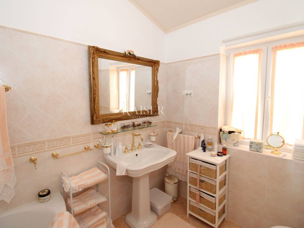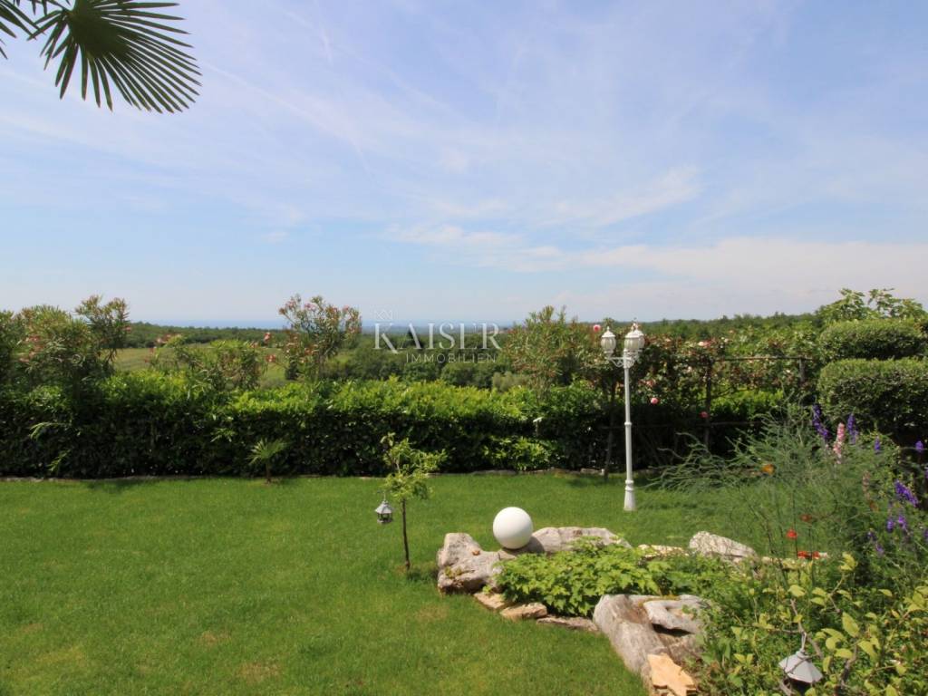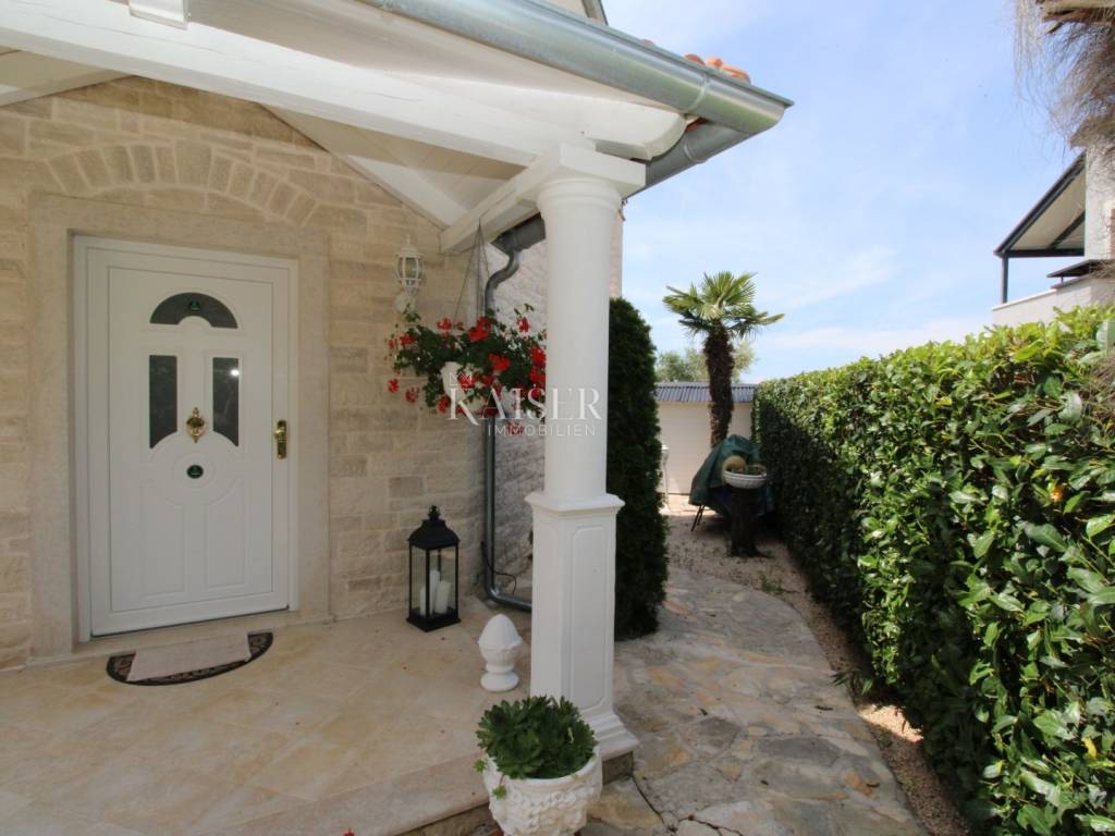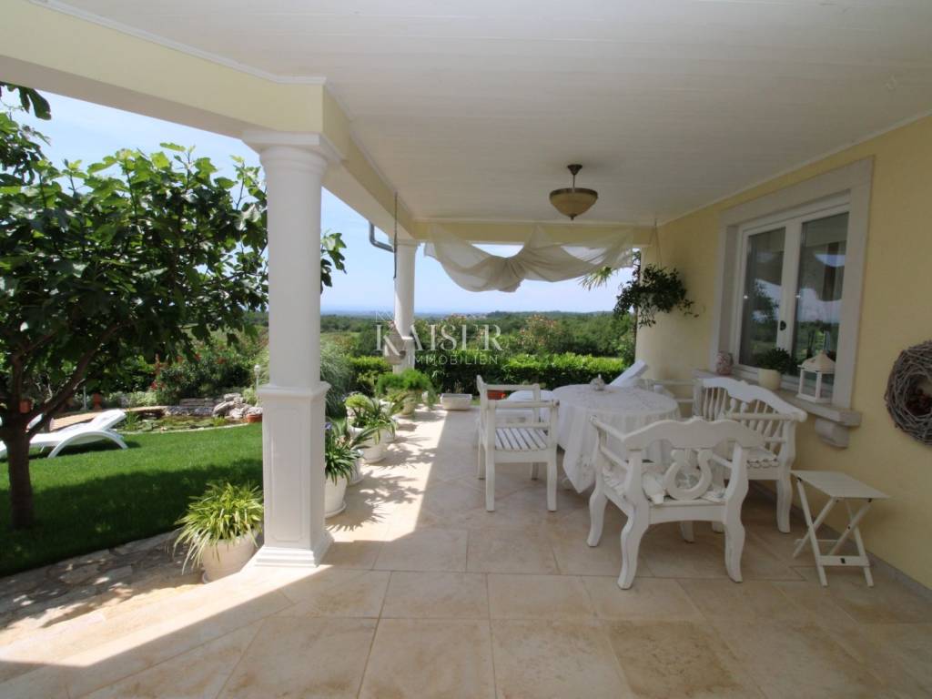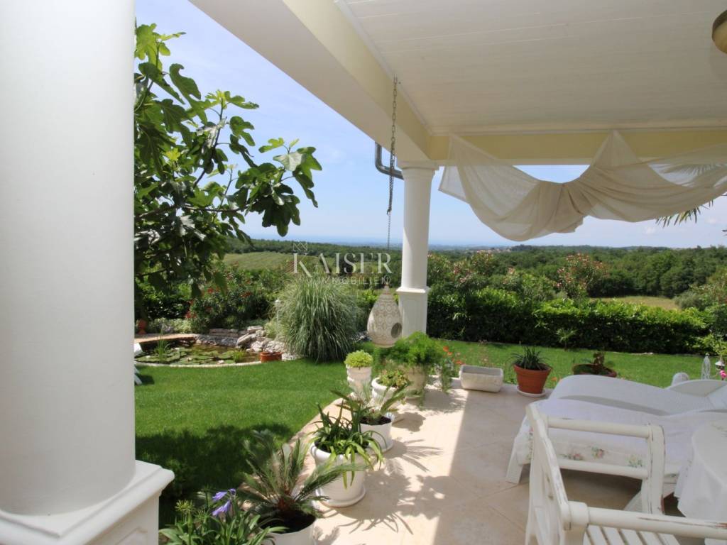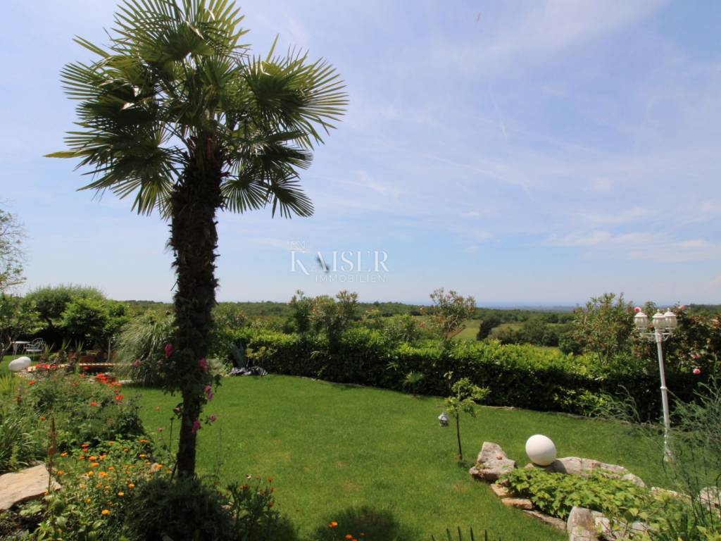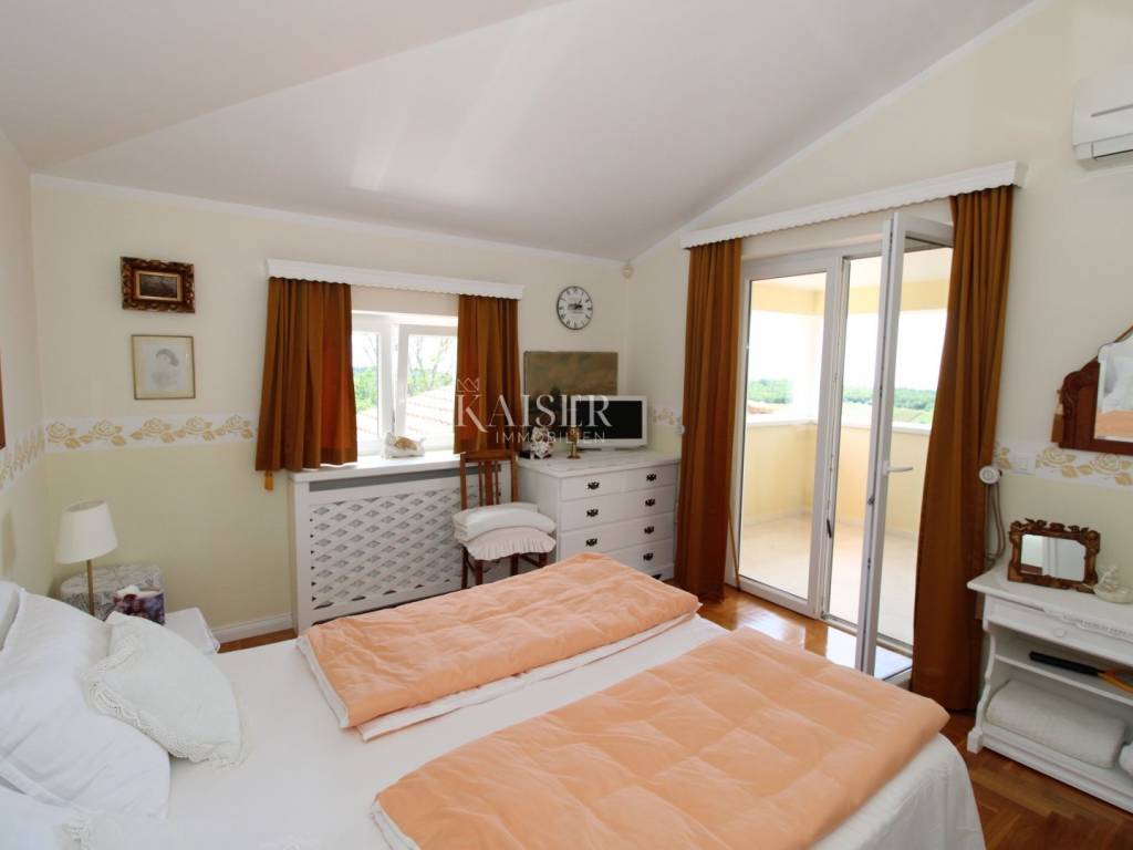 Kaiser Immobilien offers for sale a unique, imposing stone villa near the town of Poreč. On the west coast of Istria, with an enchanting view of the blue sea and the green landscape nearby, this real beauty is located among the villas, only 13 km from Poreč and the first beaches. The villa is located on an independent plot of 826 square meters, in a small autochthonous Istrian area that promises harmony of life and peace of everyday life. Access to the villa is provided by an asphalt road with all the infrastructure in the courtyard of the villa. This imposing, stone villa with a true Mediterranean flair is 265.86 square meters of gross surface area. The villa is surrounded by a beautiful covered terrace with a unique view of the sea with a constant breeze that will ensure your stay is pleasant. The exterior of the villa is decorated with a beautiful garden, which the owners take special care of and put a lot of effort into the appearance of the botany and landscaping of the yard. There are olive trees, fig trees, green ornamental plants, and the entire yard is surrounded by a well-kept, overgrown hedge. The biggest attraction of this beautiful environment was definitely the pond with a beautiful appearance, which is connected to the yard via a special wooden bridge. The entire yard is illuminated, as are the olive trees. In the yard there is also a wooden garden house and a summer kitchen. The entire yard is irrigated via an irrigation system. Upon entering the villa, we encounter a wonderful entrance hall carefully designed by the owner, as well as the entire residential area. There is an entrance hall, a living room with a view of the sea, a dining room with a view of the sea and the garden, a kitchen and a specially designed bedroom with its own bathroom, a guest toilet and a separate space for shoes. The entire space is decorated with special furniture and design elements, special decorative walls and other details that the owners are particularly proud of. The living room is decorated with a beautiful fireplace that will surely provide you with a wonderful winter atmosphere in the Mediterranean region. Vertical communication between the ground floor and the first floor is achieved by an internal, wooden, winding staircase. On the floor of the villa there are two more bedrooms, one a little smaller and one bigger. The larger bedroom has its own bathroom and its own imposing covered balcony with an enchanting view of the sea. The owners leave the bed and built-in wardrobe for sale. In the entire villa, the owners leave all the built-in wardrobes in the lower bedroom, complete built-in equipment, sanitary facilities and a complete kitchen. The heating system in the villa is installed via floor heating on the ground floor, and radiators on the first floor of the villa (gas central heating). The villa is fully equipped with air conditioners, cameras and alarms. The villa contains a water purifier for the whole house and one separate water purifier for drinking in the kitchen. The 2700 m3 gas tank is located on the plot, buried underground. The villa has the possibility of 4 parking spaces, 2 in the yard, 2 outside the yard. The swimming pool in the yard has never been built, but it is included in the building permit, with a gross area of 23.75 m2 in length and a depth of 130 - 150 m. Distance of the property to the city: Poreč - Pula Airport, 45 km Poreč - Ljubljana, 162 km Poreč - Vienna, 544 km Poreč - Prague, 868 km Poreč - Munich, 565 km If you plan to start your new life in Istria, and this imposing Mediterranean villa is the right choice for you, allow us to start a new chapter of your life together with you and contact us at phone number 00385 923782803, or at the email address: ivana@kaiser-immobilien.hr. Agency commission is 3% + VAT.