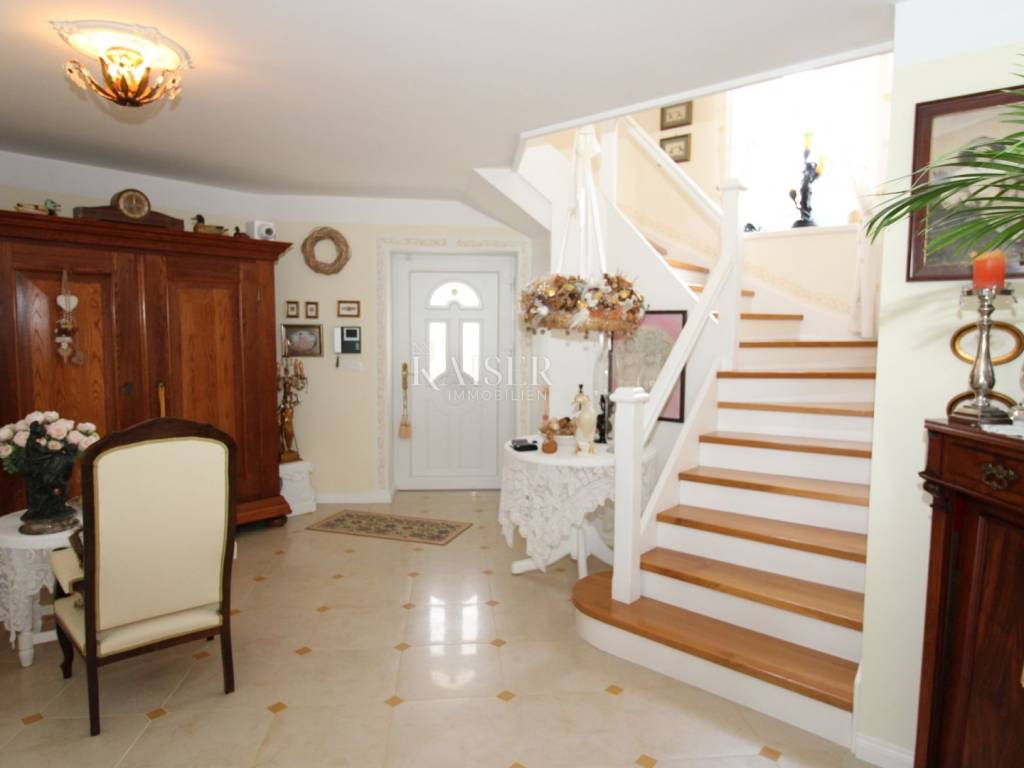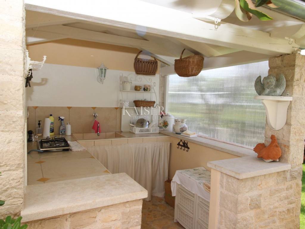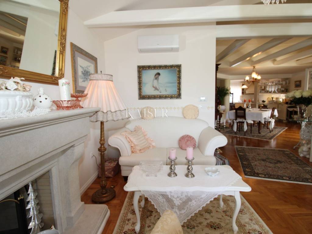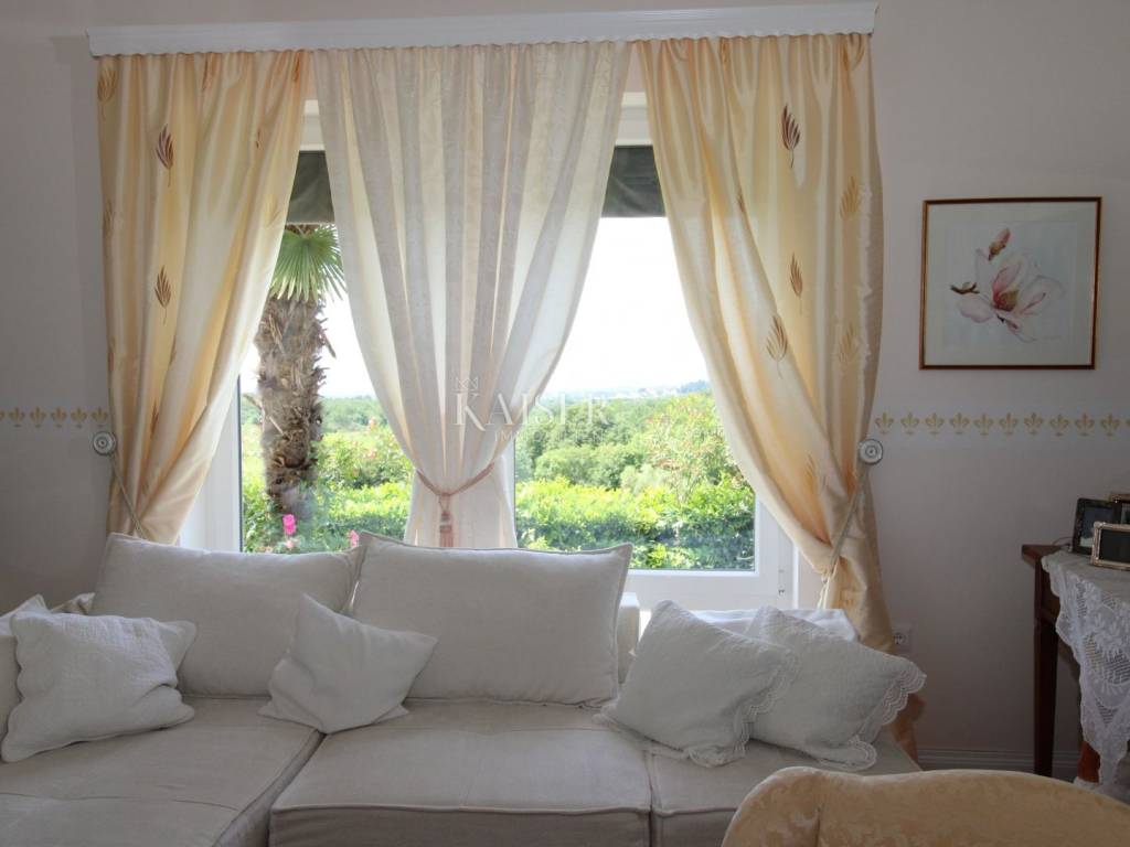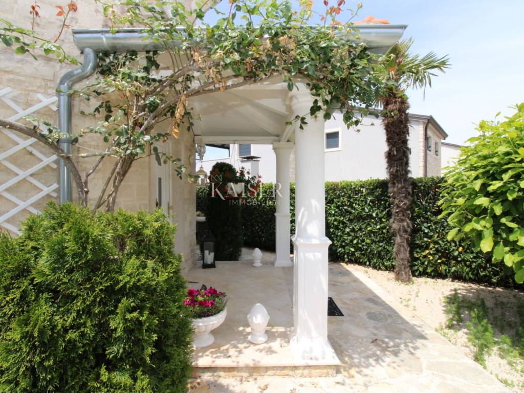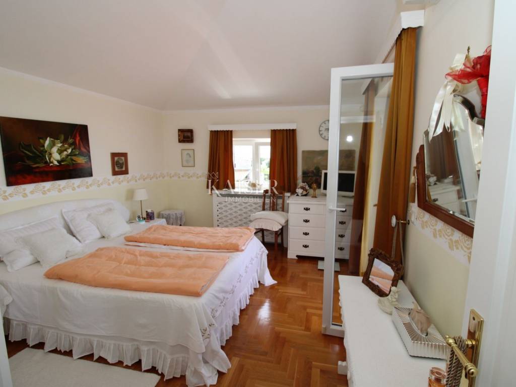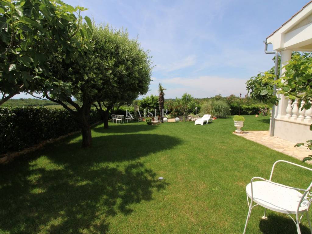 Kaiser Immobilien offers for sale a unique, imposing stone villa near the town of Poreč. On the west coast of Istria, with an enchanting view of the blue sea and the green landscape nearby, this real beauty is located among the villas, only 13 km from Poreč and the first beaches. The villa is located on an independent plot of 826 square meters, in a small autochthonous Istrian area that promises harmony of life and peace of everyday life. Access to the villa is provided by an asphalt road with all the infrastructure in the courtyard of the villa. This imposing, stone villa with a true Mediterranean flair is 265.86 square meters of gross surface area. The villa is surrounded by a beautiful covered terrace with a unique view of the sea with a constant breeze that will ensure your stay is pleasant. The exterior of the villa is decorated with a beautiful garden, which the owners take special care of and put a lot of effort into the appearance of the botany and landscaping of the yard. There are olive trees, fig trees, green ornamental plants, and the entire yard is surrounded by a well-kept, overgrown hedge. The biggest attraction of this beautiful environment was definitely the pond with a beautiful appearance, which is connected to the yard via a special wooden bridge. The entire yard is illuminated, as are the olive trees. In the yard there is also a wooden garden house and a summer kitchen. The entire yard is irrigated via an irrigation system. Upon entering the villa, we encounter a wonderful entrance hall carefully designed by the owner, as well as the entire residential area. There is an entrance hall, a living room with a view of the sea, a dining room with a view of the sea and the garden, a kitchen and a specially designed bedroom with its own bathroom, a guest toilet and a separate space for shoes. The entire space is decorated with special furniture and design elements, special decorative walls and other details that the owners are particularly proud of. The living room is decorated with a beautiful fireplace that will surely provide you with a wonderful winter atmosphere in the Mediterranean region. Vertical communication between the ground floor and the first floor is achieved by an internal, wooden, winding staircase. On the floor of the villa there are two more bedrooms, one a little smaller and one bigger. The larger bedroom has its own bathroom and its own imposing covered balcony with an enchanting view of the sea. The owners leave the bed and built-in wardrobe for sale. In the entire villa, the owners leave all the built-in wardrobes in the lower bedroom, complete built-in equipment, sanitary facilities and a complete kitchen. The heating system in the villa is installed via floor heating on the ground floor, and radiators on the first floor of the villa (gas central heating). The villa is fully equipped with air conditioners, cameras and alarms. The villa contains a water purifier for the whole house and one separate water purifier for drinking in the kitchen. The 2700 m3 gas tank is located on the plot, buried underground. The villa has the possibility of 4 parking spaces, 2 in the yard, 2 outside the yard. The swimming pool in the yard has never been built, but it is included in the building permit, with a gross area of 23.75 m2 in length and a depth of 130 - 150 m. Distance of the property to the city: Poreč - Pula Airport, 45 km Poreč - Ljubljana, 162 km Poreč - Vienna, 544 km Poreč - Prague, 868 km Poreč - Munich, 565 km If you plan to start your new life in Istria, and this imposing Mediterranean villa is the right choice for you, allow us to start a new chapter of your life together with you and contact us at phone number 00385 923782803, or at the email address: ivana@kaiser-immobilien.hr. Agency commission is 3% + VAT.