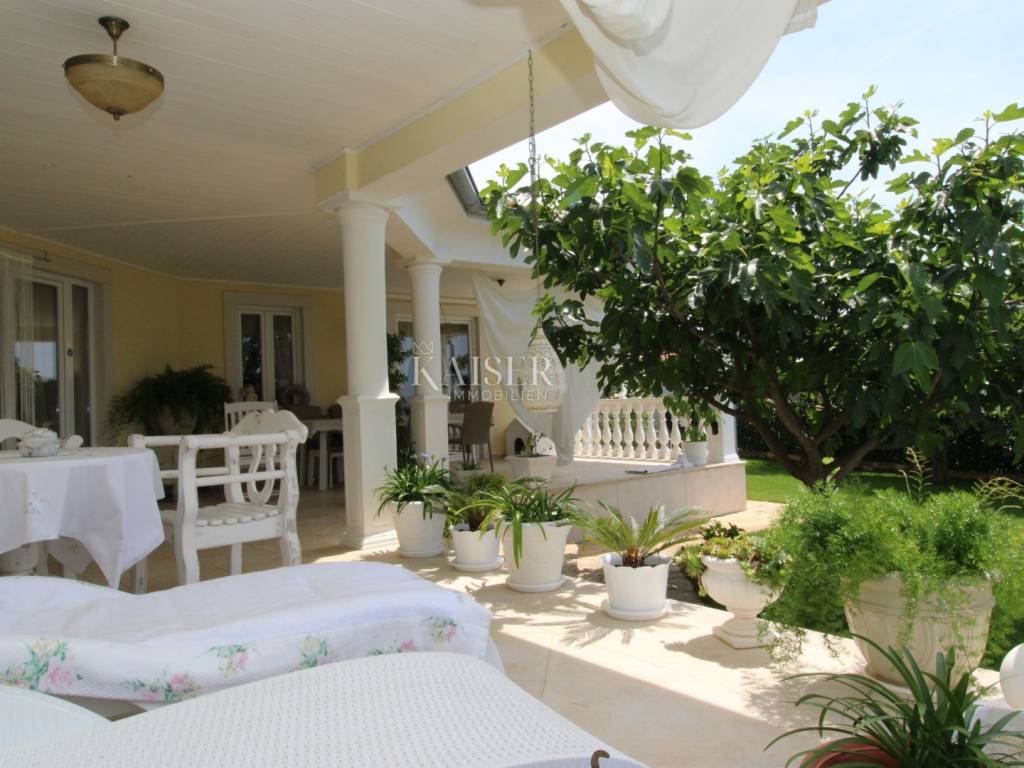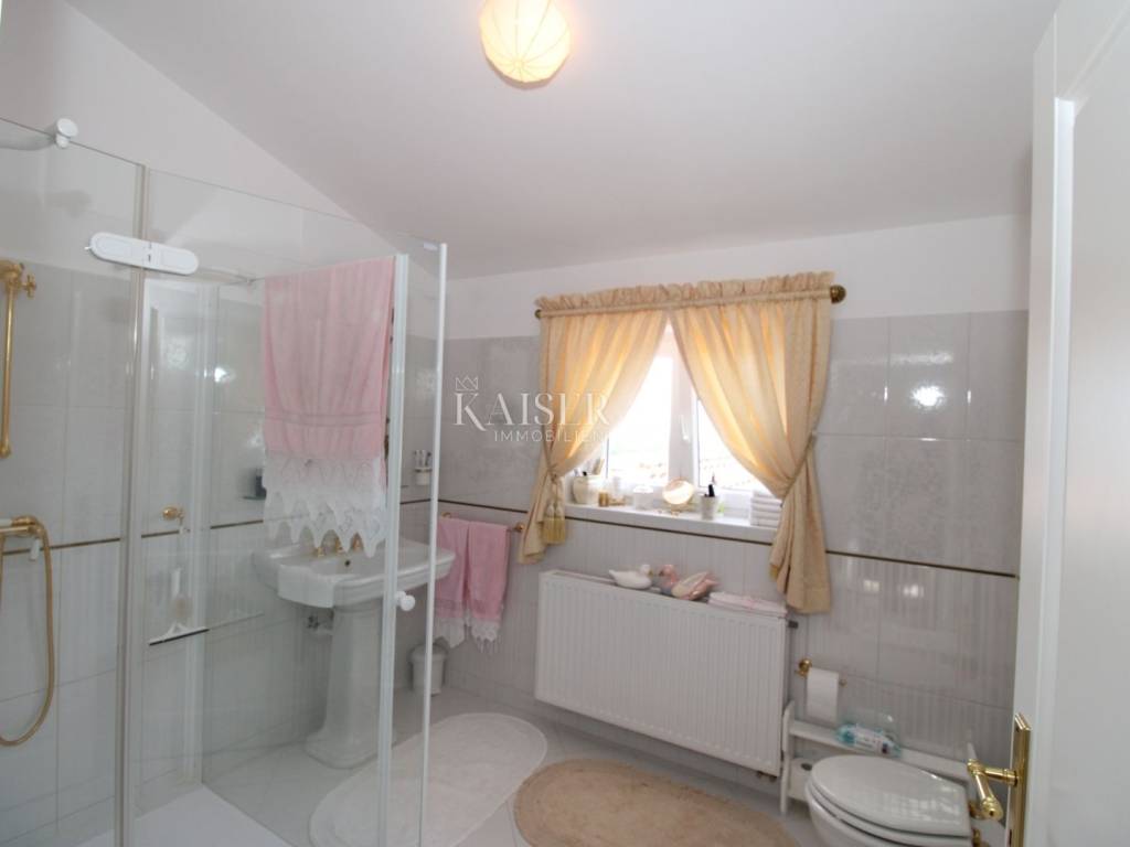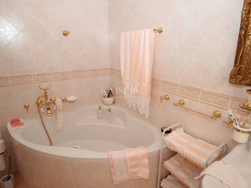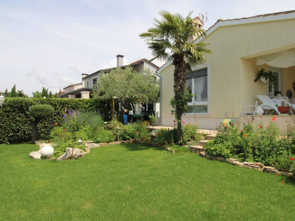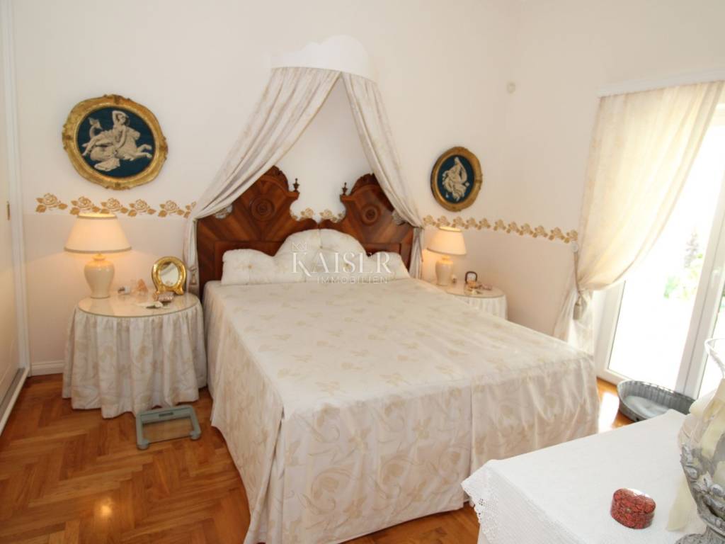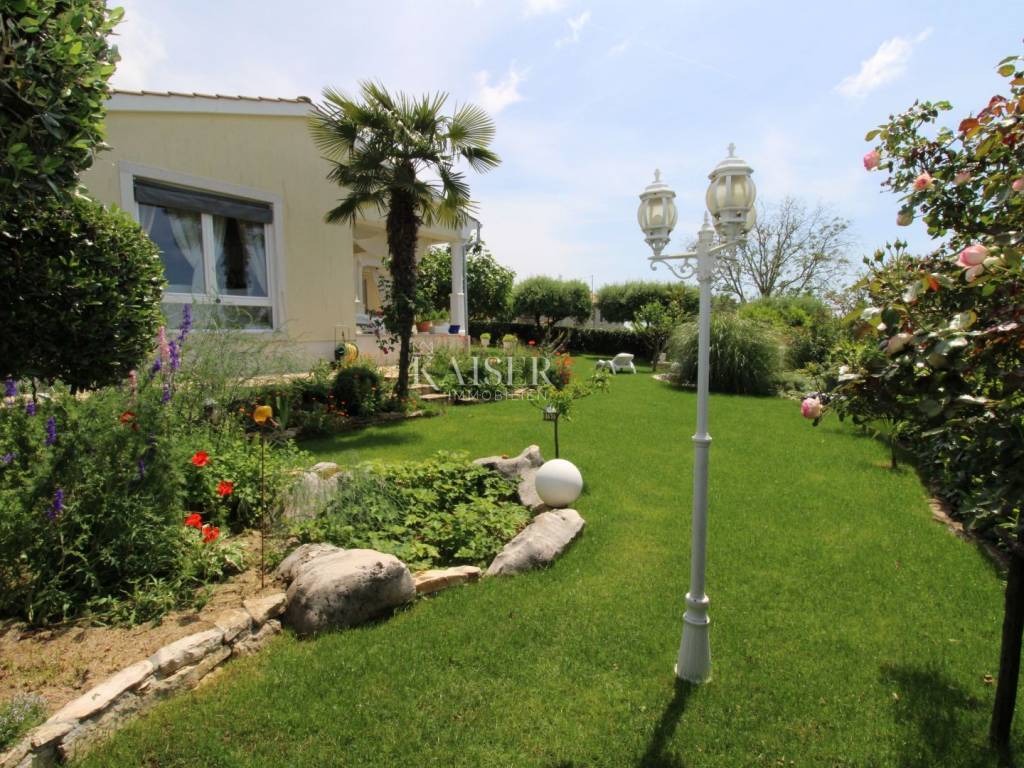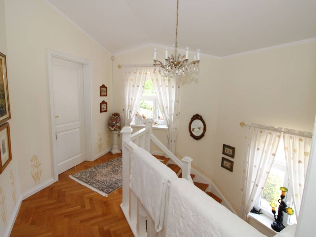 Kaiser Immobilien offers for sale a unique, imposing stone villa near the town of Poreč. On the west coast of Istria, with an enchanting view of the blue sea and the green landscape nearby, this real beauty is located among the villas, only 13 km from Poreč and the first beaches. The villa is located on an independent plot of 826 square meters, in a small autochthonous Istrian area that promises harmony of life and peace of everyday life. Access to the villa is provided by an asphalt road with all the infrastructure in the courtyard of the villa. This imposing, stone villa with a true Mediterranean flair is 265.86 square meters of gross surface area. The villa is surrounded by a beautiful covered terrace with a unique view of the sea with a constant breeze that will ensure your stay is pleasant. The exterior of the villa is decorated with a beautiful garden, which the owners take special care of and put a lot of effort into the appearance of the botany and landscaping of the yard. There are olive trees, fig trees, green ornamental plants, and the entire yard is surrounded by a well-kept, overgrown hedge. The biggest attraction of this beautiful environment was definitely the pond with a beautiful appearance, which is connected to the yard via a special wooden bridge. The entire yard is illuminated, as are the olive trees. In the yard there is also a wooden garden house and a summer kitchen. The entire yard is irrigated via an irrigation system. Upon entering the villa, we encounter a wonderful entrance hall carefully designed by the owner, as well as the entire residential area. There is an entrance hall, a living room with a view of the sea, a dining room with a view of the sea and the garden, a kitchen and a specially designed bedroom with its own bathroom, a guest toilet and a separate space for shoes. The entire space is decorated with special furniture and design elements, special decorative walls and other details that the owners are particularly proud of. The living room is decorated with a beautiful fireplace that will surely provide you with a wonderful winter atmosphere in the Mediterranean region. Vertical communication between the ground floor and the first floor is achieved by an internal, wooden, winding staircase. On the floor of the villa there are two more bedrooms, one a little smaller and one bigger. The larger bedroom has its own bathroom and its own imposing covered balcony with an enchanting view of the sea. The owners leave the bed and built-in wardrobe for sale. In the entire villa, the owners leave all the built-in wardrobes in the lower bedroom, complete built-in equipment, sanitary facilities and a complete kitchen. The heating system in the villa is installed via floor heating on the ground floor, and radiators on the first floor of the villa (gas central heating). The villa is fully equipped with air conditioners, cameras and alarms. The villa contains a water purifier for the whole house and one separate water purifier for drinking in the kitchen. The 2700 m3 gas tank is located on the plot, buried underground. The villa has the possibility of 4 parking spaces, 2 in the yard, 2 outside the yard. The swimming pool in the yard has never been built, but it is included in the building permit, with a gross area of 23.75 m2 in length and a depth of 130 - 150 m. Distance of the property to the city: Poreč - Pula Airport, 45 km Poreč - Ljubljana, 162 km Poreč - Vienna, 544 km Poreč - Prague, 868 km Poreč - Munich, 565 km If you plan to start your new life in Istria, and this imposing Mediterranean villa is the right choice for you, allow us to start a new chapter of your life together with you and contact us at phone number 00385 923782803, or at the email address: ivana@kaiser-immobilien.hr. Agency commission is 3% + VAT.
