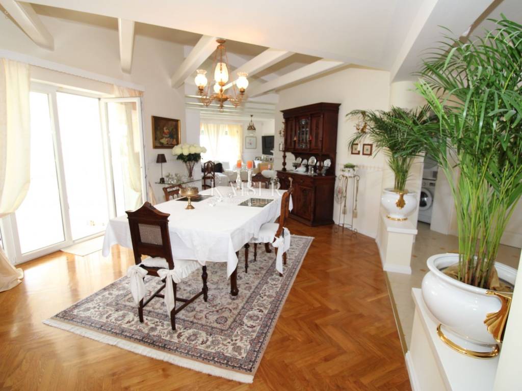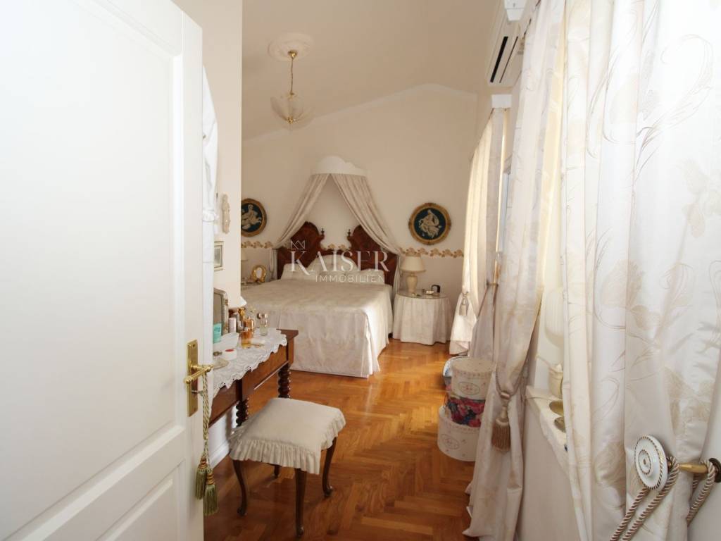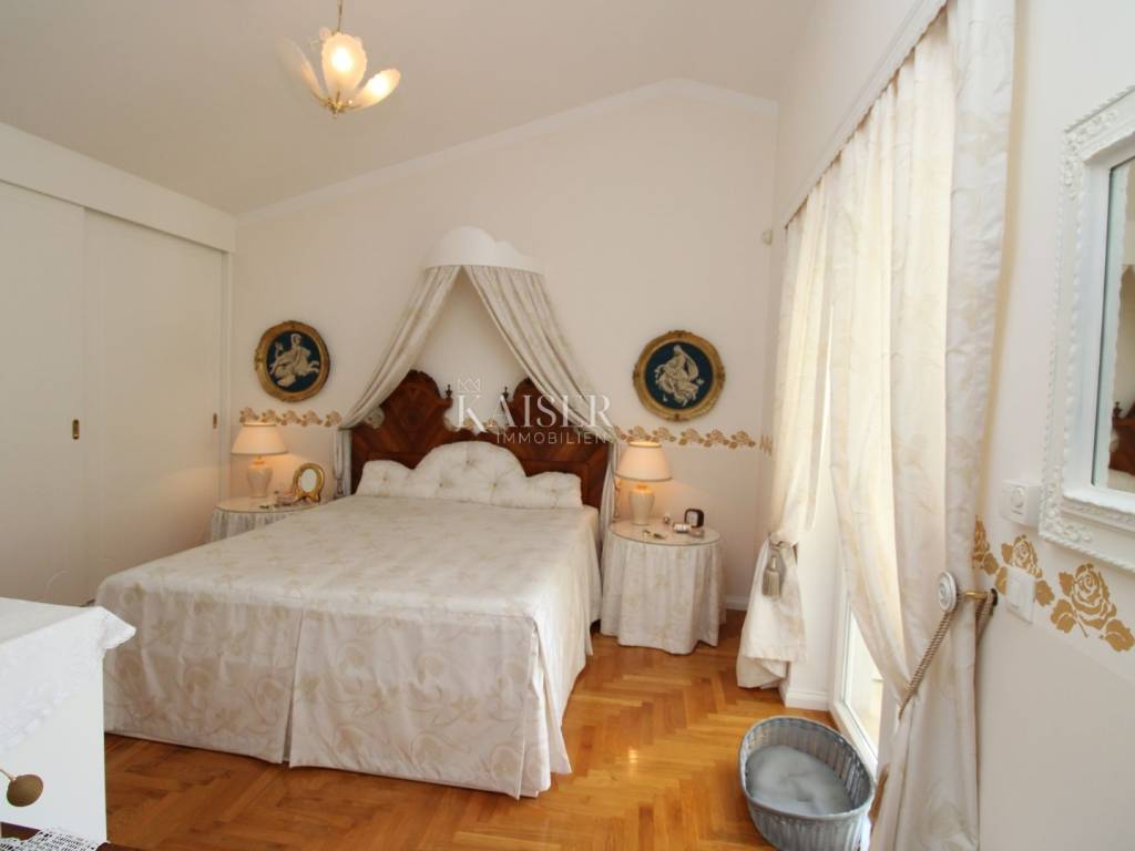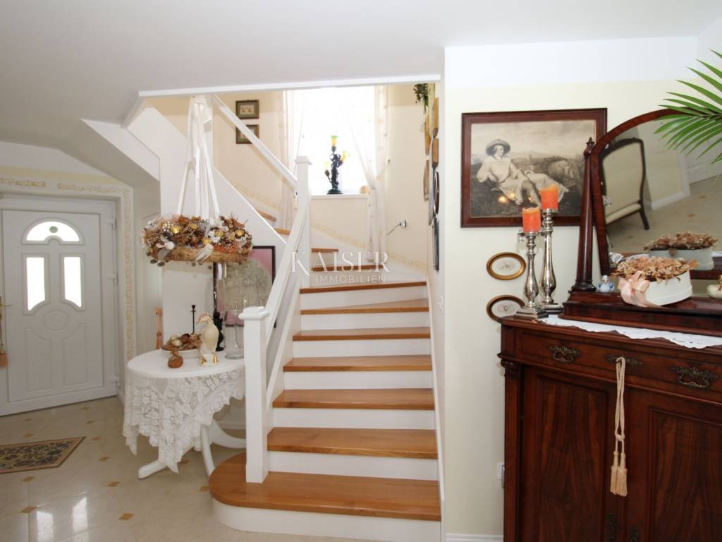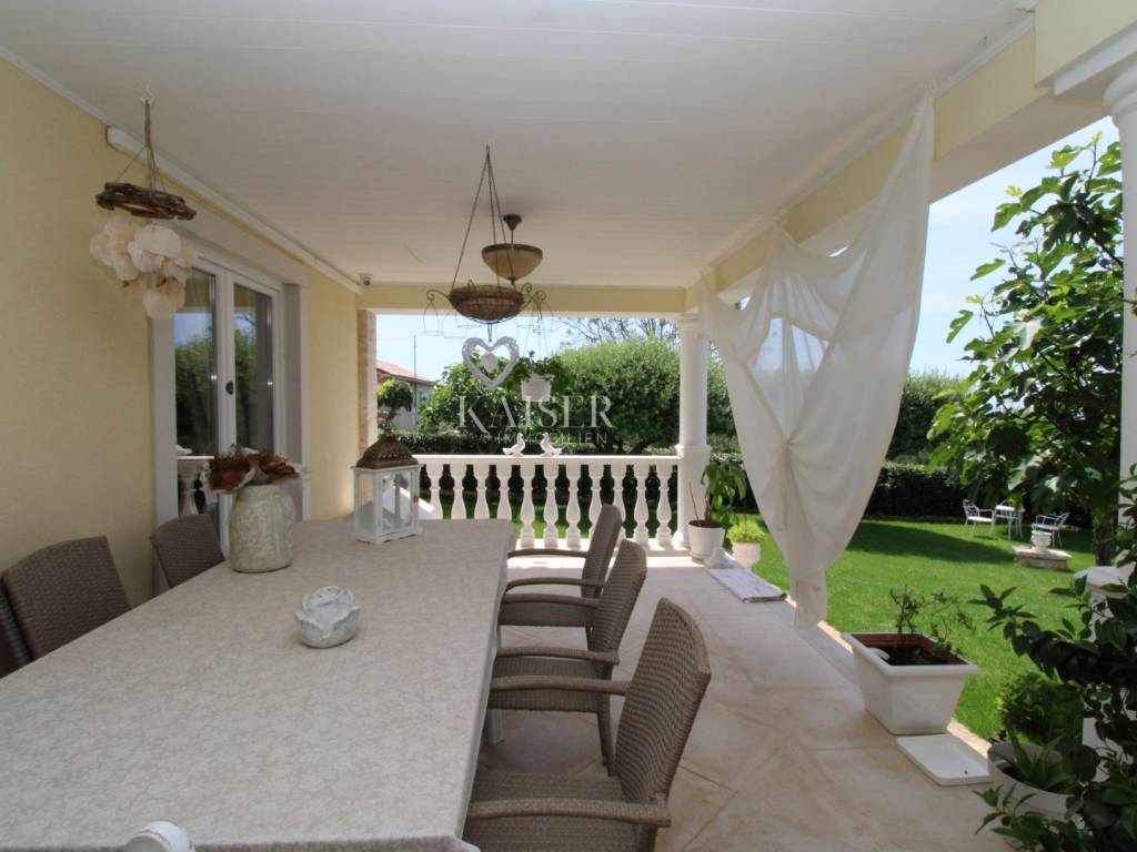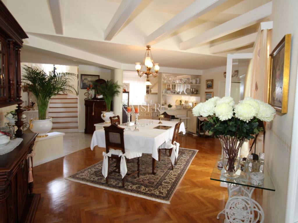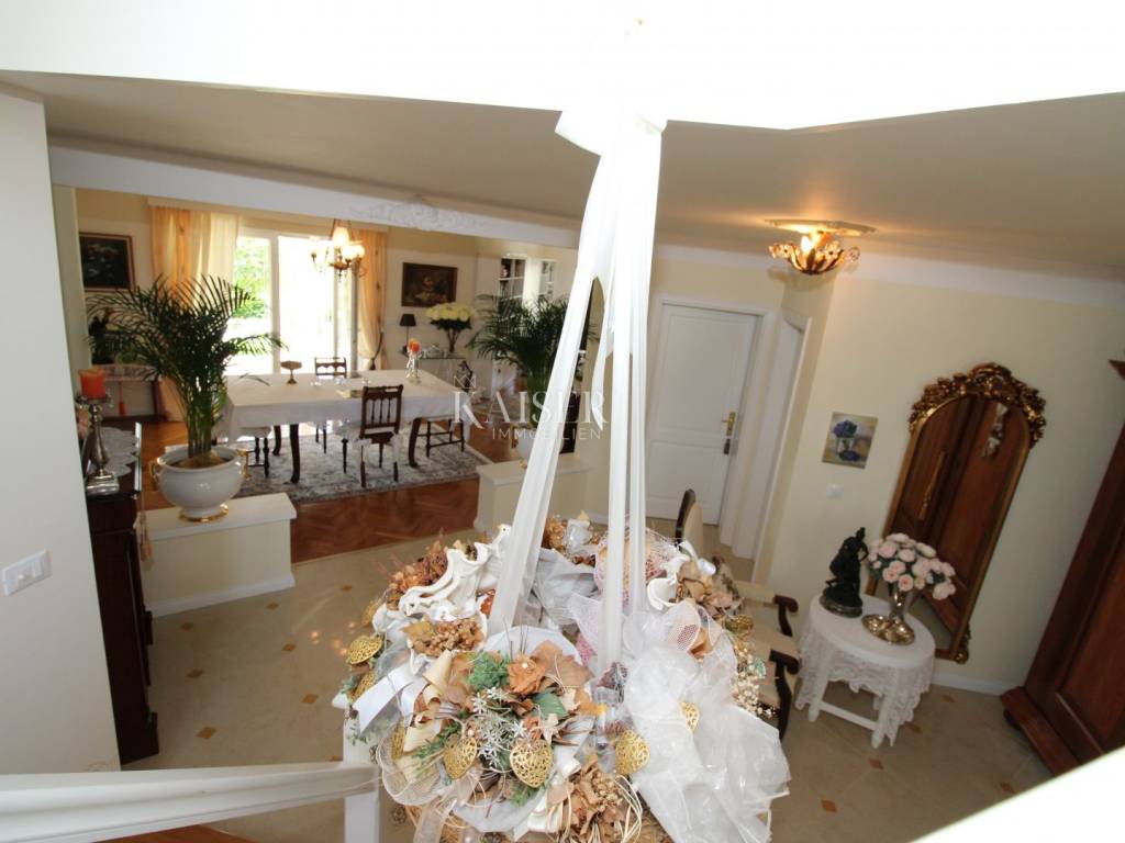 Kaiser Immobilien offers for sale a unique, imposing stone villa near the town of Poreč. On the west coast of Istria, with an enchanting view of the blue sea and the green landscape nearby, this real beauty is located among the villas, only 13 km from Poreč and the first beaches. The villa is located on an independent plot of 826 square meters, in a small autochthonous Istrian area that promises harmony of life and peace of everyday life. Access to the villa is provided by an asphalt road with all the infrastructure in the courtyard of the villa. This imposing, stone villa with a true Mediterranean flair is 265.86 square meters of gross surface area. The villa is surrounded by a beautiful covered terrace with a unique view of the sea with a constant breeze that will ensure your stay is pleasant. The exterior of the villa is decorated with a beautiful garden, which the owners take special care of and put a lot of effort into the appearance of the botany and landscaping of the yard. There are olive trees, fig trees, green ornamental plants, and the entire yard is surrounded by a well-kept, overgrown hedge. The biggest attraction of this beautiful environment was definitely the pond with a beautiful appearance, which is connected to the yard via a special wooden bridge. The entire yard is illuminated, as are the olive trees. In the yard there is also a wooden garden house and a summer kitchen. The entire yard is irrigated via an irrigation system. Upon entering the villa, we encounter a wonderful entrance hall carefully designed by the owner, as well as the entire residential area. There is an entrance hall, a living room with a view of the sea, a dining room with a view of the sea and the garden, a kitchen and a specially designed bedroom with its own bathroom, a guest toilet and a separate space for shoes. The entire space is decorated with special furniture and design elements, special decorative walls and other details that the owners are particularly proud of. The living room is decorated with a beautiful fireplace that will surely provide you with a wonderful winter atmosphere in the Mediterranean region. Vertical communication between the ground floor and the first floor is achieved by an internal, wooden, winding staircase. On the floor of the villa there are two more bedrooms, one a little smaller and one bigger. The larger bedroom has its own bathroom and its own imposing covered balcony with an enchanting view of the sea. The owners leave the bed and built-in wardrobe for sale. In the entire villa, the owners leave all the built-in wardrobes in the lower bedroom, complete built-in equipment, sanitary facilities and a complete kitchen. The heating system in the villa is installed via floor heating on the ground floor, and radiators on the first floor of the villa (gas central heating). The villa is fully equipped with air conditioners, cameras and alarms. The villa contains a water purifier for the whole house and one separate water purifier for drinking in the kitchen. The 2700 m3 gas tank is located on the plot, buried underground. The villa has the possibility of 4 parking spaces, 2 in the yard, 2 outside the yard. The swimming pool in the yard has never been built, but it is included in the building permit, with a gross area of 23.75 m2 in length and a depth of 130 - 150 m. Distance of the property to the city: Poreč - Pula Airport, 45 km Poreč - Ljubljana, 162 km Poreč - Vienna, 544 km Poreč - Prague, 868 km Poreč - Munich, 565 km If you plan to start your new life in Istria, and this imposing Mediterranean villa is the right choice for you, allow us to start a new chapter of your life together with you and contact us at phone number 00385 923782803, or at the email address: ivana@kaiser-immobilien.hr. Agency commission is 3% + VAT.