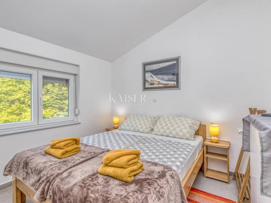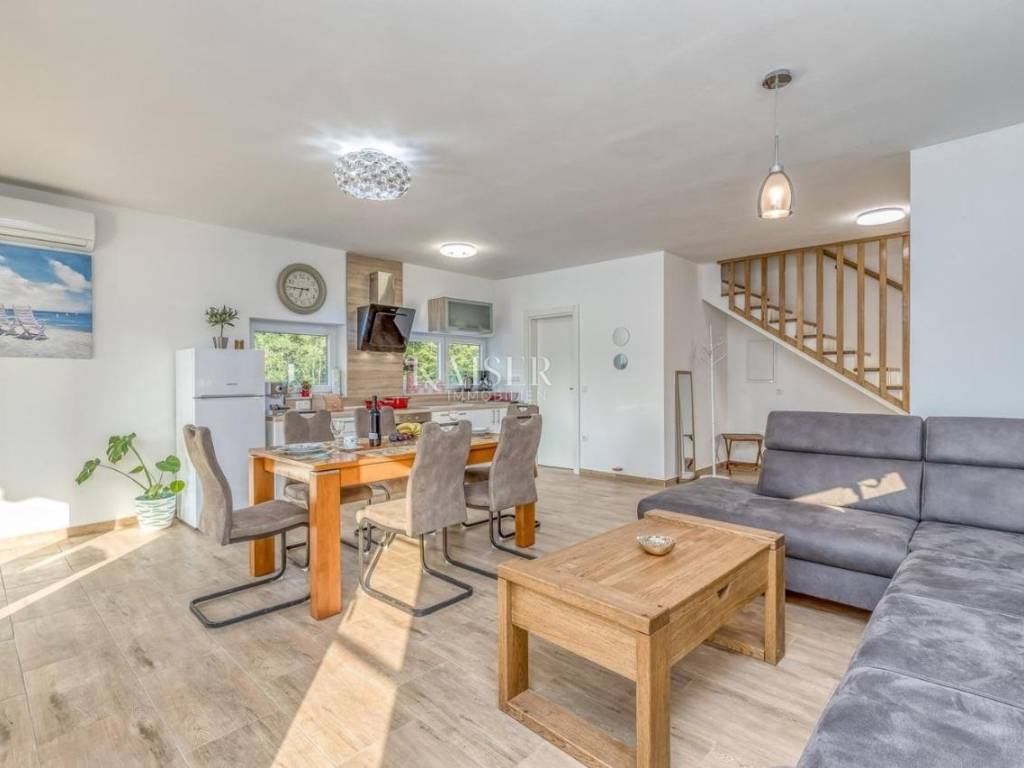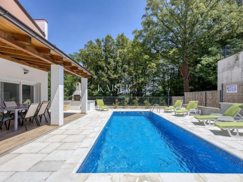 Kaiser Immobilien presents a unique opportunity located in the heart of Istria. The property consists of two semi-detached houses. Each house offers its own swimming pool and landscaped garden. The houses are furnished and ready for occupancy. Each house consists of 75 m2 of living space and 255 m2 of landscaped yard. The ground floor is an open space intended for a kitchen and dining room with a living room and storage room. The space for socializing is separated from the pool and its sunbathing area by glass walls, which allows you plenty of sunlight. On the first floor there are two bedrooms, a bathroom and a laundry room. One of the bedrooms offers its own terrace with a view of the greenery of the area and the swimming pool. The space is well used and modernly decorated, providing everything you need for a comfortable life. The house offers a pellet heating system and air conditioning. The property is a great opportunity to buy an investment or a home, its location allows for a multitude of opportunities and occupations. It is located in central Istria and is very well connected to larger cities and numerous beaches and coves. The city of Pula is a 45-minute drive away, the city of Poreč is a 20-minute drive away, while the city of Opatija is an hour's drive away. The price refers to both houses as a set, it is not possible to buy one object. The houses are separated into two independent parcels. For more information, contact an agent.
