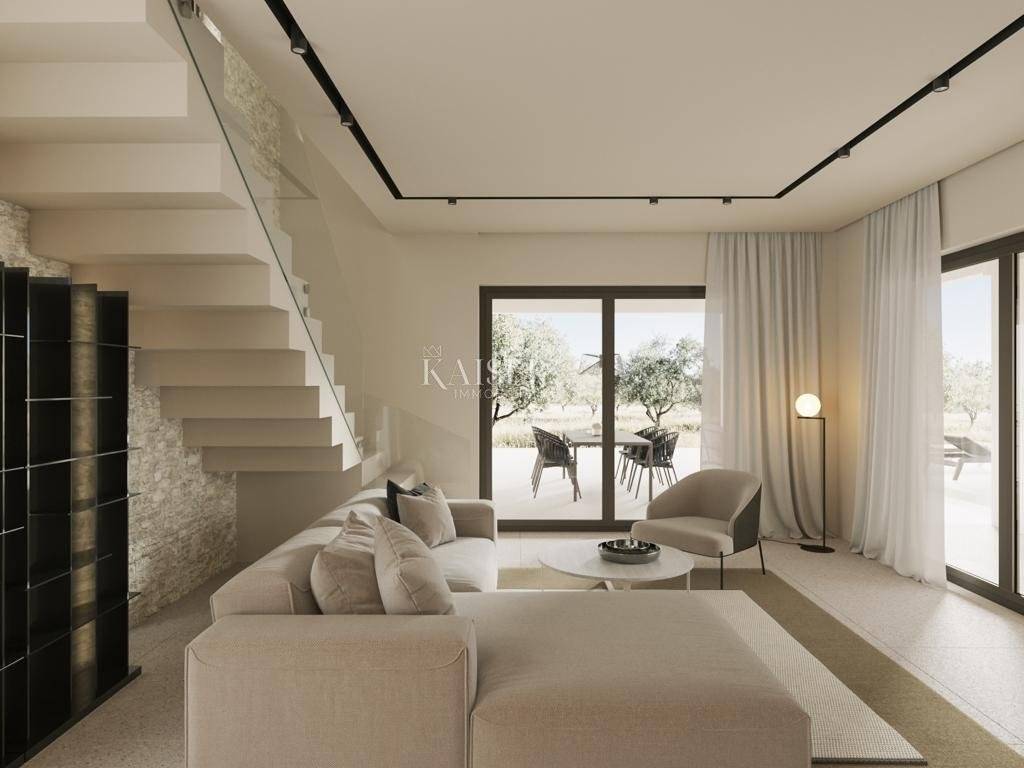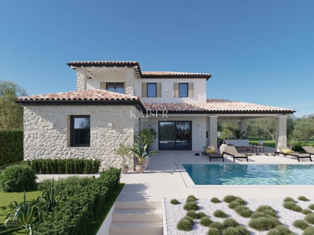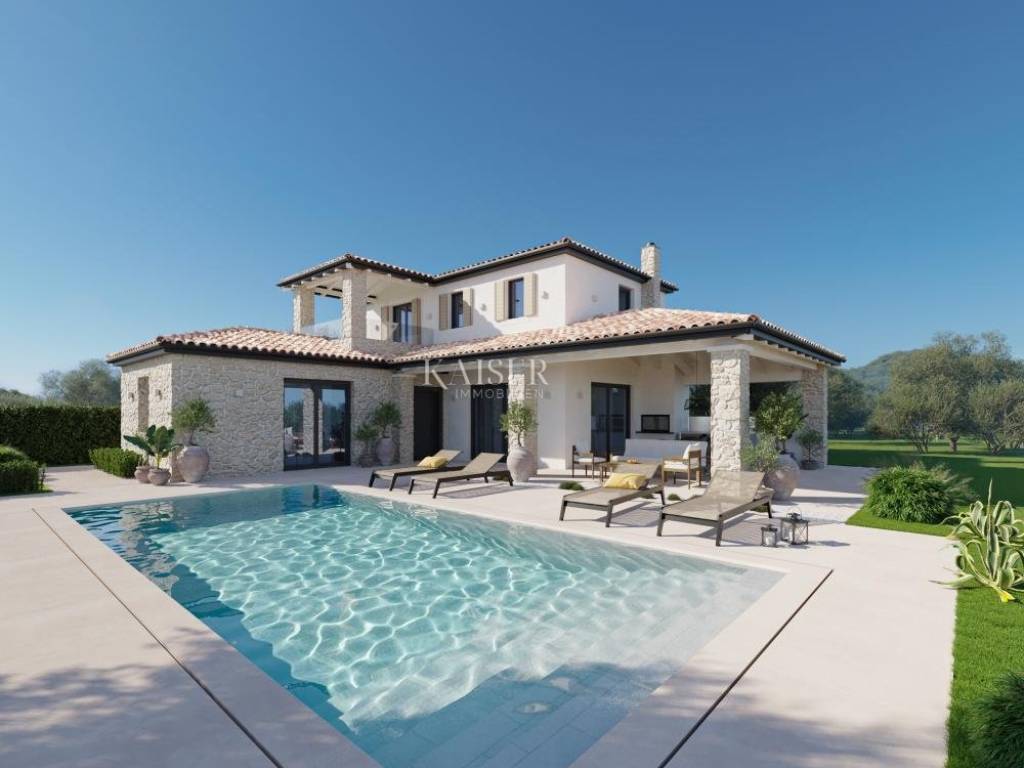 Kaiser Immobilien offers for sale an exclusive villa in a very quiet area only 5 km from the city of Poreč. Due to its south-facing location, the villa gets a lot of sun and a view of the sea. It is located on a 600m2 plot of land. The villa is detached and consists of a ground floor and an upper floor. On the ground floor there is an entrance area, a kitchen of Italian design with an extremely high quality and modern appearance. From the living room of 43.45 m2 you can access the outdoor covered terrace with a summer kitchen, lounge furniture for enjoying and overlooking the pool, a heated pool of 42 m2 with a sun deck. On the ground floor there is also a bedroom with its own bathroom, a guest toilet and a technical room. Upstairs there are two bedrooms with their own bathrooms, one of them has access to a covered terrace with a beautiful view of the sea. The price of this beautiful and high-quality villa, where every detail has been worked out with great attention to perfection, includes a Cesaru brand kitchen worth 50,000 euros. The rest of the house is equipped with special designer furniture. The house is in the final phase, the environment in which the olive trees are 150 years old is being completed. Everything will look like on the renders. Underfloor heating throughout the house via a heat pump. Air conditioners in all rooms for cooling. An excellent property for family life in a quiet location close to the center of Poreč or a good investment opportunity. Distance of the property to the city: Poreč - Pula Airport, 48 km Poreč - Ljubljana, 159 km Poreč - Vienna, 541 km Poreč - Prague, 865 km Poreč - Munich, 561 km The intermediary commission of the agency for the buyer is 3% + VAT. For additional information and viewing, contact your agent at email: dean.cvitko@kaiser-immobilien.hr or phone number: 00385 91 5284449