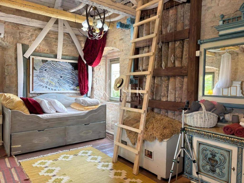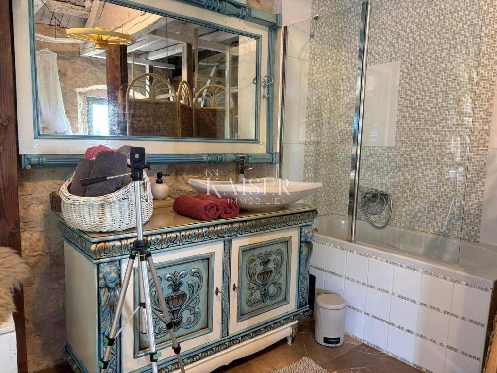 Kaiser Immobilien agency offers a beautiful furnished stone villa with a swimming pool located near the sea, in the small town of Krnica, in the immediate vicinity of Marčana. Krnica is located on the eastern coast of Istria, offering a unique combination of natural beauty, rich history, excellent cuisine and a warm community spirit. It attracts with its picturesque views and rich cultural heritage. The ancient sights of the town, such as the Church of St. Roch, testify to its ancient past. Nature lovers will find themselves here. From hiking trails winding through green forests to beautiful untouched beaches along the nearby coast, there is no shortage of adventure here. Boat trips offer a unique perspective, allowing visitors to explore hidden coves. The house is located in a quiet street, surrounded by only a few houses and a park in the immediate vicinity. It extends over 145 m2 of living space through the ground floor, first floor and high attic, it is located on a landscaped plot of 100 m2 where there is a swimming pool, a beautiful relaxing terrace, a garden and one parking space. On the ground floor there is a spacious living room with a fireplace, a dining room and a fully equipped kitchen. The stairs lead to the first floor where there are two comfortable bedrooms and a bathroom. On the second floor there is a large room designed as a combination of a bedroom and a study with a bathroom. A perfect place to relax or work from home. The interior is decorated carefully and with a lot of style, as a combination of traditional and Mediterranean style, and brings a dose of Istrian charm and warmth, and provides all the comfort and convenience of today. The beautiful unique atmosphere of the interior and the tranquility and privacy of the exterior make this property unique, the proximity of the sea desirable for rest and relaxation. Marčana: 10 km Pula airport: 19 km Pula: 24 km Poreč: 60 km Rovinj: 40 km Zagreb airport: 264 km Koper: 110 km Ljubljana: 190 km Munich, Vienna: 600 km The agency commission for the buyer is 3% + VAT, and is paid only when the property is sold, upon signing the first legal deed. For all further information, please contact: Marijana Cuculić Phone: + 385 98 186 9950 WhatsApp, Viber E-mail: marijana.cuculić@kaiser-immobilien.hr