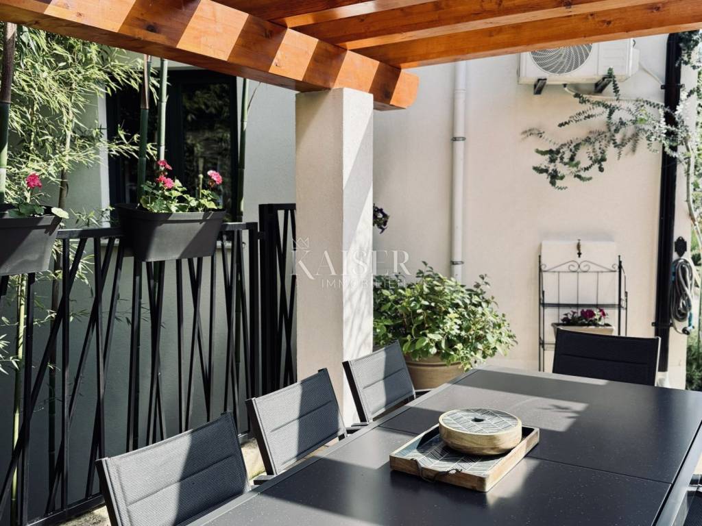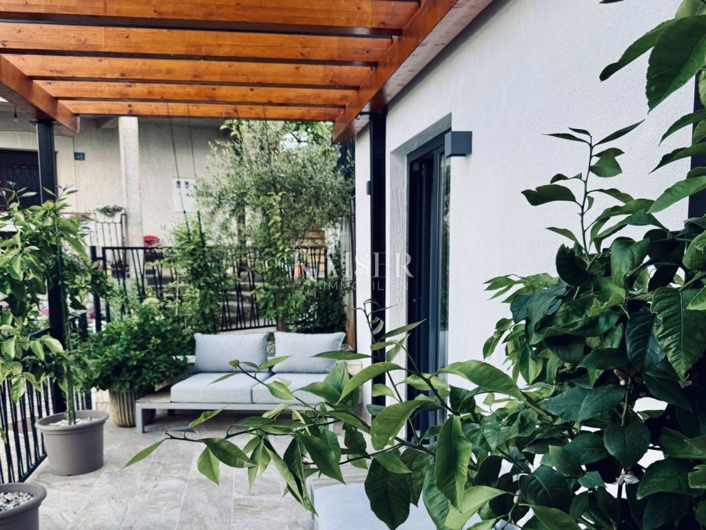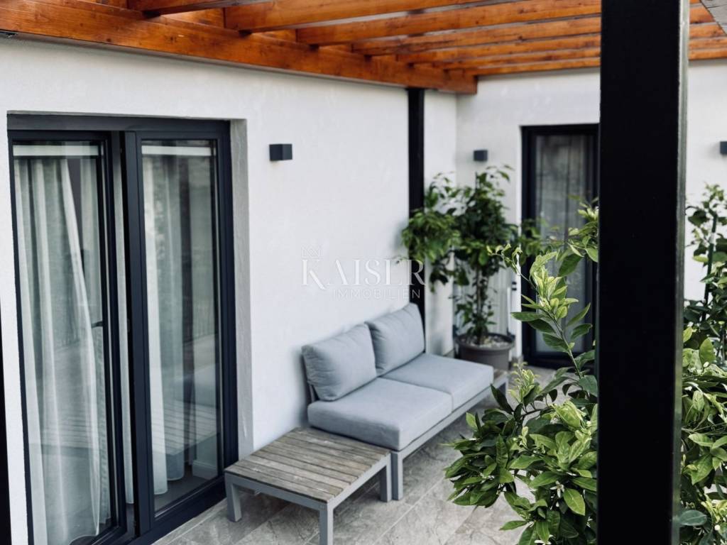 In front of the house there is a smaller but beautifully landscaped garden with lots of Mediterranean greenery, and the house therefore has more of the character of an apartment with additional outdoor space, which is a concept very suitable for occasional / seasonal use or ideal for people who do not want or cannot devote too much time to taking care of their garden. However, there is more than enough space available, including a beautiful summer kitchen with a barbecue, a pergola with seating and a very practical storage area. On the sea side, the house has two large terraces, so there is really no shortage of outdoor space.