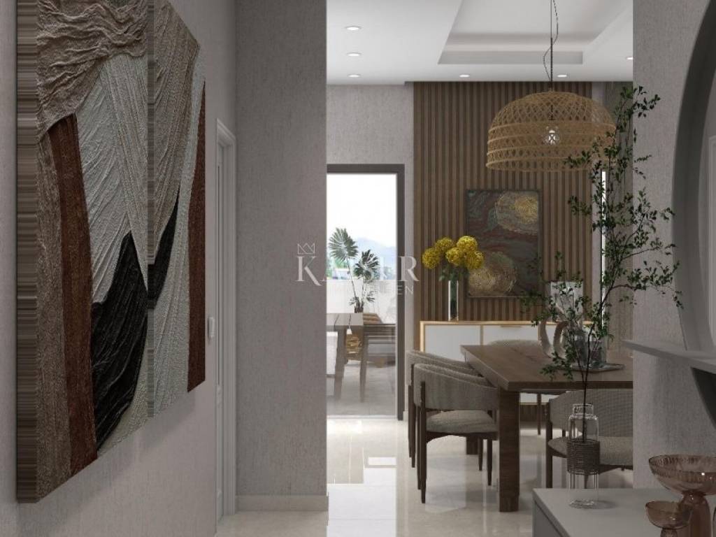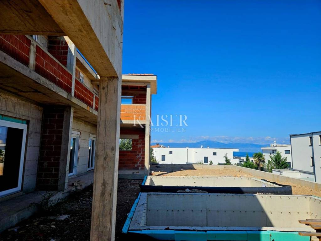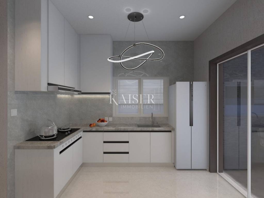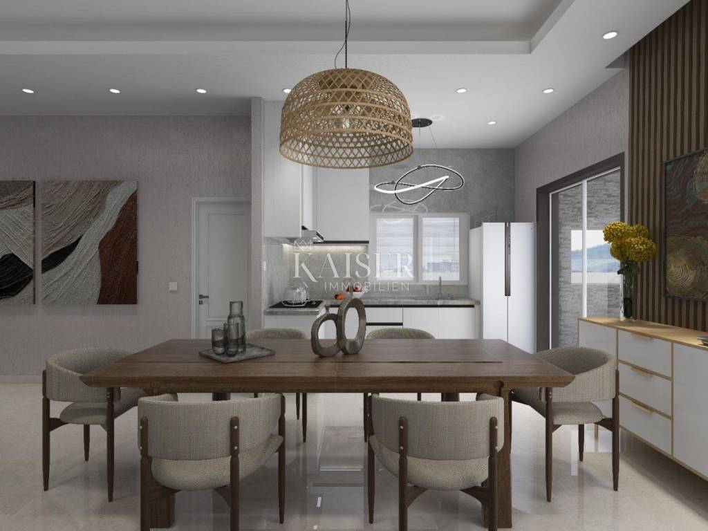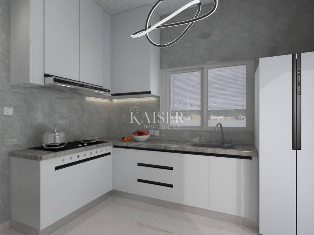 Kaiser immobillien is mediating the sale of an exclusive two-storey apartment in an exceptional location, just 200m from the sea, in Malinska on the island of Krk. This luxurious apartment with a total net living area of 165m2 is located in a building with two residential units, consisting of a ground floor, first floor and basement, and the building offers a fantastic view of Malinska and the Kvarner Bay. On the ground floor, with an area of 77m2, there is an entrance hall, an open-concept living area that includes a living room, kitchen and dining room, a guest bathroom and one bedroom with a private bathroom. The living room has a fireplace for a cozy winter atmosphere, and the living room opens onto a covered terrace, an ideal place to enjoy summer sunsets and socialize with friends. An internal staircase leads to the first floor where there are three bedrooms. The master bedroom has its own "en suite" bathroom, "walk in" wardrobe, and direct access to the terrace with panoramic sea views. There is also a kitchenette on the first floor, ideal for morning rituals and enjoying the sounds and smells of the sea and the Mediterranean. The property also has a basement that serves as a storage room, which can be reached by an internal staircase. The landscaped garden has a 6 x 3.5m swimming pool with a sunbathing area, a garden fireplace, and three parking spaces. Top-quality materials and equipment are used in the construction and furnishing, and the planned completion of the works is expected by the end of 2025. Note: There is currently a possibility of choosing tiles and other interior design during the construction phase. The agency commission for the buyer is 3% + VAT and is paid in the case of purchasing a property, upon conclusion of the first legal act. ID CODE 105-285