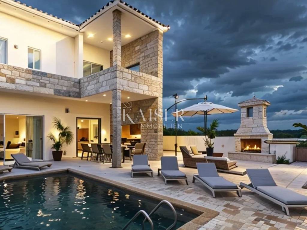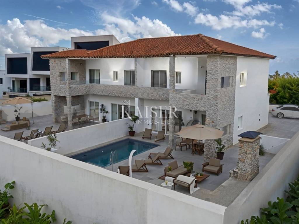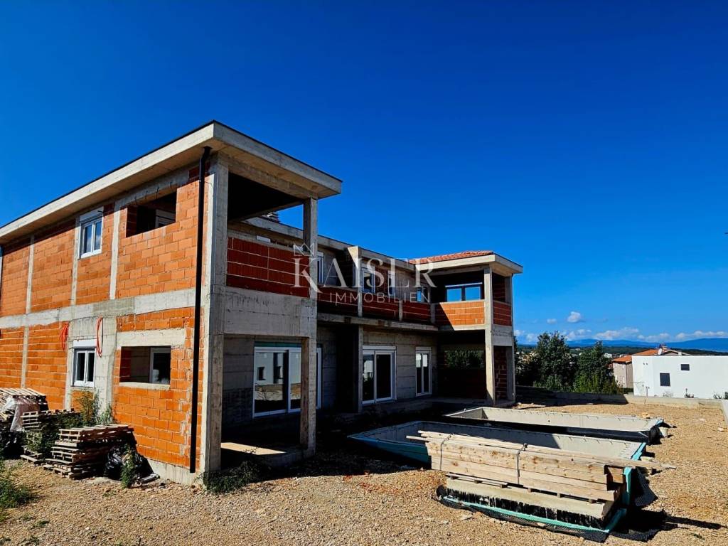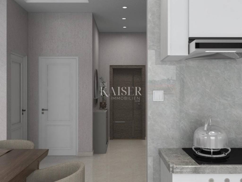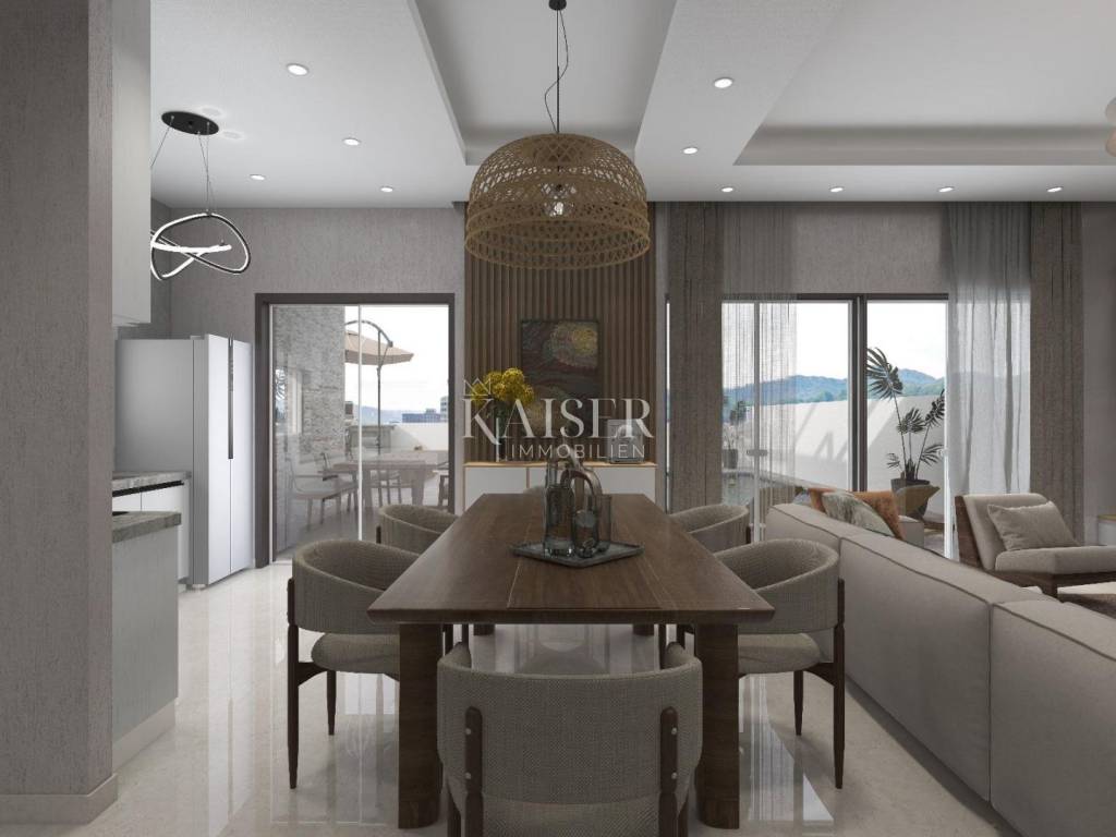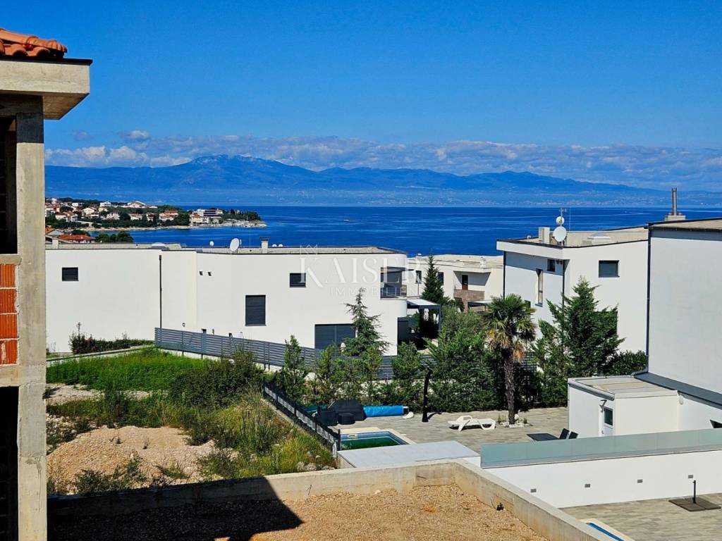 Kaiser immobillien is mediating the sale of an exclusive two-storey apartment in an exceptional location, just 200m from the sea, in Malinska on the island of Krk. This luxurious apartment with a total net living area of 165m2 is located in a building with two residential units, consisting of a ground floor, first floor and basement, and the building offers a fantastic view of Malinska and the Kvarner Bay. On the ground floor, with an area of 77m2, there is an entrance hall, an open-concept living area that includes a living room, kitchen and dining room, a guest bathroom and one bedroom with a private bathroom. The living room has a fireplace for a cozy winter atmosphere, and the living room opens onto a covered terrace, an ideal place to enjoy summer sunsets and socialize with friends. An internal staircase leads to the first floor where there are three bedrooms. The master bedroom has its own "en suite" bathroom, "walk in" wardrobe, and direct access to the terrace with panoramic sea views. There is also a kitchenette on the first floor, ideal for morning rituals and enjoying the sounds and smells of the sea and the Mediterranean. The property also has a basement that serves as a storage room, which can be reached by an internal staircase. The landscaped garden has a 6 x 3.5m swimming pool with a sunbathing area, a garden fireplace, and three parking spaces. Top-quality materials and equipment are used in the construction and furnishing, and the planned completion of the works is expected by the end of 2025. Note: There is currently a possibility of choosing tiles and other interior design during the construction phase. The agency commission for the buyer is 3% + VAT and is paid in the case of purchasing a property, upon conclusion of the first legal act. ID CODE 105-285