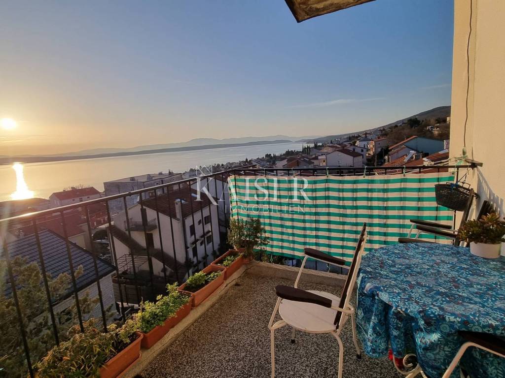 Kaiser Immobilien presents a two-bedroom apartment near the center of Crikvenica with a total living area of 66.95 m². The apartment consists of two bedrooms, a spacious living room, a kitchen with a dining room, a bathroom and a hallway. The apartment also has a spacious balcony with a panoramic view of the sea, the island of Krk, Učka and Velebit. The balcony can be accessed from the living room and the kitchen. Each bedroom has a French balcony, and the dining room has its own French balcony. The apartment also has its own 25 m² garage, which provides security and convenience in the city center, where parking is often limited. In addition, the apartment also has a 4.5 m² woodshed, ideal for additional storage. Tenants are also allowed to use the attic space and a shared roof terrace, which offers an even more spectacular view of the sea and the whole of Crikvenica. Heating is provided by electric radiators, and thanks to the existing chimney, there is a possibility of installing an alternative heating system. Furniture is available by arrangement, which leaves flexibility to adjust according to your own wishes. The apartment is 300 meters from the city center and the beaches. An ideal opportunity for living or vacation. Thanks to its proximity to the sea, spectacular views, excellent location and garage, it represents a rare opportunity on the market. Distance from the property: Novi Vinodolski - 9km Rijeka - 35km Zagreb - 160km For all questions, please contact the agents: Lado Patekar lado@kaiser-immobilien.hr +00 385 91 939 0220 WhatsApp, Viber Davor Piškulić davor@kaiser-immobilien.hr +00 385 95 583 8240 WhatsApp, Viber