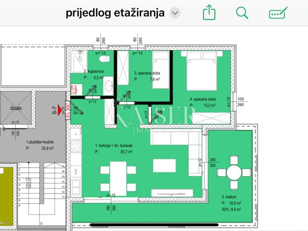 Kaiser Immobilien presents you a luxurious two-bedroom apartment on the second floor with a large roof terrace in Zadar, Diklo district, 50 meters from the sea and with a beautiful sea view. Diklo is a famous Zadar district that stretches along the sea, west of the city center. It is popular for its attractive coastline, beautiful sunsets and proximity to all urban amenities. Diklo is a favorite location for family life, but also an excellent opportunity for investment in tourism due to the high demand for luxury accommodation by the sea. The proximity to all amenities and a beautiful view of the Zadar Channel make this location one of the most desirable on the Zadar Riviera. Apartment S7 on the second floor has a net usable area of 66.50 m2, while the total area with the annexes is 94.58 m2. LAYOUT AND AREA: Kitchen with dining room and living room 30.74 m2 Bathroom: 5.50 m² Bedroom 1: 13.16 m² - spacious and bright Bedroom 2: 7.59 m² - ideal for guests or children Balcony: 18.91 m² - suitable for dining and relaxing ROOF TERRACE 80.98 Storage room: included in the ownership 2 outdoor parking spaces included in the price FEATURES AND EQUIPMENT: New construction in the final phase - move-in summer 2025. Modern architecture and functional layout Top-quality building materials and finishes Air conditioning in all rooms Aluminum joinery with triple-layered glass High-quality ceramics, parquet floors and sanitary ware Energy class A Apartment S7 is sold unfurnished, ideal for decorating according to your own wishes. THE BUYER DOES NOT PAY REAL ESTATE TRANSFER TAX. The agency commission for the buyer is 3% + VAT and is paid in the case of purchasing a property, upon conclusion of the first legal act. Contact us with confidence for more information and to arrange a viewing. Tel: +385915404646 Email: vedran@kaiser-immobilien.hr