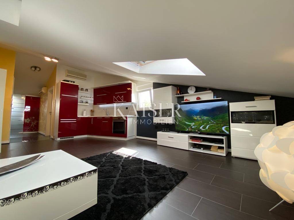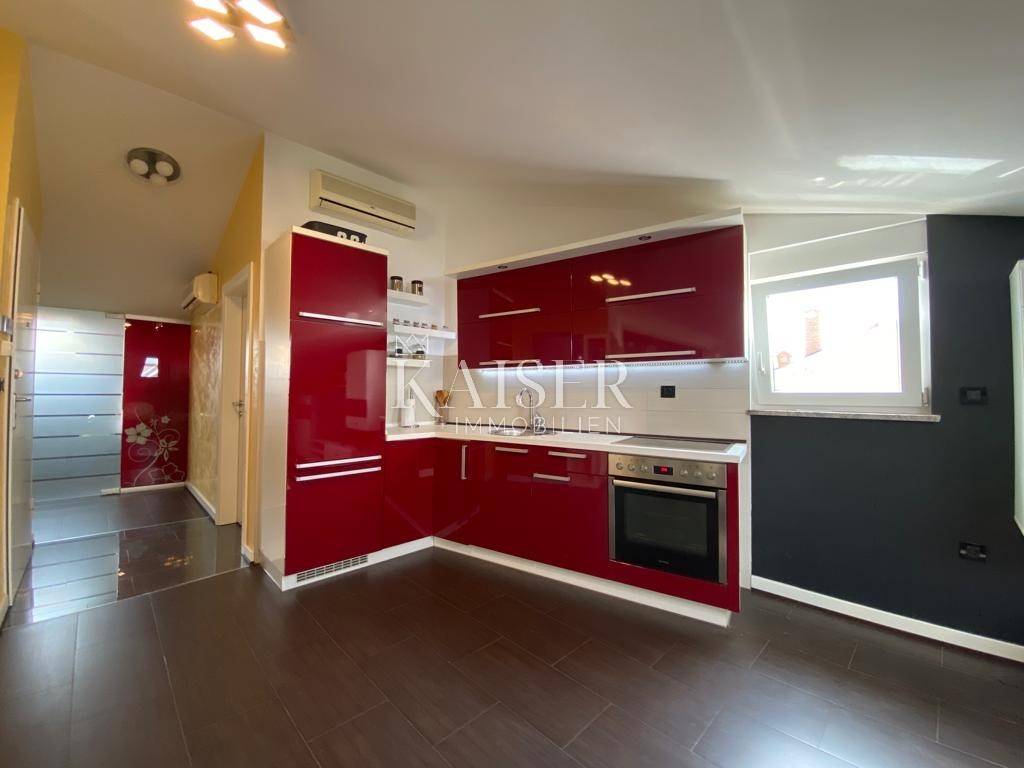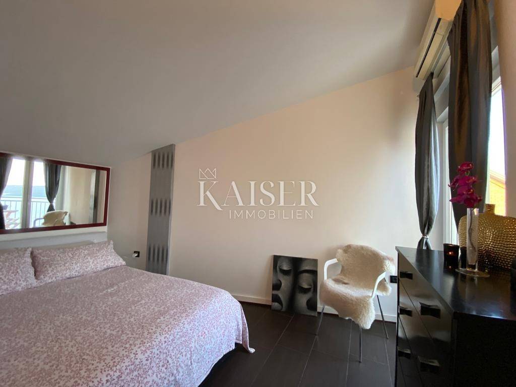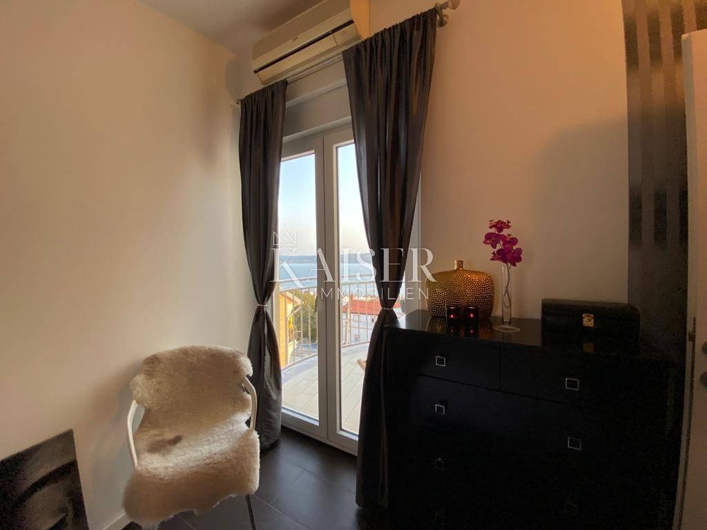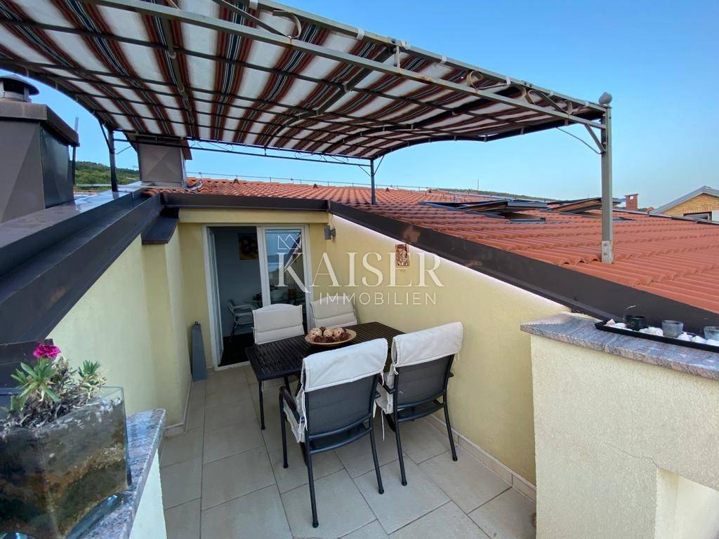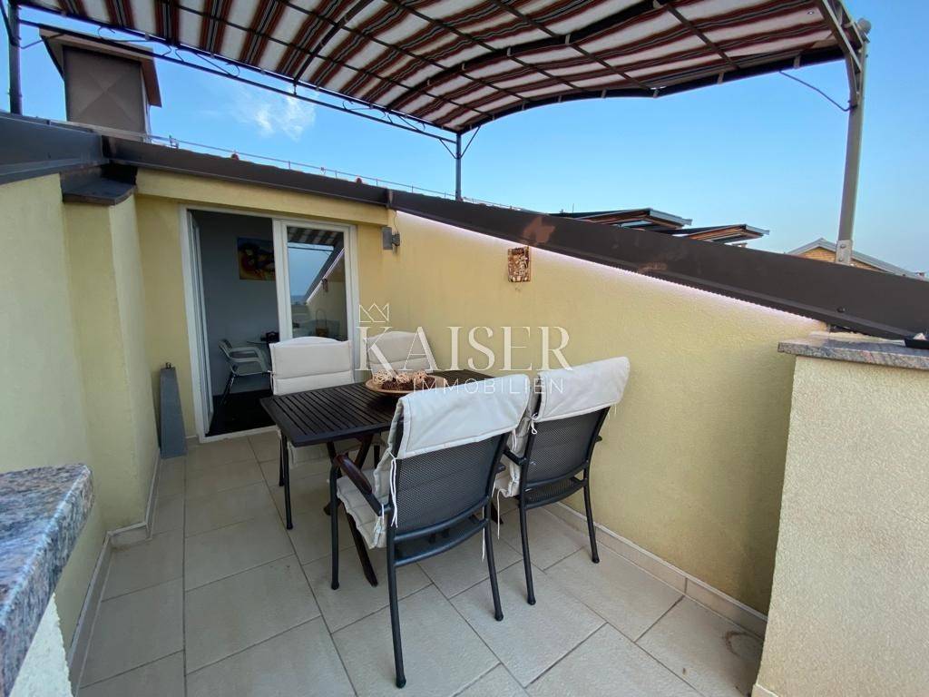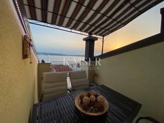 Kaiser Immobilien offers an apartment in a high-quality building. The apartment is located on the third floor, and consists of a hallway, kitchen, dining room, bathroom, living room, two bedrooms, and two terraces of 25 m2. from which there is a beautiful panoramic view. The apartment and the internal staircase are equipped with high-quality Italian ceramics. The walls of the apartment and the staircase are plastered, and the apartment has velux skylights with anti-reflective mesh, granite treads, electric blinds, video surveillance... The apartment has an anti-allergic vacuum cleaner (air vacuum). The apartment has a parking space, a storage room, 1/7 of the garden. The apartment is in a great location, and the building is neat and beautiful. A few minutes' walk to the sea.