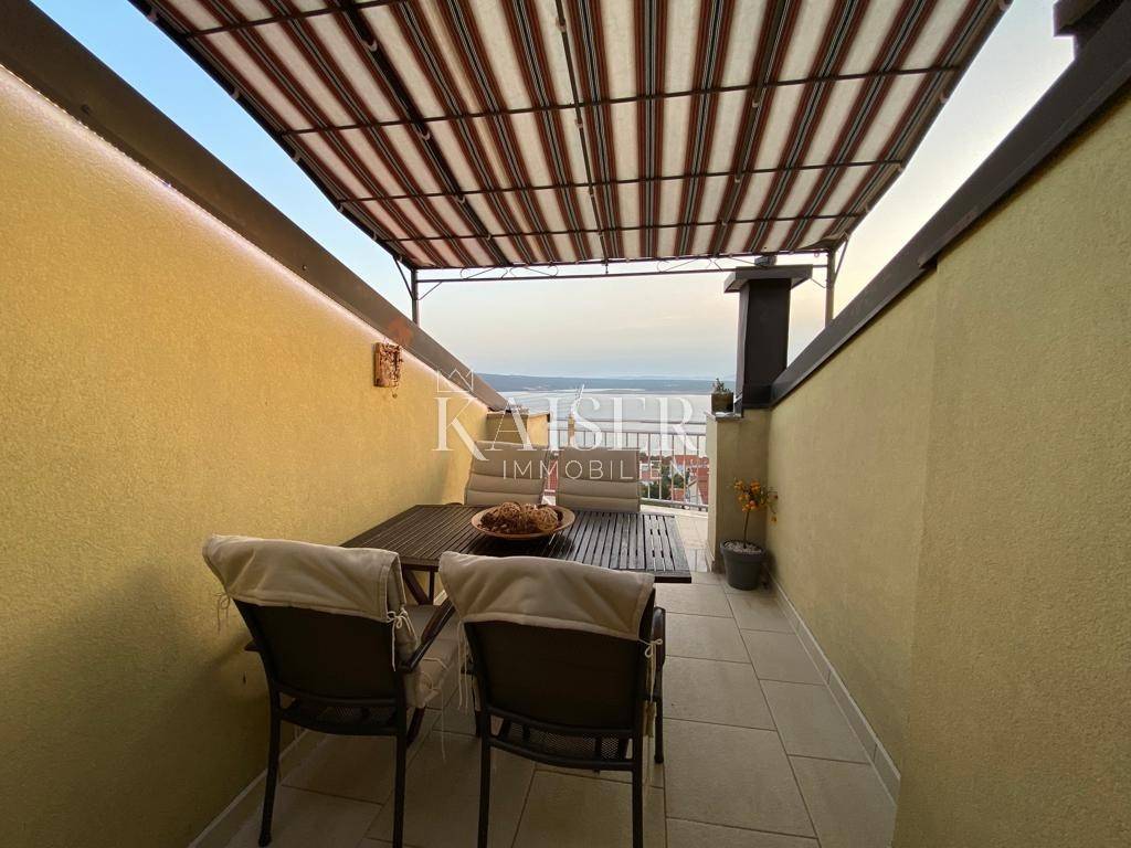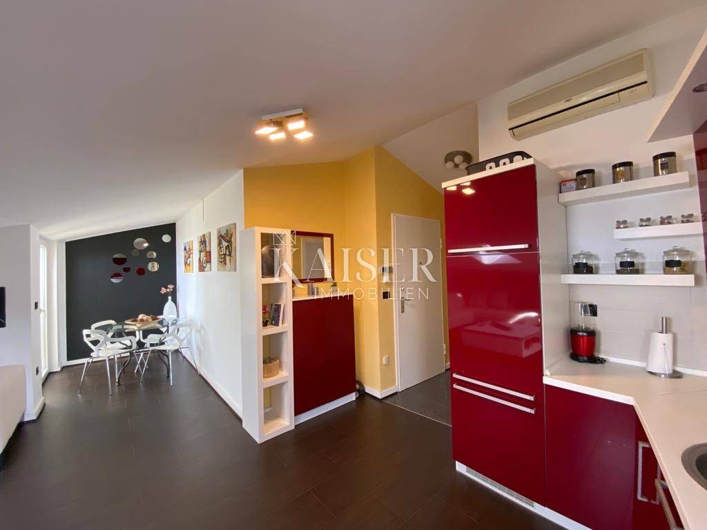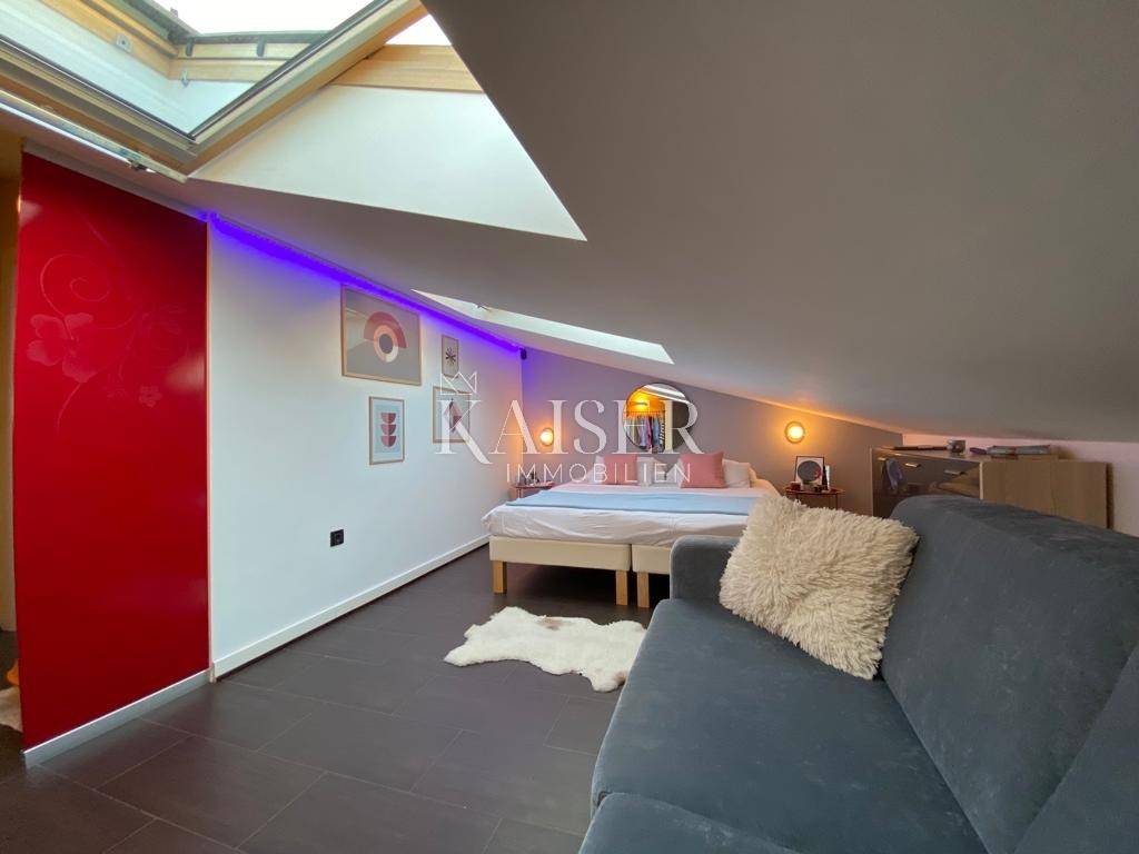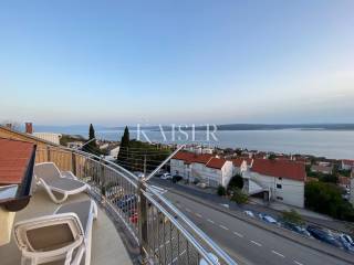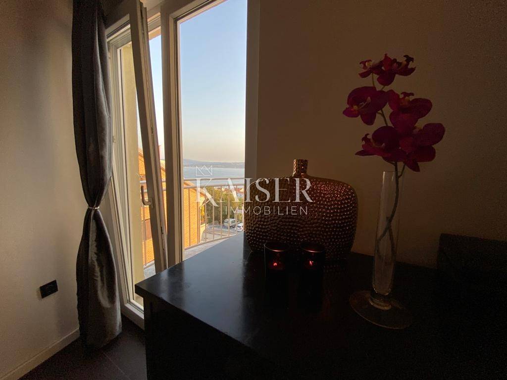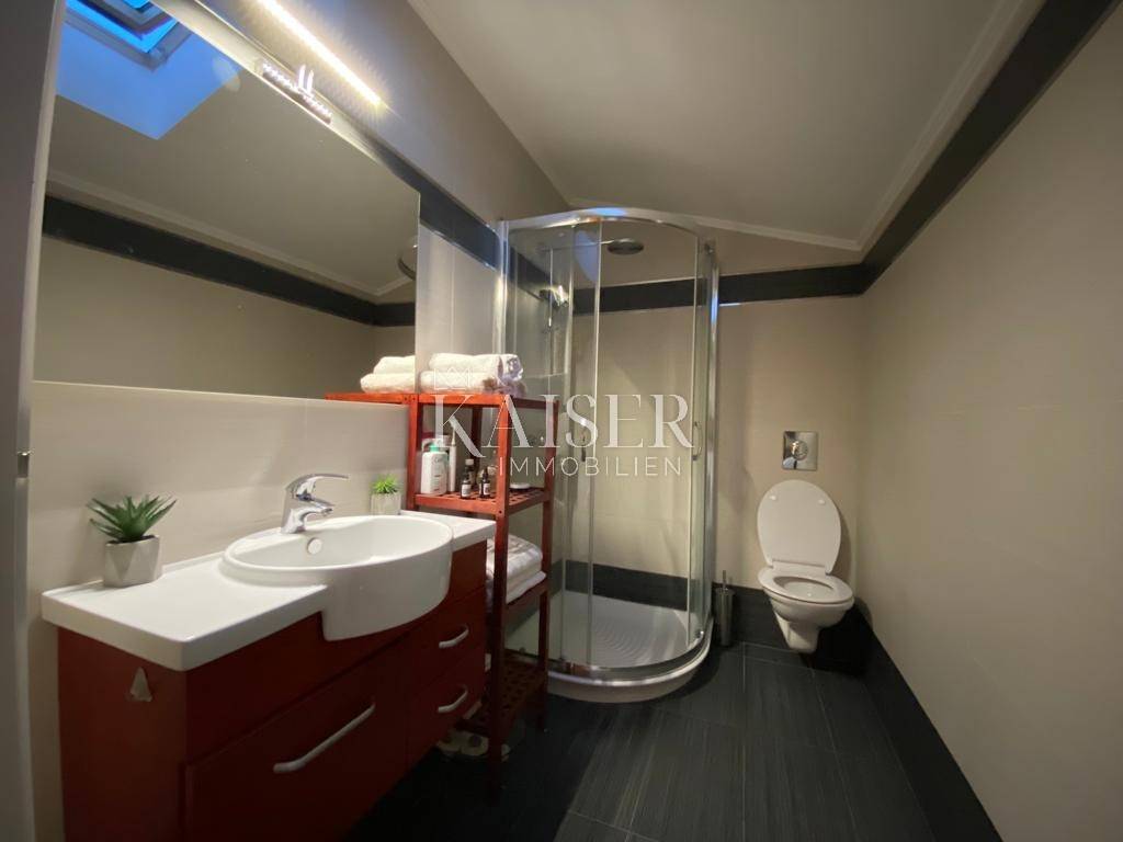 Kaiser Immobilien offers an apartment in a high-quality building. The apartment is located on the third floor, and consists of a hallway, kitchen, dining room, bathroom, living room, two bedrooms, and two terraces of 25 m2. from which there is a beautiful panoramic view. The apartment and the internal staircase are equipped with high-quality Italian ceramics. The walls of the apartment and the staircase are plastered, and the apartment has velux skylights with anti-reflective mesh, granite treads, electric blinds, video surveillance... The apartment has an anti-allergic vacuum cleaner (air vacuum). The apartment has a parking space, a storage room, 1/7 of the garden. The apartment is in a great location, and the building is neat and beautiful. A few minutes' walk to the sea.