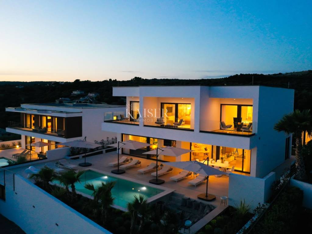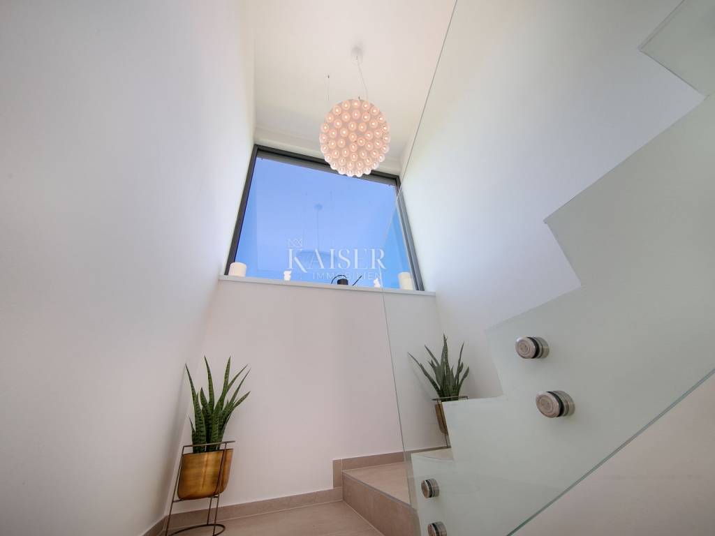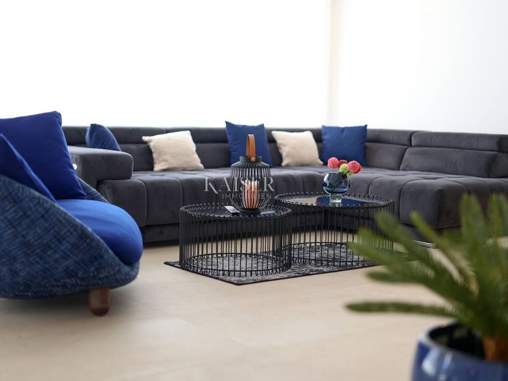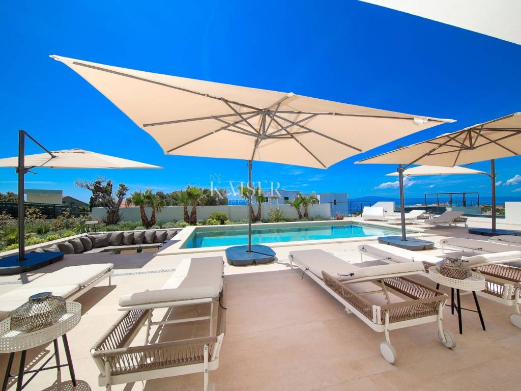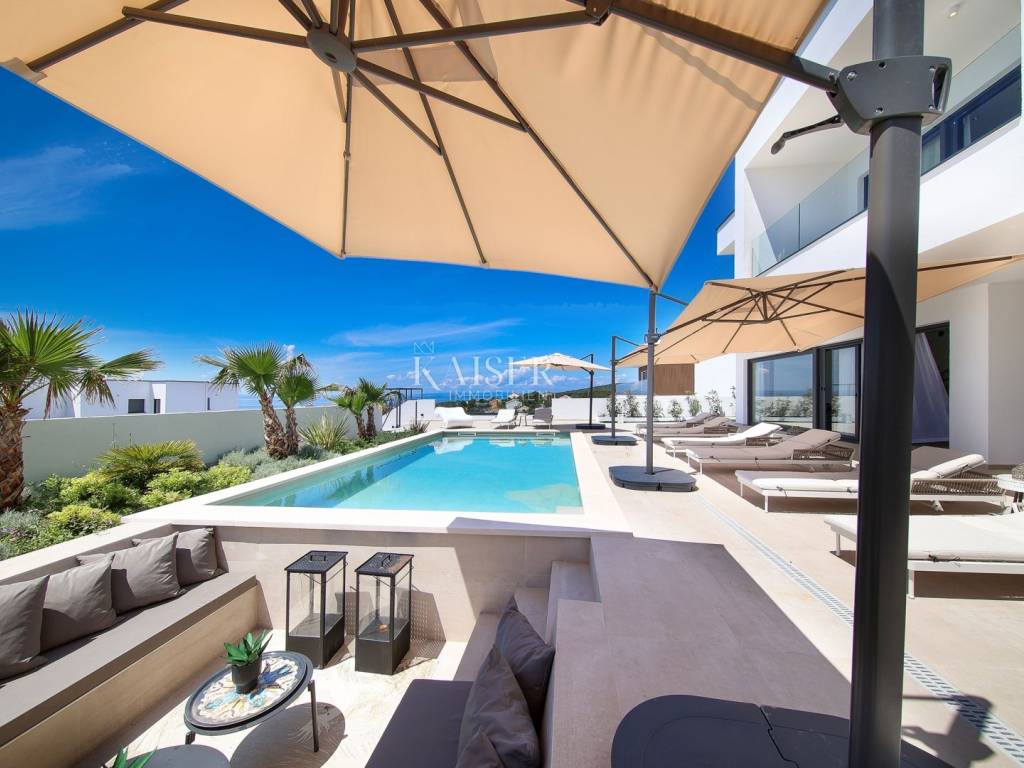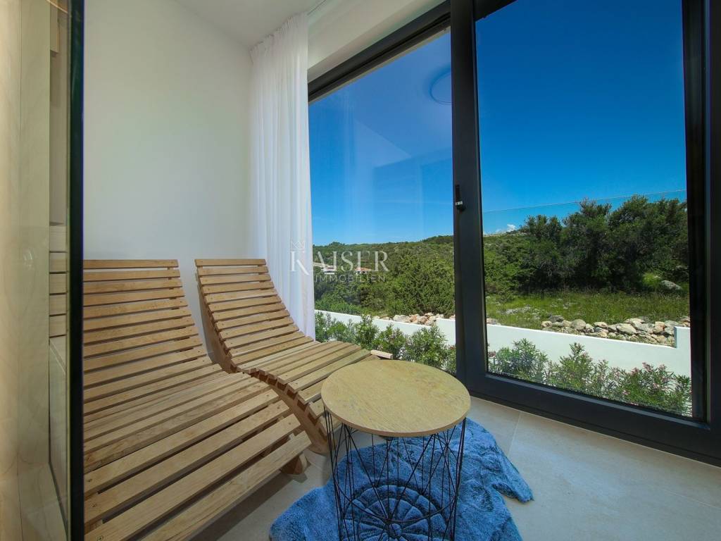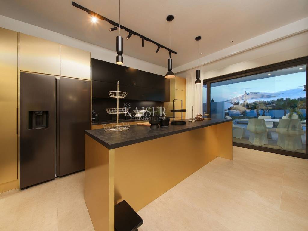 Kaiser immobilien mediates the sale of a beautiful, modern, newly built villa, located close to the coast and with an enchanting view of the sea, in Jakišnica on the island of Pag. Pag is located in the northern Adriatic and is the fifth largest Croatian island of exceptional natural beauty, and with a coastline of 302 km, it is the most indented island of the Adriatic. It is connected to the mainland by a bridge and a ferry, so the island can be reached from Zadar on the south side by a 340 m long bridge, or by ferry to Žigljen on the north side of the island, from the port of Prizna. The two most popular products that Pag gave to Croatia (and the rest of the world) are Pag cheese and Pag lace. Pag cheese is a type of hard cheese made from sheep's milk and is one of the most famous cheeses that can be found on markets inside and outside Croatia. Pag lace is a type of unique lace originating from Pag, and in 2009 it was added to the UNESCO list of intangible cultural heritage. Exclusively equipped villa with a total living area of 305m2, located on a plot of 804m2, divided into two floors. On the ground floor there are two bedrooms, two bathrooms, a storage room and a spacious open-plan living area of 77m2, which includes a living room, kitchen and dining room. The living area is dominated by panoramic windows with an open view of the sea, and there is also a modern, fully equipped kitchen with high-quality appliances and an island for food preparation. An internal staircase leads to the first floor where there are three spacious bedrooms, each with access to the terrace and loggia, and an additional area with a sauna. The bedrooms are decently decorated, and each has its own modern bathroom with luxurious details. In the construction and furnishing, top-quality materials and equipment were used, so that the object is equipped, among other things, with Schüco aluminum carpentry in 3 layers with 7.5 cm thick profiles, Mitsubishi inverter air conditioners in all rooms, underfloor heating, top-quality ceramics and parquet floors, Moooi chandeliers and Intralight lighting. The facility has video surveillance. There is a 32m2 heated infinity swimming pool in the landscaped garden, a sunbathing area, a relaxation area, and there is also a fully equipped gym. The parking lot is private, with space for 4 vehicles. The villa was built in 2024, it is sold furnished and equipped, it is located in a quiet location near all important amenities. The commission of the agency for the buyer is 3% + VAT and is paid in case of real estate purchase, when the first legal deed is concluded. ID CODE: 105-257