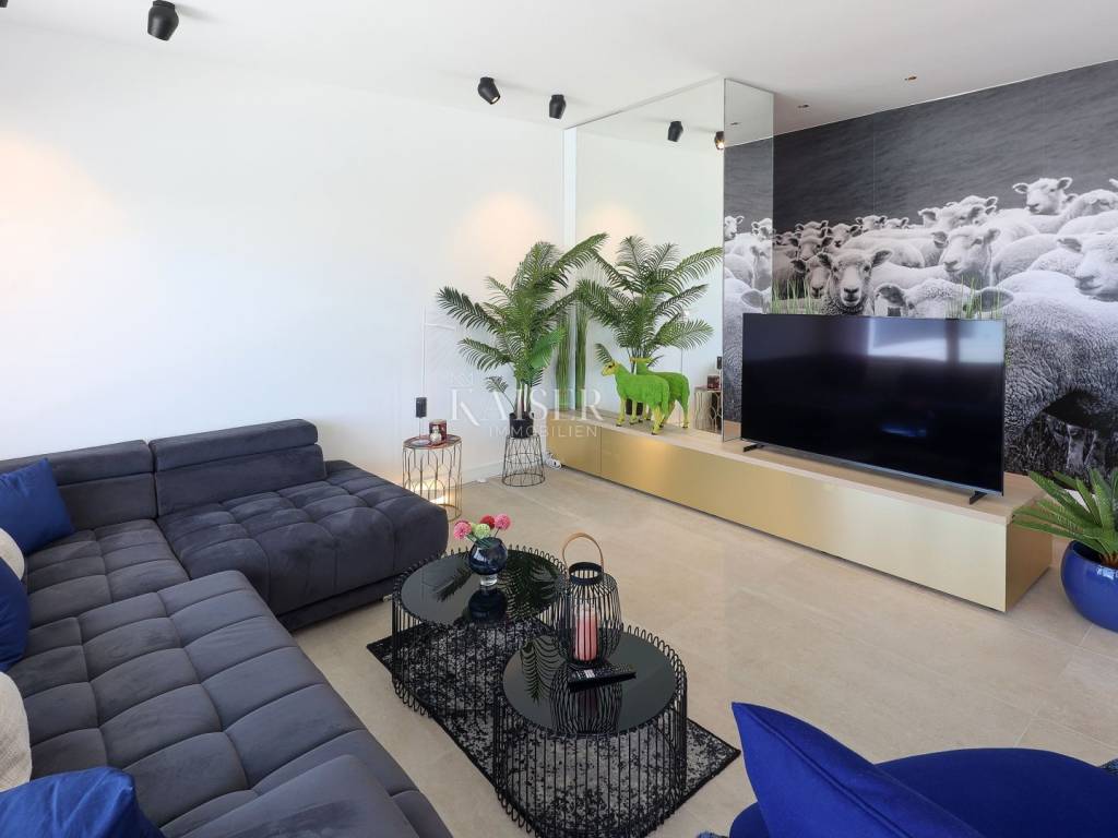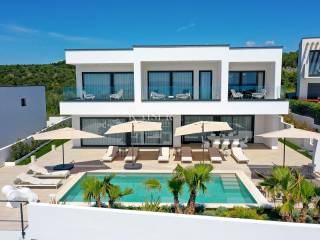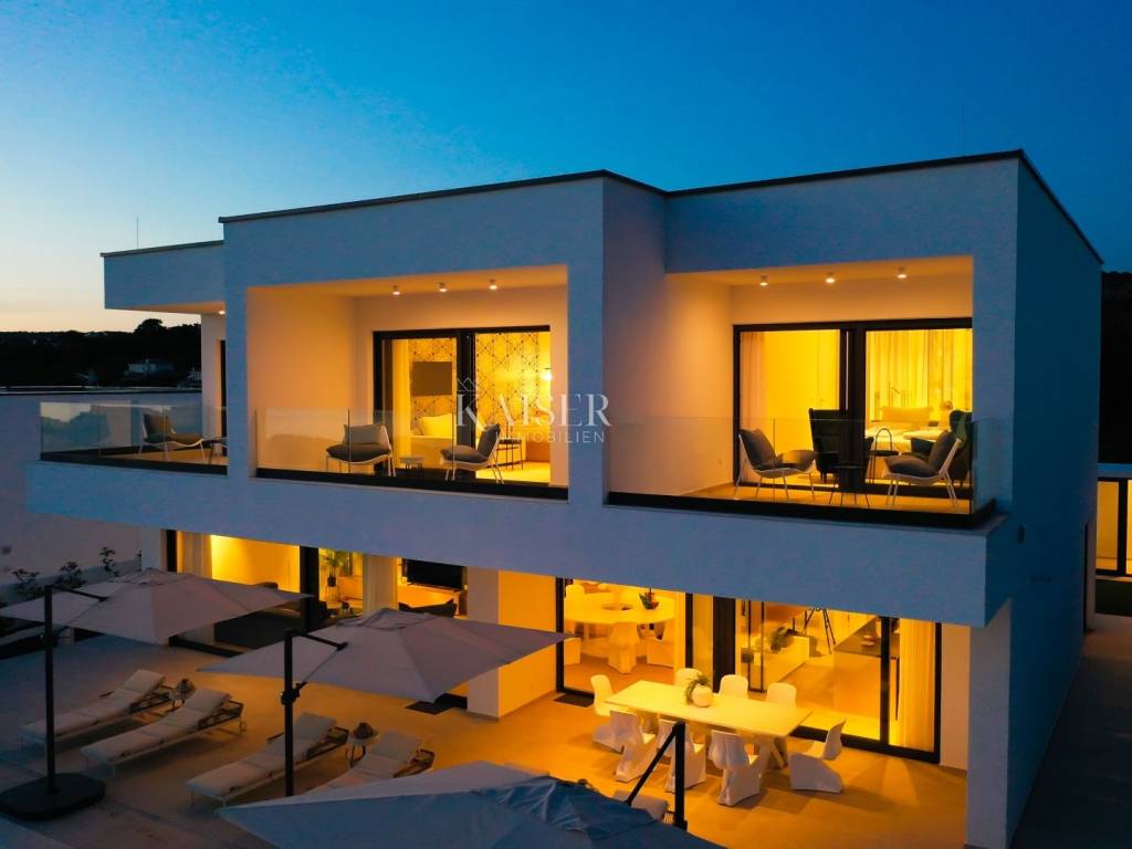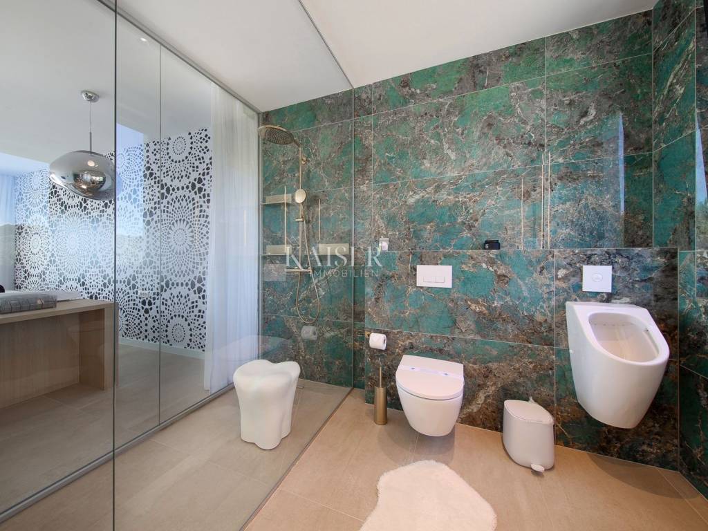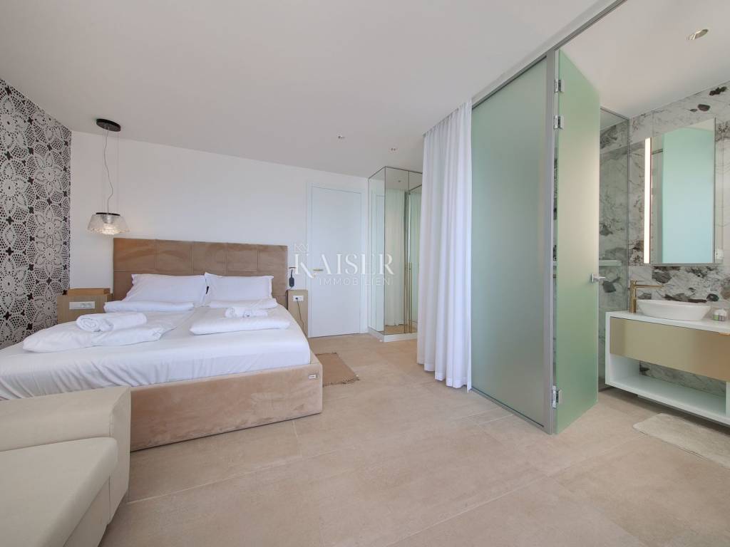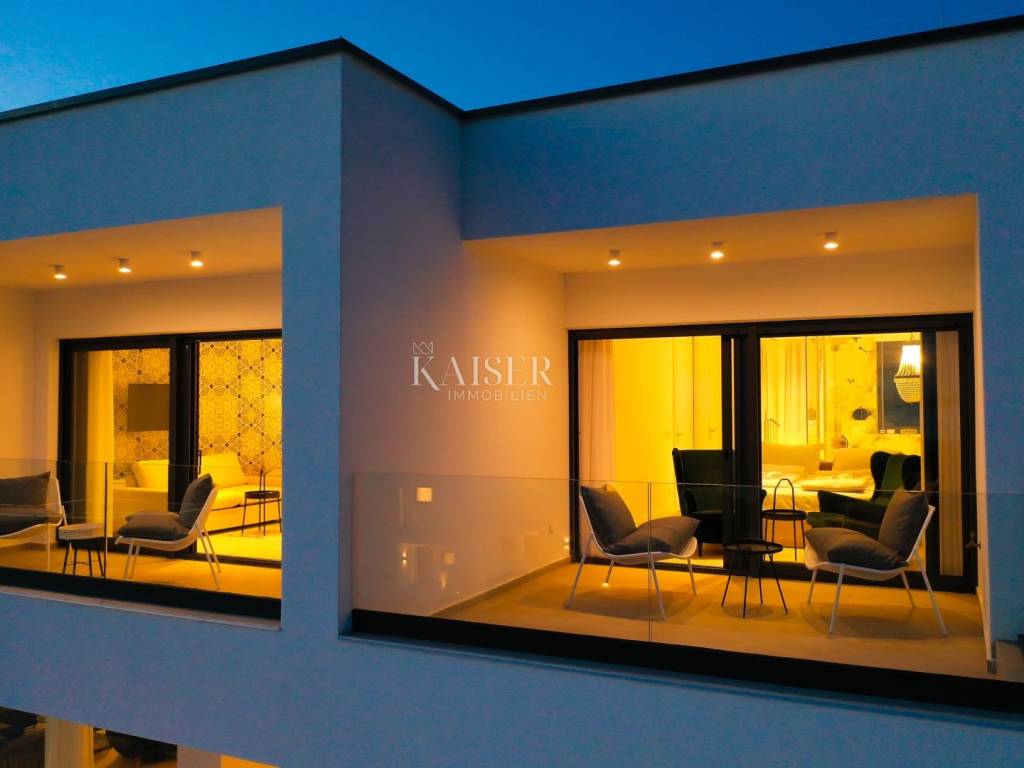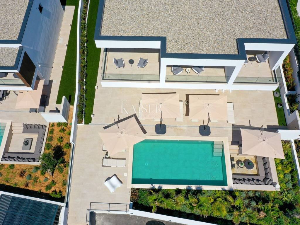 Kaiser immobilien mediates the sale of a beautiful, modern, newly built villa, located close to the coast and with an enchanting view of the sea, in Jakišnica on the island of Pag. Pag is located in the northern Adriatic and is the fifth largest Croatian island of exceptional natural beauty, and with a coastline of 302 km, it is the most indented island of the Adriatic. It is connected to the mainland by a bridge and a ferry, so the island can be reached from Zadar on the south side by a 340 m long bridge, or by ferry to Žigljen on the north side of the island, from the port of Prizna. The two most popular products that Pag gave to Croatia (and the rest of the world) are Pag cheese and Pag lace. Pag cheese is a type of hard cheese made from sheep's milk and is one of the most famous cheeses that can be found on markets inside and outside Croatia. Pag lace is a type of unique lace originating from Pag, and in 2009 it was added to the UNESCO list of intangible cultural heritage. Exclusively equipped villa with a total living area of 305m2, located on a plot of 804m2, divided into two floors. On the ground floor there are two bedrooms, two bathrooms, a storage room and a spacious open-plan living area of 77m2, which includes a living room, kitchen and dining room. The living area is dominated by panoramic windows with an open view of the sea, and there is also a modern, fully equipped kitchen with high-quality appliances and an island for food preparation. An internal staircase leads to the first floor where there are three spacious bedrooms, each with access to the terrace and loggia, and an additional area with a sauna. The bedrooms are decently decorated, and each has its own modern bathroom with luxurious details. In the construction and furnishing, top-quality materials and equipment were used, so that the object is equipped, among other things, with Schüco aluminum carpentry in 3 layers with 7.5 cm thick profiles, Mitsubishi inverter air conditioners in all rooms, underfloor heating, top-quality ceramics and parquet floors, Moooi chandeliers and Intralight lighting. The facility has video surveillance. There is a 32m2 heated infinity swimming pool in the landscaped garden, a sunbathing area, a relaxation area, and there is also a fully equipped gym. The parking lot is private, with space for 4 vehicles. The villa was built in 2024, it is sold furnished and equipped, it is located in a quiet location near all important amenities. The commission of the agency for the buyer is 3% + VAT and is paid in case of real estate purchase, when the first legal deed is concluded. ID CODE: 105-257