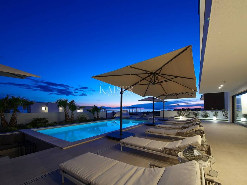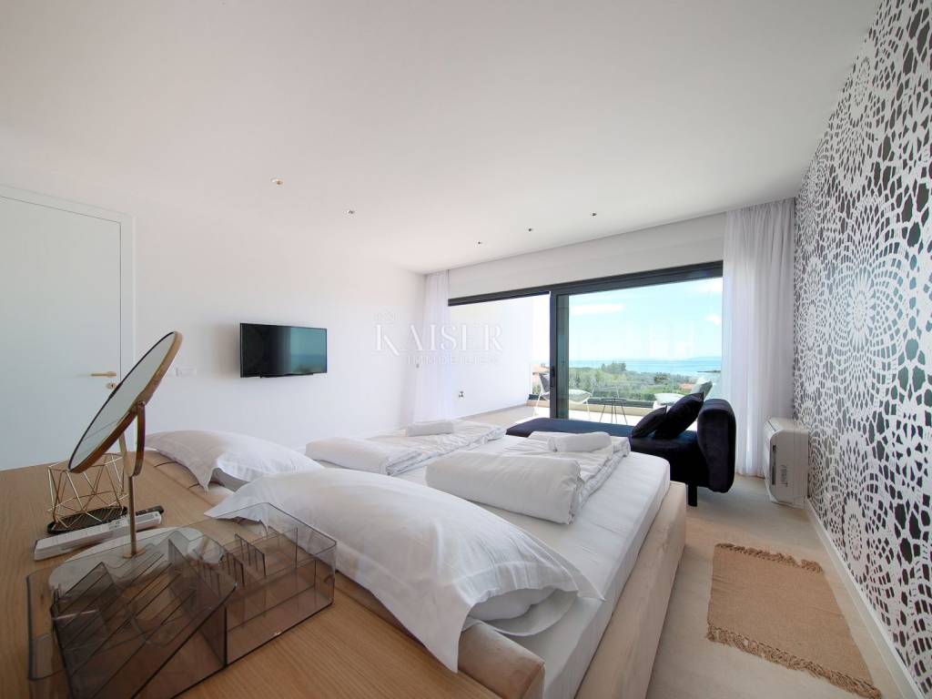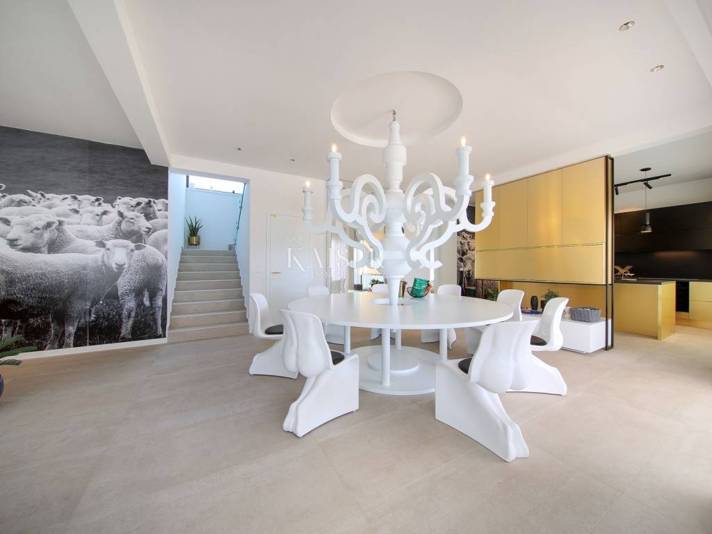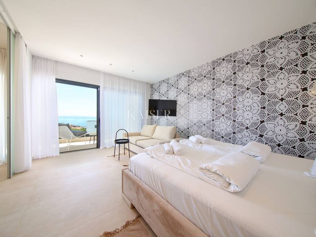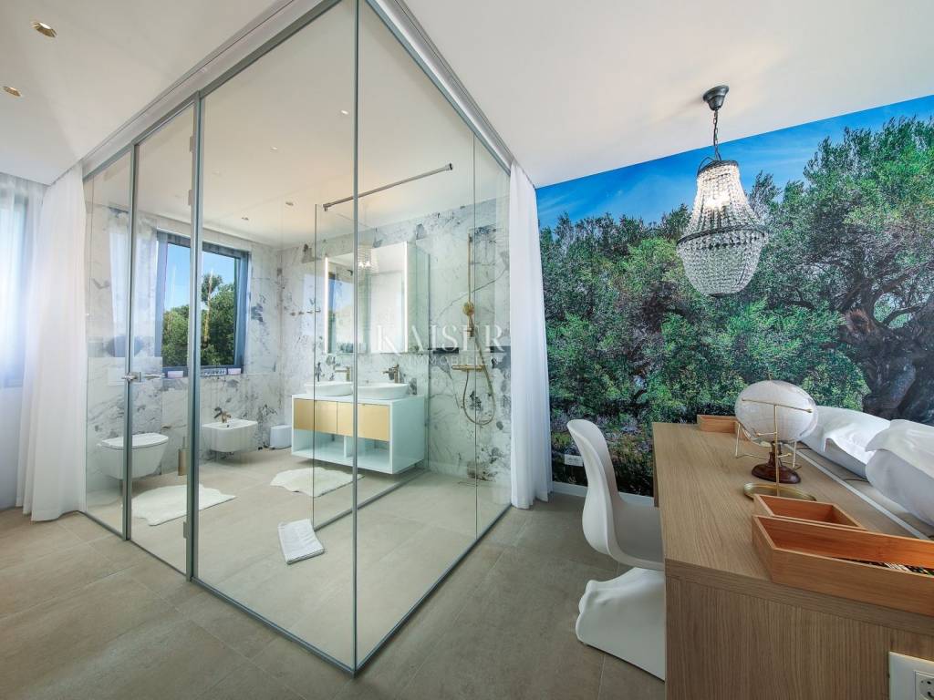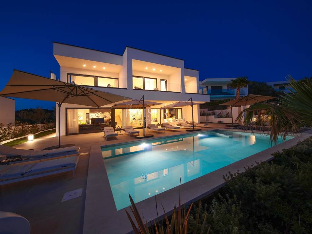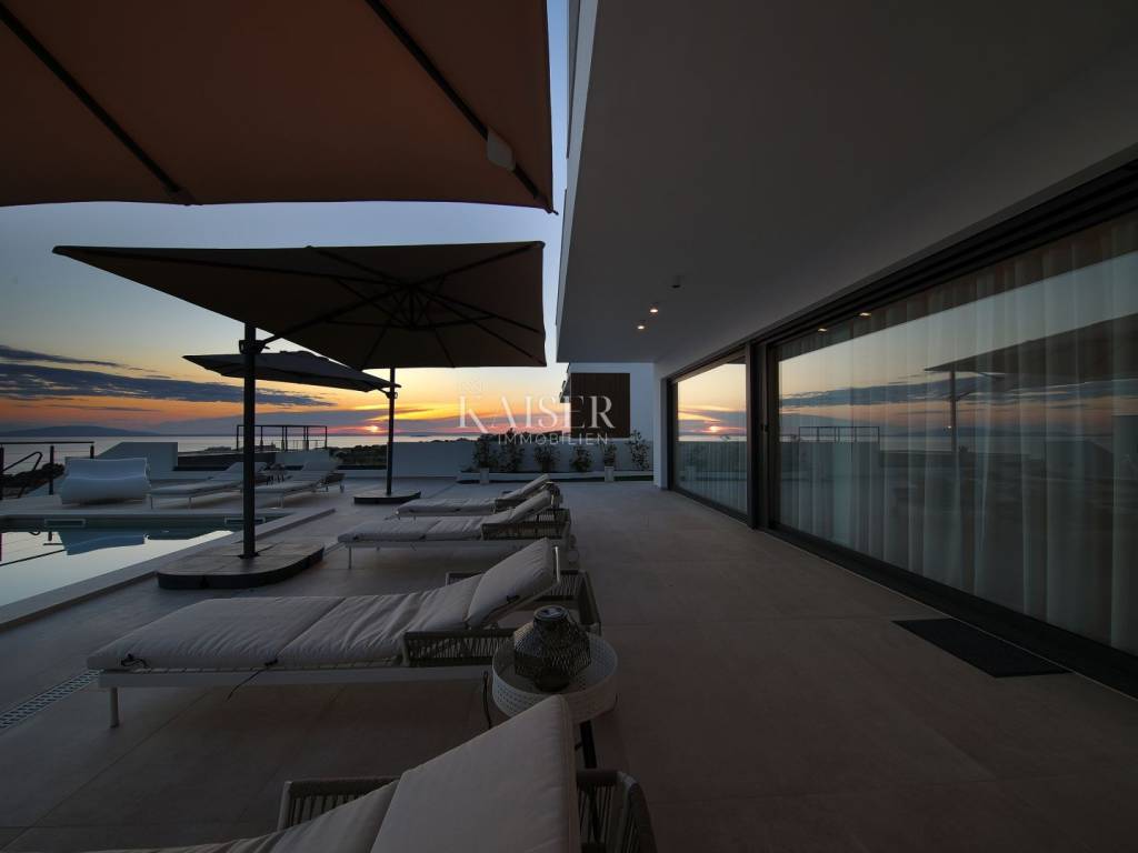 Kaiser immobilien mediates the sale of a beautiful, modern, newly built villa, located close to the coast and with an enchanting view of the sea, in Jakišnica on the island of Pag. Pag is located in the northern Adriatic and is the fifth largest Croatian island of exceptional natural beauty, and with a coastline of 302 km, it is the most indented island of the Adriatic. It is connected to the mainland by a bridge and a ferry, so the island can be reached from Zadar on the south side by a 340 m long bridge, or by ferry to Žigljen on the north side of the island, from the port of Prizna. The two most popular products that Pag gave to Croatia (and the rest of the world) are Pag cheese and Pag lace. Pag cheese is a type of hard cheese made from sheep's milk and is one of the most famous cheeses that can be found on markets inside and outside Croatia. Pag lace is a type of unique lace originating from Pag, and in 2009 it was added to the UNESCO list of intangible cultural heritage. Exclusively equipped villa with a total living area of 305m2, located on a plot of 804m2, divided into two floors. On the ground floor there are two bedrooms, two bathrooms, a storage room and a spacious open-plan living area of 77m2, which includes a living room, kitchen and dining room. The living area is dominated by panoramic windows with an open view of the sea, and there is also a modern, fully equipped kitchen with high-quality appliances and an island for food preparation. An internal staircase leads to the first floor where there are three spacious bedrooms, each with access to the terrace and loggia, and an additional area with a sauna. The bedrooms are decently decorated, and each has its own modern bathroom with luxurious details. In the construction and furnishing, top-quality materials and equipment were used, so that the object is equipped, among other things, with Schüco aluminum carpentry in 3 layers with 7.5 cm thick profiles, Mitsubishi inverter air conditioners in all rooms, underfloor heating, top-quality ceramics and parquet floors, Moooi chandeliers and Intralight lighting. The facility has video surveillance. There is a 32m2 heated infinity swimming pool in the landscaped garden, a sunbathing area, a relaxation area, and there is also a fully equipped gym. The parking lot is private, with space for 4 vehicles. The villa was built in 2024, it is sold furnished and equipped, it is located in a quiet location near all important amenities. The commission of the agency for the buyer is 3% + VAT and is paid in case of real estate purchase, when the first legal deed is concluded. ID CODE: 105-257