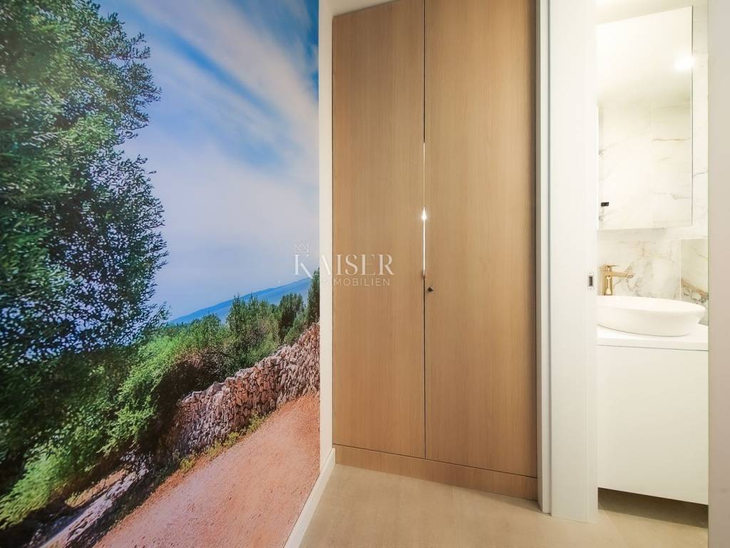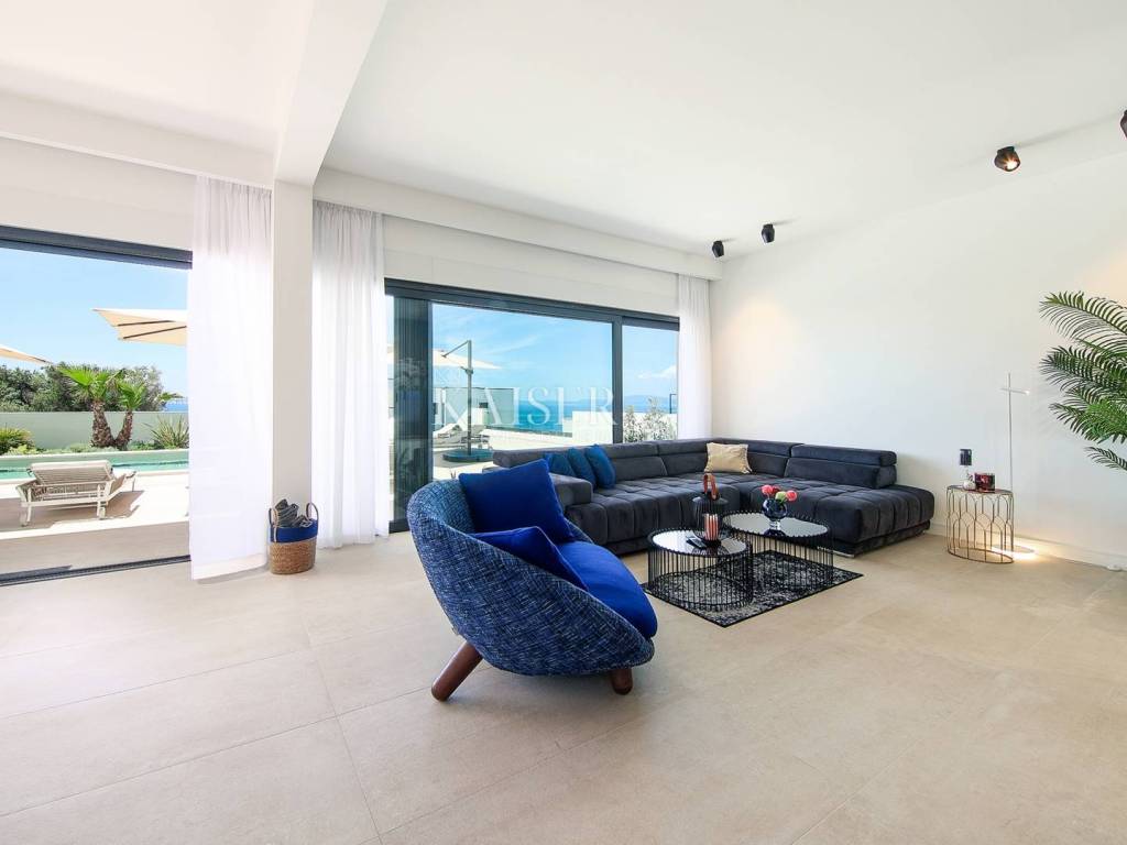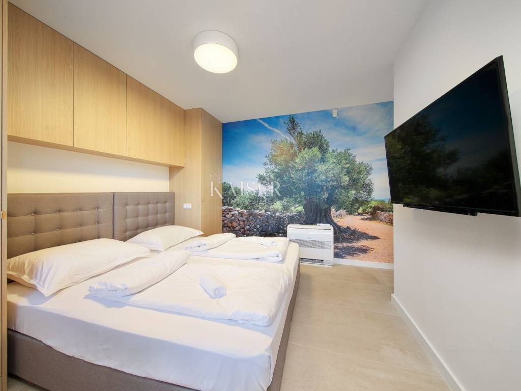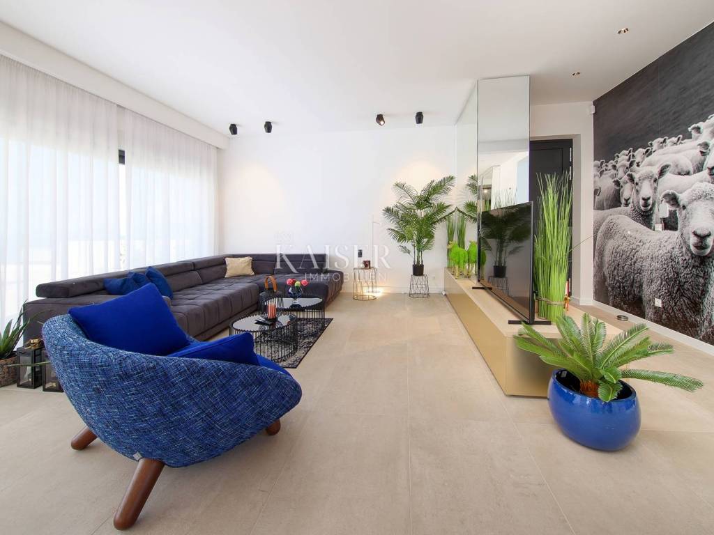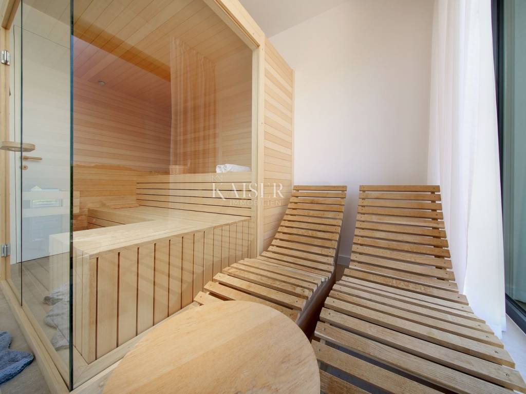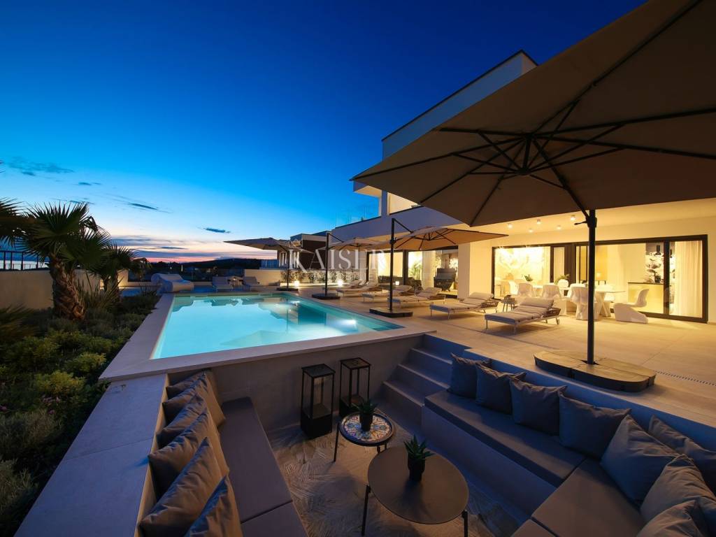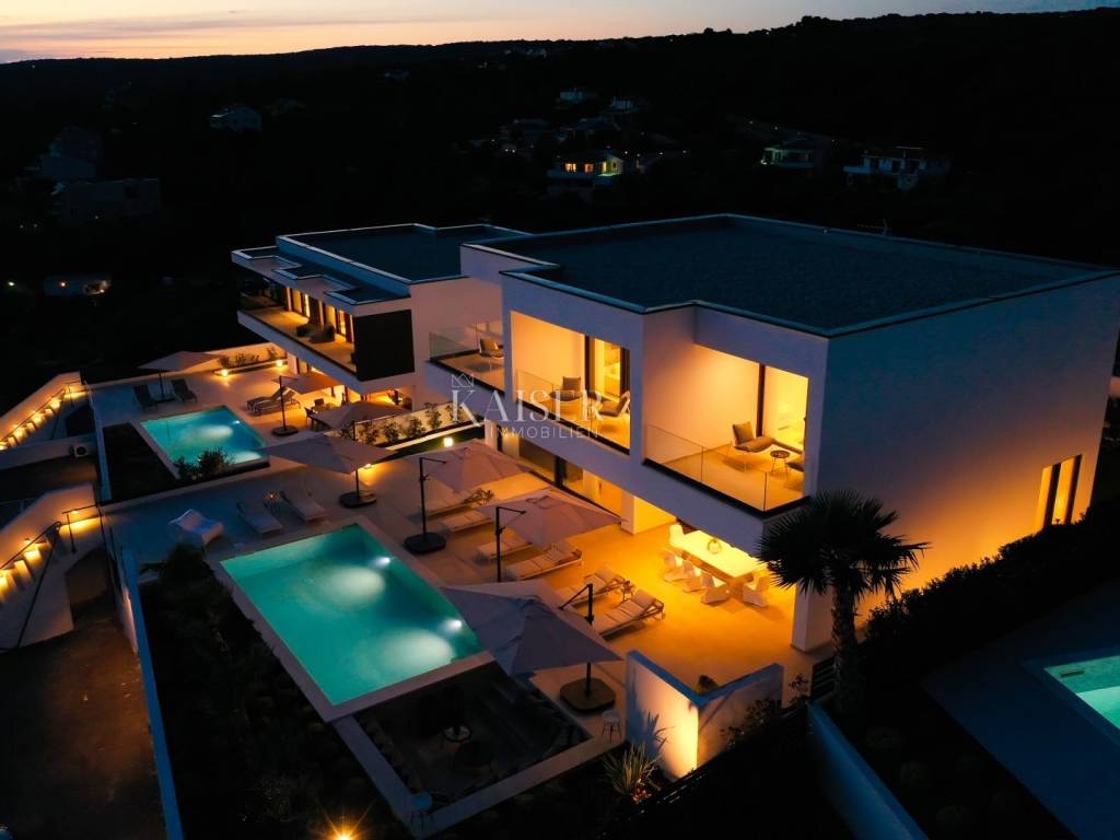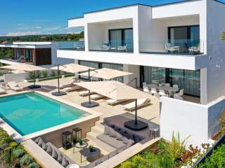 Kaiser immobilien mediates the sale of a beautiful, modern, newly built villa, located close to the coast and with an enchanting view of the sea, in Jakišnica on the island of Pag. Pag is located in the northern Adriatic and is the fifth largest Croatian island of exceptional natural beauty, and with a coastline of 302 km, it is the most indented island of the Adriatic. It is connected to the mainland by a bridge and a ferry, so the island can be reached from Zadar on the south side by a 340 m long bridge, or by ferry to Žigljen on the north side of the island, from the port of Prizna. The two most popular products that Pag gave to Croatia (and the rest of the world) are Pag cheese and Pag lace. Pag cheese is a type of hard cheese made from sheep's milk and is one of the most famous cheeses that can be found on markets inside and outside Croatia. Pag lace is a type of unique lace originating from Pag, and in 2009 it was added to the UNESCO list of intangible cultural heritage. Exclusively equipped villa with a total living area of 305m2, located on a plot of 804m2, divided into two floors. On the ground floor there are two bedrooms, two bathrooms, a storage room and a spacious open-plan living area of 77m2, which includes a living room, kitchen and dining room. The living area is dominated by panoramic windows with an open view of the sea, and there is also a modern, fully equipped kitchen with high-quality appliances and an island for food preparation. An internal staircase leads to the first floor where there are three spacious bedrooms, each with access to the terrace and loggia, and an additional area with a sauna. The bedrooms are decently decorated, and each has its own modern bathroom with luxurious details. In the construction and furnishing, top-quality materials and equipment were used, so that the object is equipped, among other things, with Schüco aluminum carpentry in 3 layers with 7.5 cm thick profiles, Mitsubishi inverter air conditioners in all rooms, underfloor heating, top-quality ceramics and parquet floors, Moooi chandeliers and Intralight lighting. The facility has video surveillance. There is a 32m2 heated infinity swimming pool in the landscaped garden, a sunbathing area, a relaxation area, and there is also a fully equipped gym. The parking lot is private, with space for 4 vehicles. The villa was built in 2024, it is sold furnished and equipped, it is located in a quiet location near all important amenities. The commission of the agency for the buyer is 3% + VAT and is paid in case of real estate purchase, when the first legal deed is concluded. ID CODE: 105-257