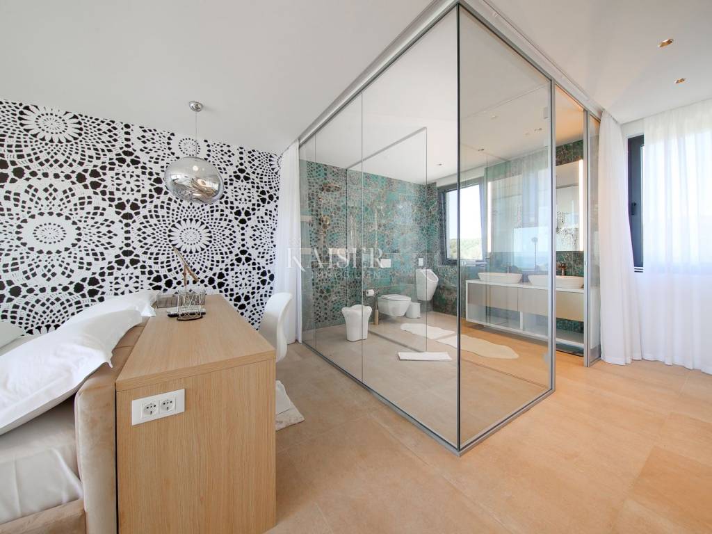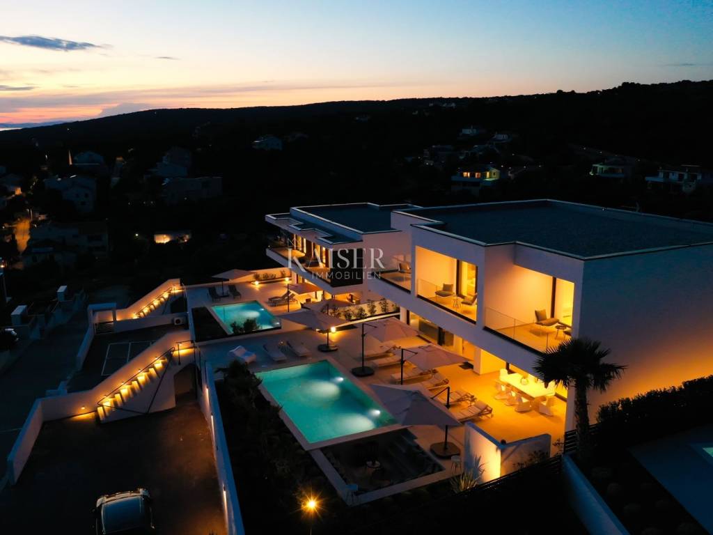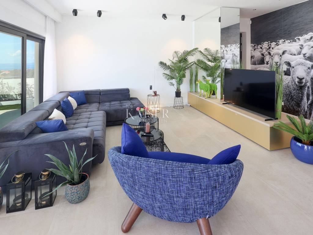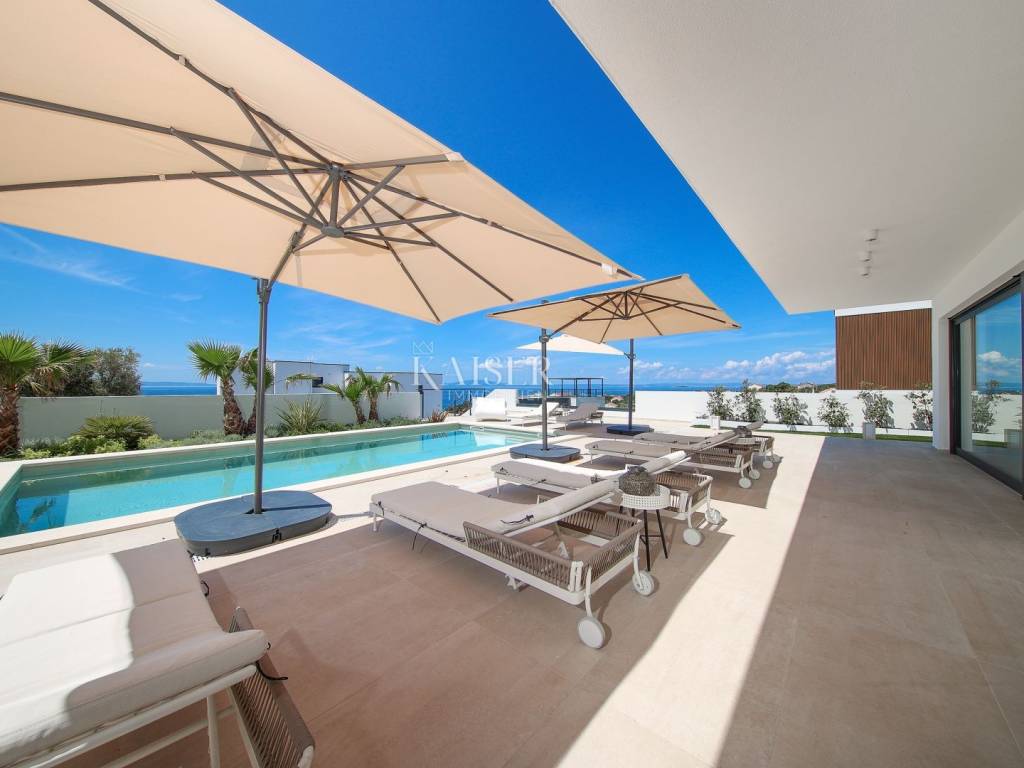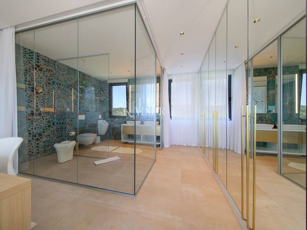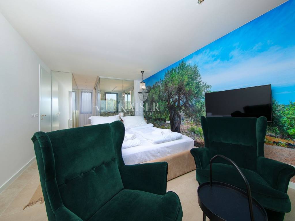 Kaiser immobilien mediates the sale of a beautiful, modern, newly built villa, located close to the coast and with an enchanting view of the sea, in Jakišnica on the island of Pag. Pag is located in the northern Adriatic and is the fifth largest Croatian island of exceptional natural beauty, and with a coastline of 302 km, it is the most indented island of the Adriatic. It is connected to the mainland by a bridge and a ferry, so the island can be reached from Zadar on the south side by a 340 m long bridge, or by ferry to Žigljen on the north side of the island, from the port of Prizna. The two most popular products that Pag gave to Croatia (and the rest of the world) are Pag cheese and Pag lace. Pag cheese is a type of hard cheese made from sheep's milk and is one of the most famous cheeses that can be found on markets inside and outside Croatia. Pag lace is a type of unique lace originating from Pag, and in 2009 it was added to the UNESCO list of intangible cultural heritage. Exclusively equipped villa with a total living area of 305m2, located on a plot of 804m2, divided into two floors. On the ground floor there are two bedrooms, two bathrooms, a storage room and a spacious open-plan living area of 77m2, which includes a living room, kitchen and dining room. The living area is dominated by panoramic windows with an open view of the sea, and there is also a modern, fully equipped kitchen with high-quality appliances and an island for food preparation. An internal staircase leads to the first floor where there are three spacious bedrooms, each with access to the terrace and loggia, and an additional area with a sauna. The bedrooms are decently decorated, and each has its own modern bathroom with luxurious details. In the construction and furnishing, top-quality materials and equipment were used, so that the object is equipped, among other things, with Schüco aluminum carpentry in 3 layers with 7.5 cm thick profiles, Mitsubishi inverter air conditioners in all rooms, underfloor heating, top-quality ceramics and parquet floors, Moooi chandeliers and Intralight lighting. The facility has video surveillance. There is a 32m2 heated infinity swimming pool in the landscaped garden, a sunbathing area, a relaxation area, and there is also a fully equipped gym. The parking lot is private, with space for 4 vehicles. The villa was built in 2024, it is sold furnished and equipped, it is located in a quiet location near all important amenities. The commission of the agency for the buyer is 3% + VAT and is paid in case of real estate purchase, when the first legal deed is concluded. ID CODE: 105-257