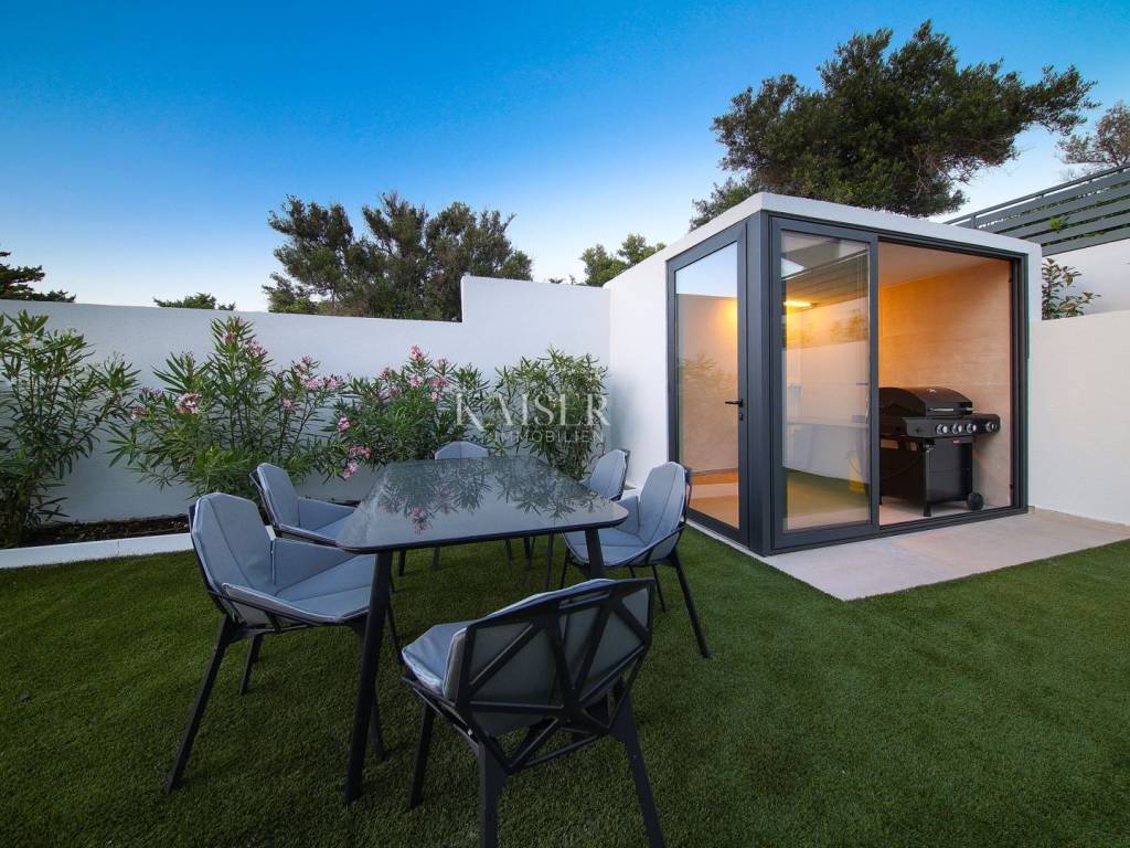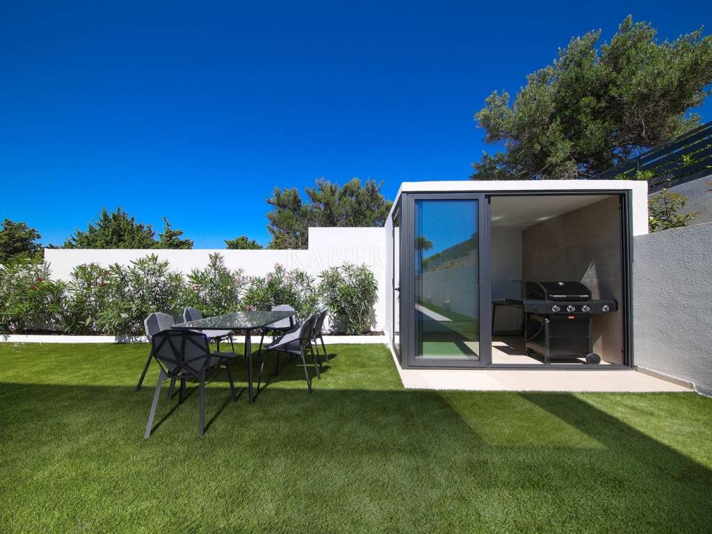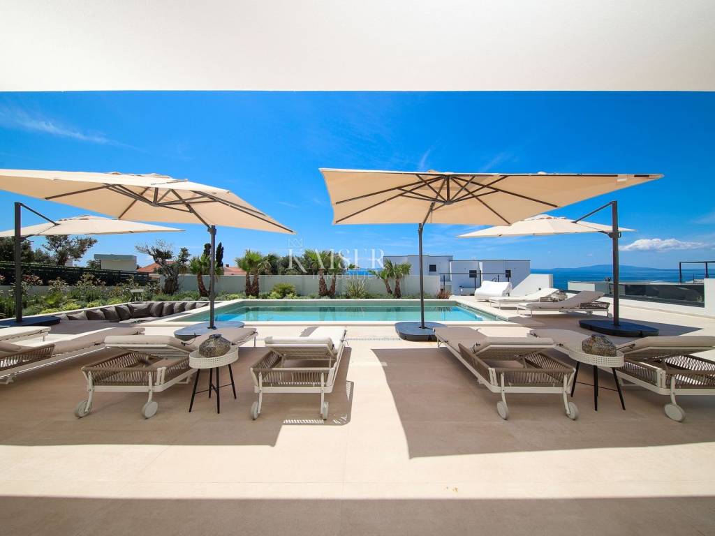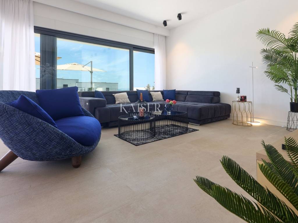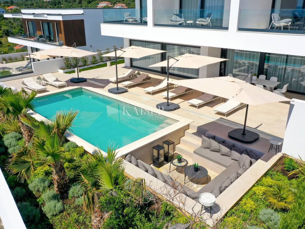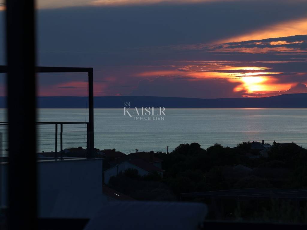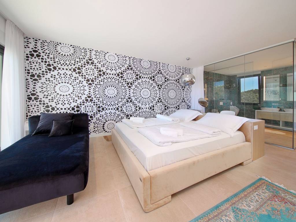 Kaiser immobilien mediates the sale of a beautiful, modern, newly built villa, located close to the coast and with an enchanting view of the sea, in Jakišnica on the island of Pag. Pag is located in the northern Adriatic and is the fifth largest Croatian island of exceptional natural beauty, and with a coastline of 302 km, it is the most indented island of the Adriatic. It is connected to the mainland by a bridge and a ferry, so the island can be reached from Zadar on the south side by a 340 m long bridge, or by ferry to Žigljen on the north side of the island, from the port of Prizna. The two most popular products that Pag gave to Croatia (and the rest of the world) are Pag cheese and Pag lace. Pag cheese is a type of hard cheese made from sheep's milk and is one of the most famous cheeses that can be found on markets inside and outside Croatia. Pag lace is a type of unique lace originating from Pag, and in 2009 it was added to the UNESCO list of intangible cultural heritage. Exclusively equipped villa with a total living area of 305m2, located on a plot of 804m2, divided into two floors. On the ground floor there are two bedrooms, two bathrooms, a storage room and a spacious open-plan living area of 77m2, which includes a living room, kitchen and dining room. The living area is dominated by panoramic windows with an open view of the sea, and there is also a modern, fully equipped kitchen with high-quality appliances and an island for food preparation. An internal staircase leads to the first floor where there are three spacious bedrooms, each with access to the terrace and loggia, and an additional area with a sauna. The bedrooms are decently decorated, and each has its own modern bathroom with luxurious details. In the construction and furnishing, top-quality materials and equipment were used, so that the object is equipped, among other things, with Schüco aluminum carpentry in 3 layers with 7.5 cm thick profiles, Mitsubishi inverter air conditioners in all rooms, underfloor heating, top-quality ceramics and parquet floors, Moooi chandeliers and Intralight lighting. The facility has video surveillance. There is a 32m2 heated infinity swimming pool in the landscaped garden, a sunbathing area, a relaxation area, and there is also a fully equipped gym. The parking lot is private, with space for 4 vehicles. The villa was built in 2024, it is sold furnished and equipped, it is located in a quiet location near all important amenities. The commission of the agency for the buyer is 3% + VAT and is paid in case of real estate purchase, when the first legal deed is concluded. ID CODE: 105-257