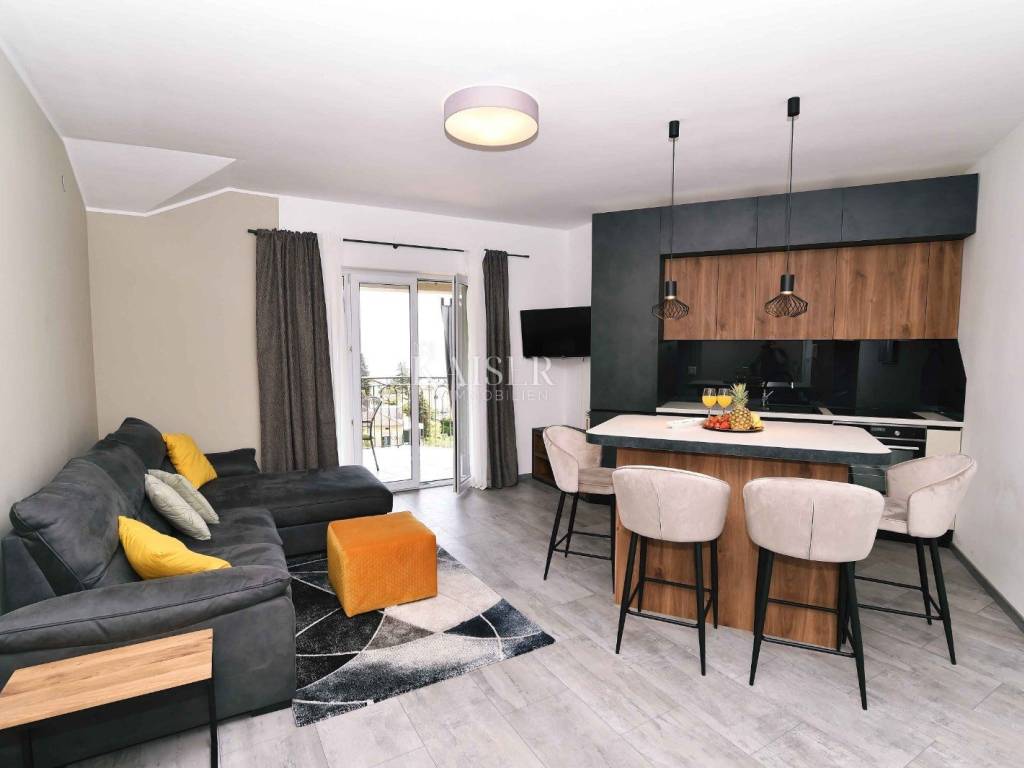 Kaiser Immobilien presents a beautiful one-bedroom apartment located in the Opatija area, with a total area of 55 m2. The apartment consists of a hallway, kitchen with dining room and living room, spacious terrace, one bedroom, bathroom and balcony with a beautiful sea view. The apartment has one parking space in the building's yard, and there is also a shared swimming pool. The apartment is modern and tastefully furnished and fully equipped for a comfortable stay. Heating is provided by air conditioning, while the bathroom has underfloor heating. It is located on the first floor of a small residential building, the building is newly built, in an extremely attractive location close to all important amenities. Distance from the property: Munich - 552km Ljubljana - 107km Rijeka - 13km Zagreb - 189km Rijeka Airport - 38km Market - 550m Sea/Lungomare - 650m For all questions, please contact the agent: Davor Piškulić davor@kaiser-immobilien.hr +00 385 95 583 8240 WhatsApp, Viber