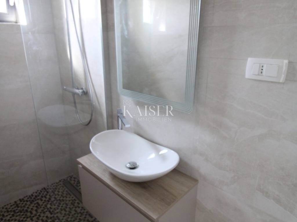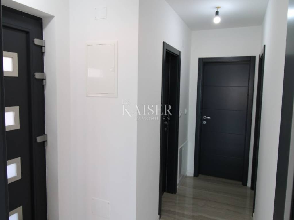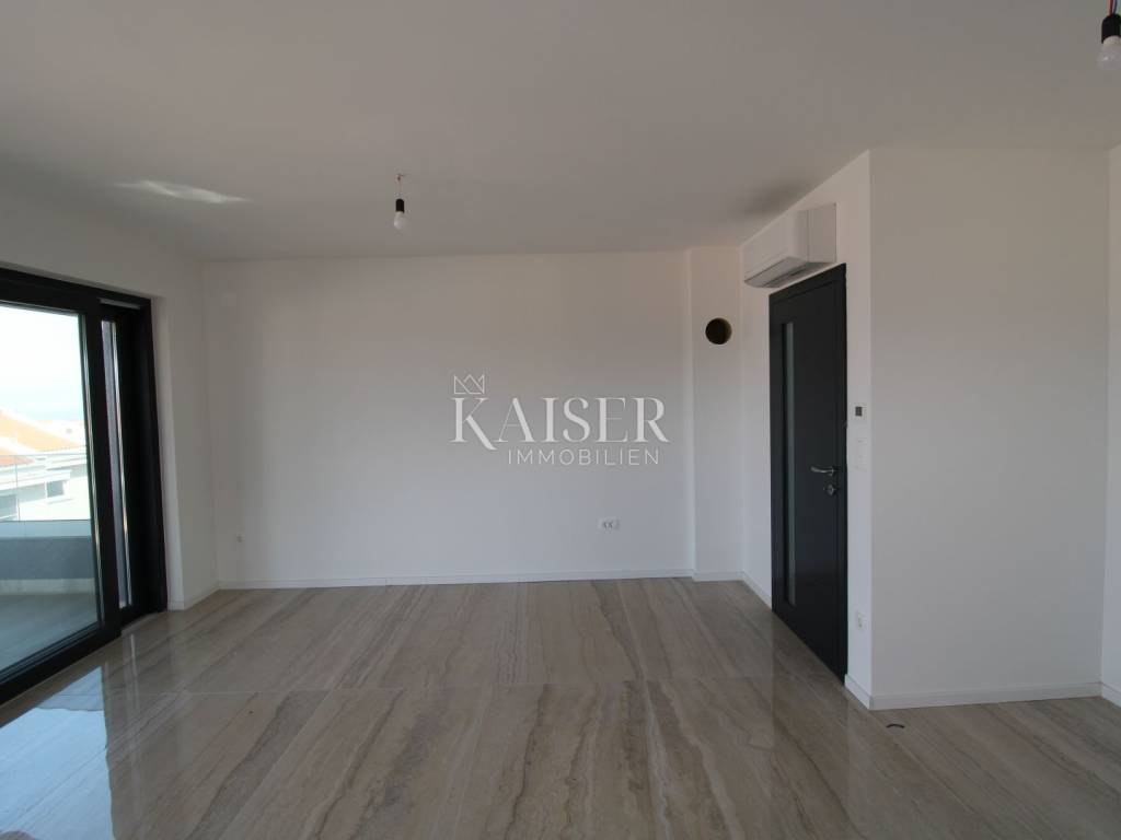 Kaiser Immobilien presents: Exclusive apartment with panoramic views of the Rijeka Bay and the island of Cres A modern apartment for sale in Malinska on the island of Krk, located in a quiet area, surrounded by smaller buildings, houses and forests, only 700 meters from the sea, a few minutes' walk. This elegant property has an area of 75 m². Located on the second floor of a modern apartment building on two floors, each floor of which has one apartment. Its carefully designed floor plan allows for maximum use of space, while large glass surfaces let in plenty of natural light, creating an airy and pleasant ambiance. The biggest advantage of this home is the large terrace with a glass fence from which you can enjoy a spectacular view of the entire Rijeka Bay and the island of Cres, making it a real haven for those seeking peace and beauty every day. Upon entering the apartment, you pass through the hallway, which leads to different parts of this sophisticated home. The part of the apartment reserved for relaxation includes two spacious bedrooms, one of which has its own private bathroom, while the second bathroom is located in the immediate vicinity and is easily accessible to everyone. The social part of the home consists of a spacious living room with an integrated dining room and kitchen, which exudes spaciousness and elegance. The floors are covered with large, shiny Italian ceramic tiles, which give the space a sophisticated look. A special impression is made by the large balcony wall, which opens completely and connects the interior with a spacious terrace - an ideal place to enjoy morning coffee, evening gatherings or simply relax with a stunning panoramic view. Underfloor heating is installed throughout the entire apartment, ensuring pleasant warmth during the colder months, while a modern air conditioning system with devices in each room is responsible for optimal climate in all seasons. The windows are made of top-quality materials and have remote-controlled roller shutters, while built-in mosquito nets ensure protection from insects with an unobstructed flow of fresh air. The apartment also has a prepared opening for a chimney, providing the possibility of installing a fireplace, which will further contribute to the warm and cozy atmosphere. Each apartment has a parking space, as well as additional parking for guests. Apartment contents and room sizes: Hallway – 4.64 m² Kitchen, dining room and living room – 19.04 m² Bathroom 1 – 3.19 m² Bedroom 1 – 12.74 m² (with private bathroom) Bedroom 2 – 12.26 m² Bathroom 2 – 3.19 m² Terrace – 14.34 m² (calculated 7.17 m²) Total net area of the apartment: 68.23 m² Staircase: 2.04 m² Total net area of the 2nd floor: 70.27 m² Gross building area (GBP): 74.75 m² This apartment offers everything you need for a modern, luxurious and comfortable life – from top-quality materials and smart technological solutions to a spectacular view that will take your breath away. Malinska is the pearl of the island of Krk, known for its crystal clear sea, coastal promenades and Mediterranean atmosphere. Here you can enjoy sandy and pebble beaches, excellent gastronomic offer and numerous recreational facilities. All important facilities such as shops, restaurants and beaches are located in the immediate vicinity. The excellent connection of the island of Krk with the mainland by bridge, safety and proximity to the town itself make this apartment ideal for a family home or a tourist investment. Zagreb: approx. 160 km (2 hours drive) Rijeka: approx. 50 km (1 hour drive) Split: approx. 290 km (3 hours drive) Osijek: approx. 380 km (4-5 hours drive) Pula: approx. 100 km (1.5 hours drive) Zadar: approx. 190 km (2.5 hours drive): Trieste (Italy): approx. 150 km (2 hours drive) Vienna (Austria): approx. 460 km (6 hours drive) Ljubljana (Slovenia): approx. 170 km (2 hours drive) Munich (Germany): approx. 500 km (6-7 hours drive) Venice (Italy): approx. 220 km (3 hours drive) For more information and a viewing, contact us today. Tel.: 00385992510230 Email: marijana.papic@kaiser-immobilien.hr