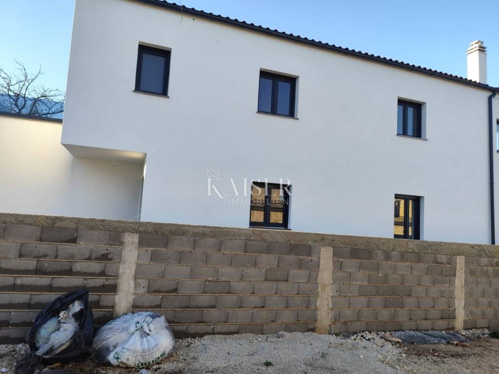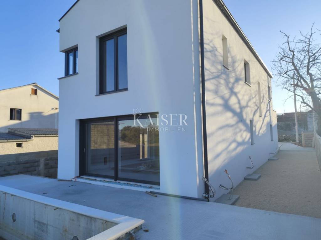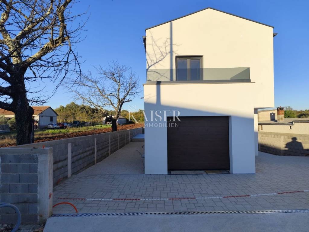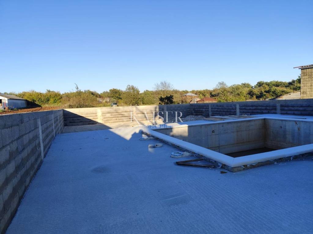 The Kaiser Immobilien agency offers a house with a swimming pool with a living area of 180 m2 on a plot of 500 m2. The house is under construction and consists of a ground floor and first floor. The ground floor has an open space that will be used as a living area with a living room, dining room and kitchen, bathroom, storage room and hallway. The first floor has three bedrooms, two bathrooms and one of the bedrooms has direct access to a balcony facing southwest. The lower part of the house is designed as an open space with a view of the pool and a sunbathing area located on the northeast side, the pool is 24 m2 in size. Underfloor heating will be installed in all rooms and air conditioning in the rooms. A garage has been built as part of the house, which is connected and can also be entered through the house. Completion of construction is planned for 07/2025. The courtyard of the house will be adorned with a 24 m2 swimming pool as well as a landscaped green garden that will be completely enclosed by a wall. The house is located in a quiet street on the edge of a small village, which is located 6 kilometers from Svetvinčenat. For all information, you can call the phone number 0915284449 or email dean.cvitko@kaiser-immobilien.hr