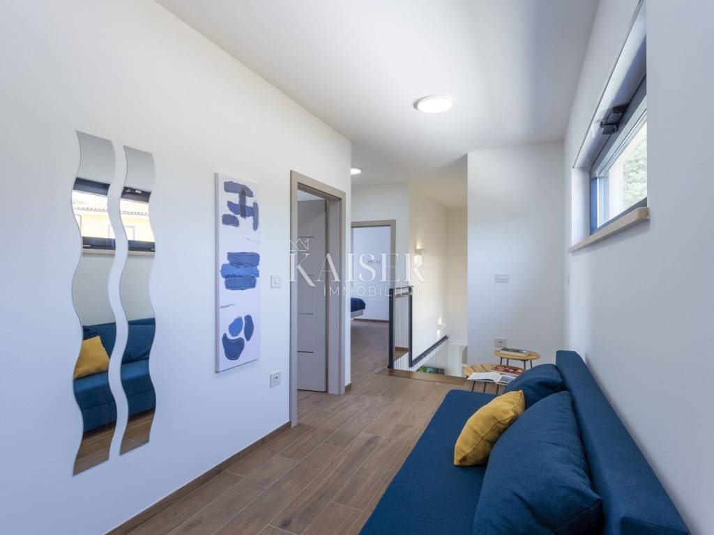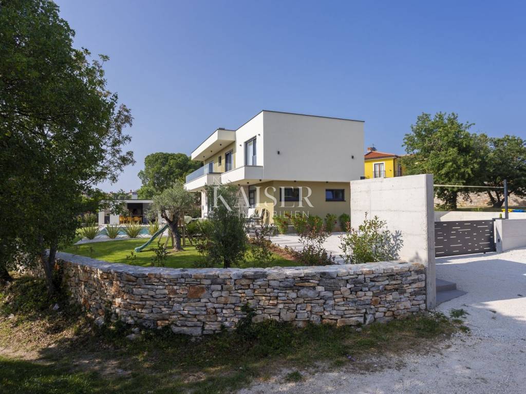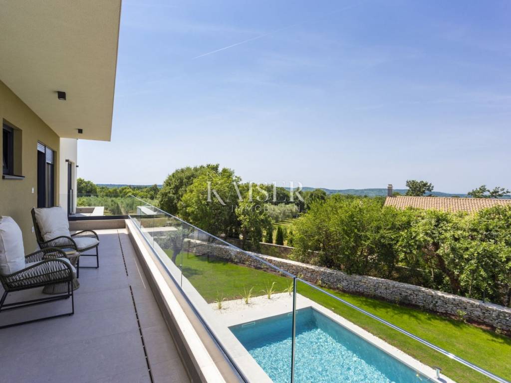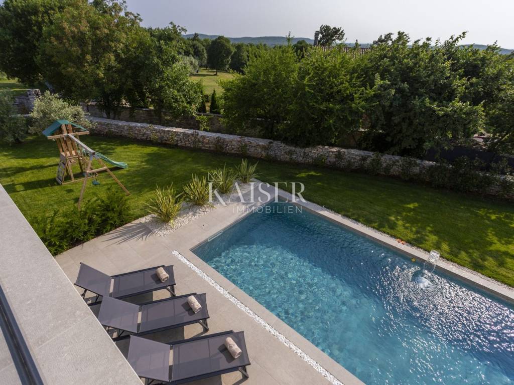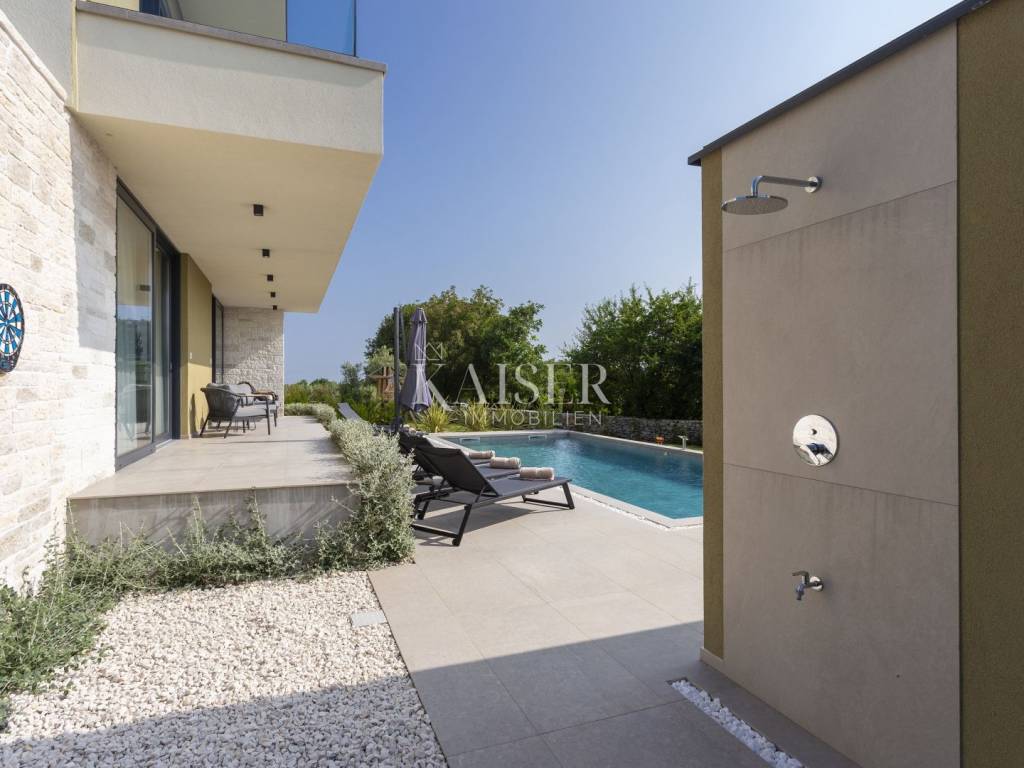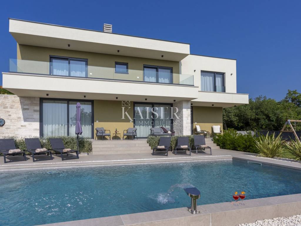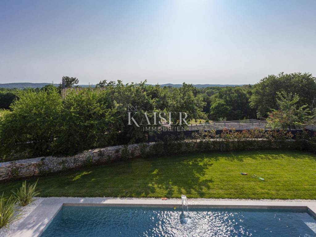 Kaiser Immobilien presents a modern villa with a swimming pool in a quiet location near Svetvinčenat. This elegant new building is located on the last urbanized plot of land in the village, which guarantees maximum privacy and tranquility. The villa covers 200 m² of living space, while the plot is 900 m², with a fully landscaped exterior and swimming pool. The ground floor has a spacious living room with kitchen and dining area, guest toilet, storage room, boiler room, as well as a covered terrace - ideal for relaxing during the warmer months. A special addition is an auxiliary building with a fireplace, perfect for creating a summer kitchen or a socializing area. Upstairs there are three comfortable bedrooms, each with its own bathroom and access to a balcony, from which there is a view of the surrounding nature and greenery. The courtyard is dominated by a 40 m² swimming pool with ceramic tiles, next to which there is a landscaped lawn with automatic irrigation, parking spaces for three vehicles, automatic entrance gates, and a fenced property that provides complete discretion and security. The villa is technically fully equipped – inverter air conditioners provide cooling and heating throughout the year, the first phase of underfloor heating has been installed with preparation for solar collectors, and quality materials have been used, including PVC joinery and high-class ceramic tiles in the interior and pool. The property is being sold fully equipped and furnished, which allows you to move in without additional investments. Located on the edge of the village, this villa offers the perfect balance between peace and accessibility. Nearby are numerous cycling and hiking trails, natural landscapes, wine roads and famous Istrian taverns. Svetvinčenat is a historic town with a rich cultural heritage, and at the same time is located in an excellent location – only a 20–30 minute drive to coastal towns such as Rovinj, Pula or Fažana. This villa is ideal for: -a private villa for year-round living or vacation -a luxury tourist rental with high income potential -family life in a natural and safe environment Proximity to amenities: Sea/beach- 15 km Airport- 32 km Distance from major cities: Ljubljana: 178 km Vienna: 559 km Budapest: 579 km Prague: 829 km Munich: 580 km Zagreb: 243 km If you would like to visit the property in person, please contact: Dean Cvitko E-mail: dean.cvitko@kaiser-immobilien.hr Tel: +385915284449 http://kaiser-immobilien.hr/