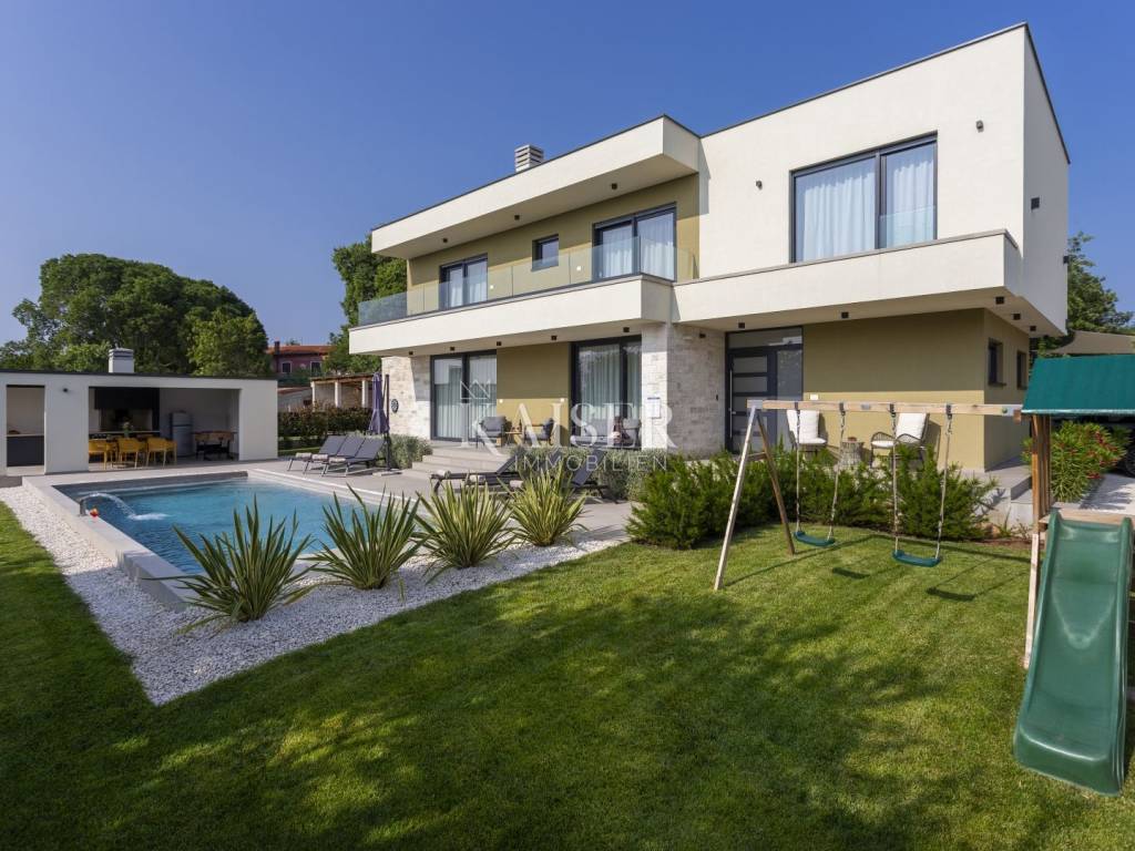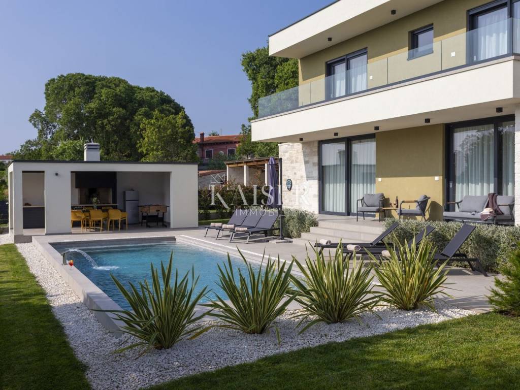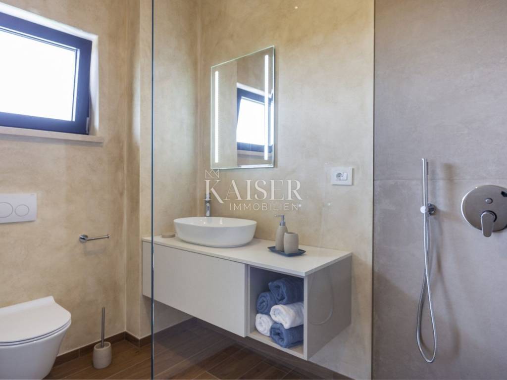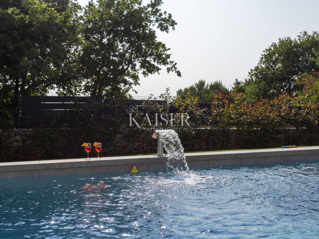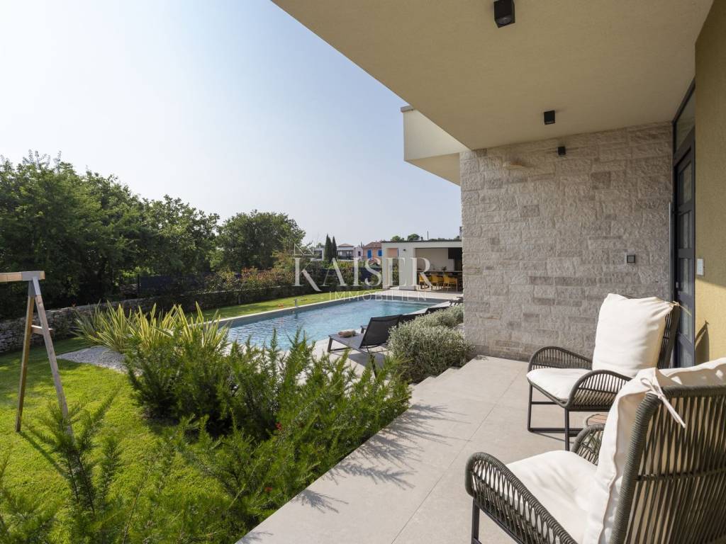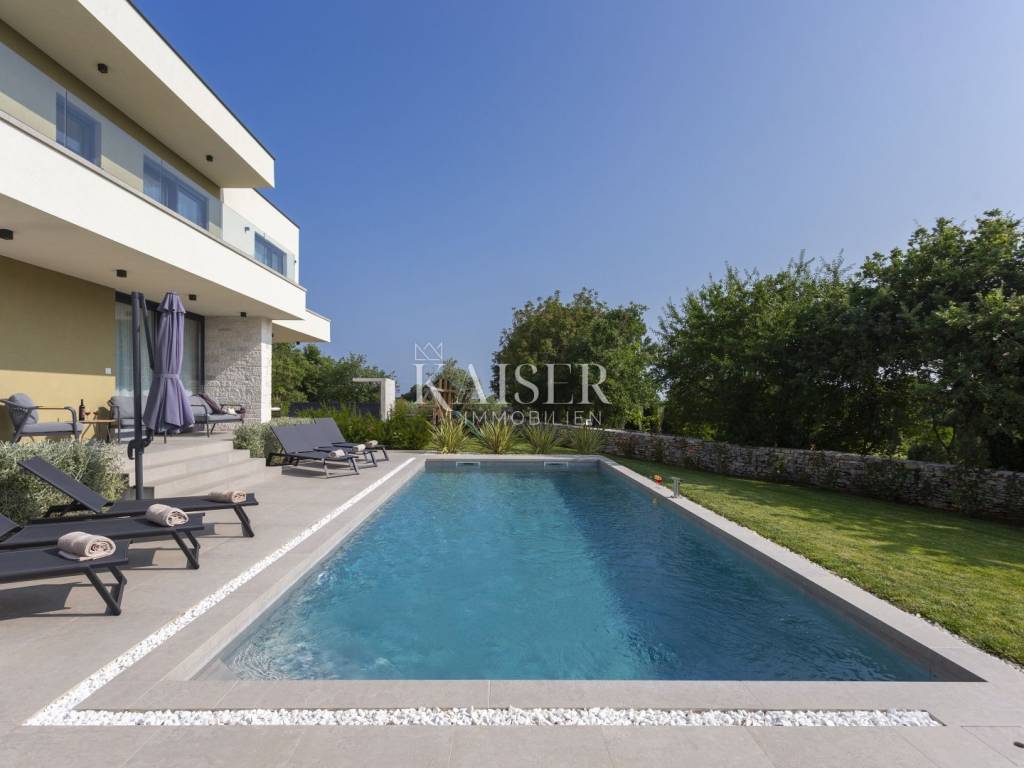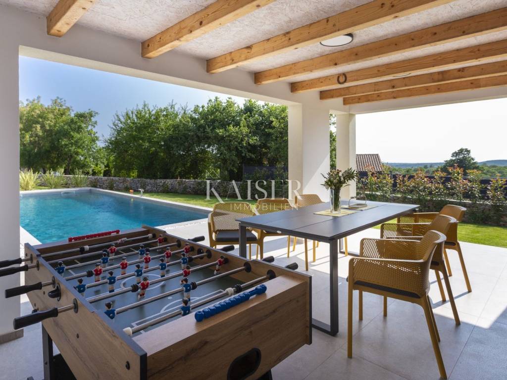Kaiser Immobilien presents a modern villa with a swimming pool in a quiet location near Svetvinčenat. This elegant new building is located on the last urbanized plot of land in the village, which guarantees maximum privacy and tranquility. The villa covers 200 m² of living space, while the plot is 900 m², with a fully landscaped exterior and swimming pool. The ground floor has a spacious living room with kitchen and dining area, guest toilet, storage room, boiler room, as well as a covered terrace - ideal for relaxing during the warmer months. A special addition is an auxiliary building with a fireplace, perfect for creating a summer kitchen or a socializing area. Upstairs there are three comfortable bedrooms, each with its own bathroom and access to a balcony, from which there is a view of the surrounding nature and greenery. The courtyard is dominated by a 40 m² swimming pool with ceramic tiles, next to which there is a landscaped lawn with automatic irrigation, parking spaces for three vehicles, automatic entrance gates, and a fenced property that provides complete discretion and security. The villa is technically fully equipped – inverter air conditioners provide cooling and heating throughout the year, the first phase of underfloor heating has been installed with preparation for solar collectors, and quality materials have been used, including PVC joinery and high-class ceramic tiles in the interior and pool. The property is being sold fully equipped and furnished, which allows you to move in without additional investments. Located on the edge of the village, this villa offers the perfect balance between peace and accessibility. Nearby are numerous cycling and hiking trails, natural landscapes, wine roads and famous Istrian taverns. Svetvinčenat is a historic town with a rich cultural heritage, and at the same time is located in an excellent location – only a 20–30 minute drive to coastal towns such as Rovinj, Pula or Fažana. This villa is ideal for: -a private villa for year-round living or vacation -a luxury tourist rental with high income potential -family life in a natural and safe environment Proximity to amenities: Sea/beach- 15 km Airport- 32 km Distance from major cities: Ljubljana: 178 km Vienna: 559 km Budapest: 579 km Prague: 829 km Munich: 580 km Zagreb: 243 km If you would like to visit the property in person, please contact: Dean Cvitko E-mail: dean.cvitko@kaiser-immobilien.hr Tel: +385915284449 http://kaiser-immobilien.hr/