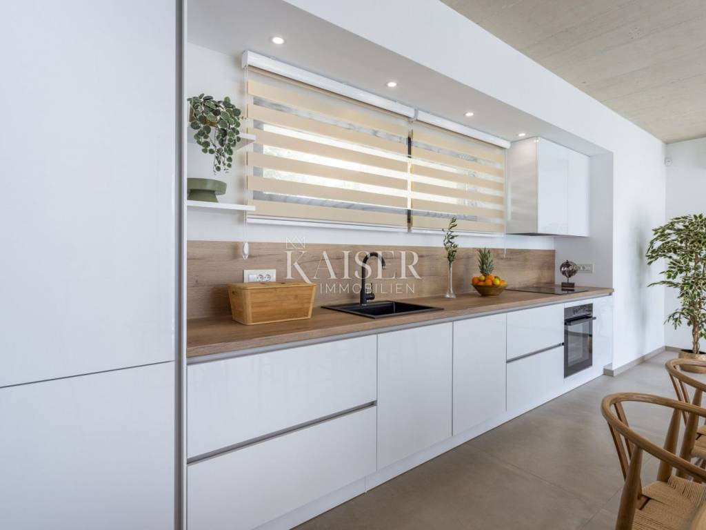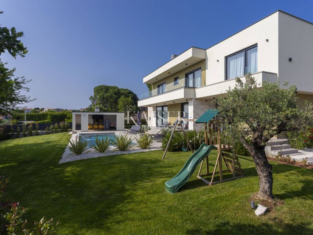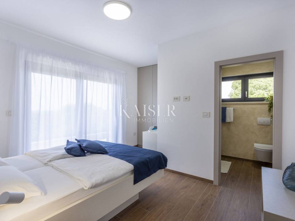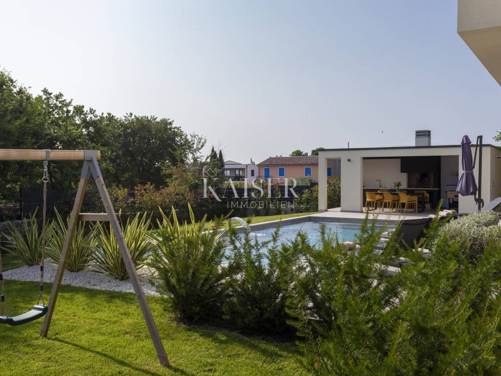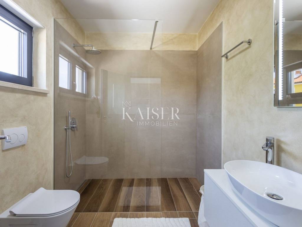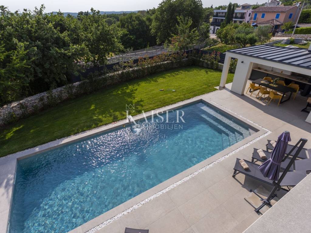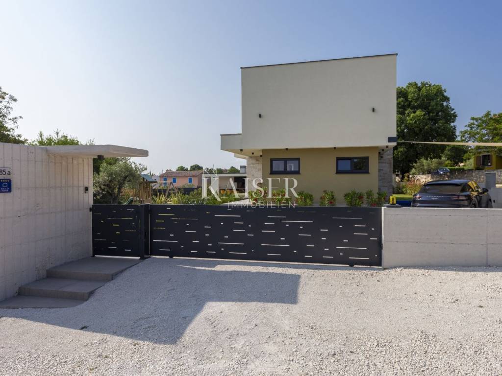 Kaiser Immobilien presents a modern villa with a swimming pool in a quiet location near Svetvinčenat. This elegant new building is located on the last urbanized plot of land in the village, which guarantees maximum privacy and tranquility. The villa covers 200 m² of living space, while the plot is 900 m², with a fully landscaped exterior and swimming pool. The ground floor has a spacious living room with kitchen and dining area, guest toilet, storage room, boiler room, as well as a covered terrace - ideal for relaxing during the warmer months. A special addition is an auxiliary building with a fireplace, perfect for creating a summer kitchen or a socializing area. Upstairs there are three comfortable bedrooms, each with its own bathroom and access to a balcony, from which there is a view of the surrounding nature and greenery. The courtyard is dominated by a 40 m² swimming pool with ceramic tiles, next to which there is a landscaped lawn with automatic irrigation, parking spaces for three vehicles, automatic entrance gates, and a fenced property that provides complete discretion and security. The villa is technically fully equipped – inverter air conditioners provide cooling and heating throughout the year, the first phase of underfloor heating has been installed with preparation for solar collectors, and quality materials have been used, including PVC joinery and high-class ceramic tiles in the interior and pool. The property is being sold fully equipped and furnished, which allows you to move in without additional investments. Located on the edge of the village, this villa offers the perfect balance between peace and accessibility. Nearby are numerous cycling and hiking trails, natural landscapes, wine roads and famous Istrian taverns. Svetvinčenat is a historic town with a rich cultural heritage, and at the same time is located in an excellent location – only a 20–30 minute drive to coastal towns such as Rovinj, Pula or Fažana. This villa is ideal for: -a private villa for year-round living or vacation -a luxury tourist rental with high income potential -family life in a natural and safe environment Proximity to amenities: Sea/beach- 15 km Airport- 32 km Distance from major cities: Ljubljana: 178 km Vienna: 559 km Budapest: 579 km Prague: 829 km Munich: 580 km Zagreb: 243 km If you would like to visit the property in person, please contact: Dean Cvitko E-mail: dean.cvitko@kaiser-immobilien.hr Tel: +385915284449 http://kaiser-immobilien.hr/