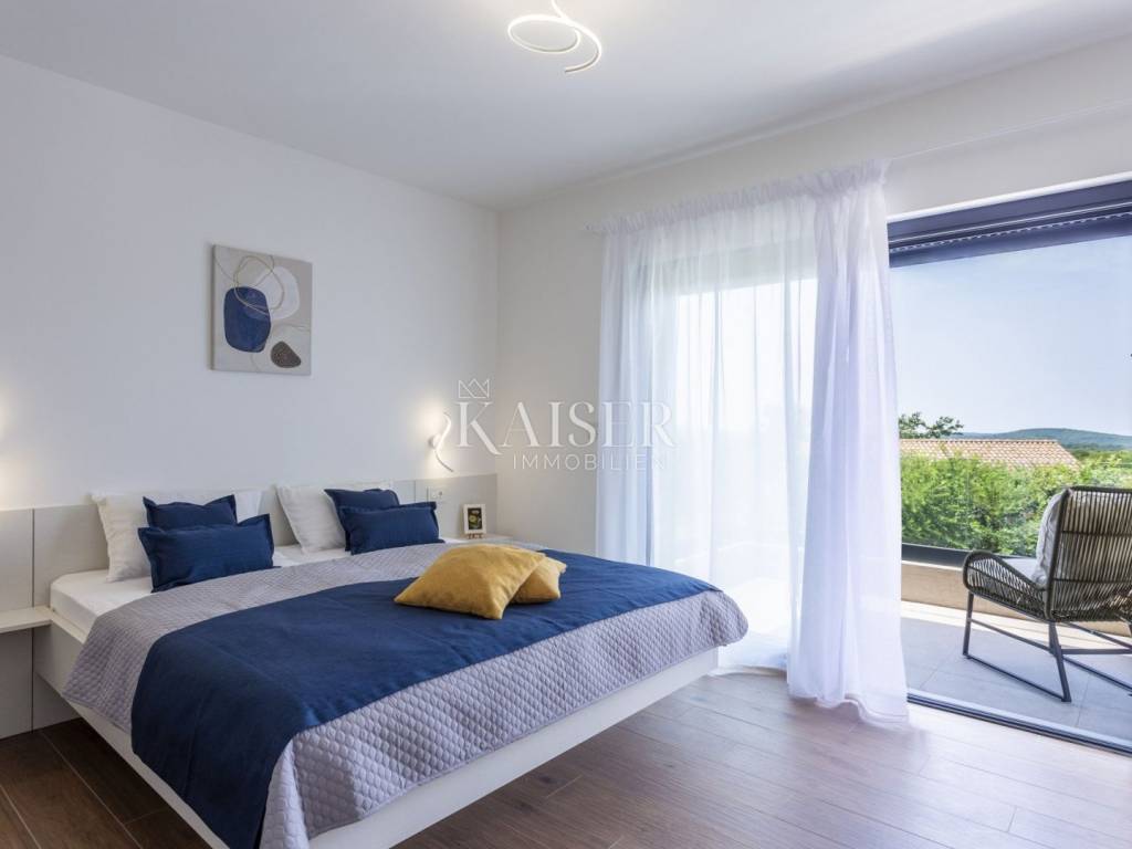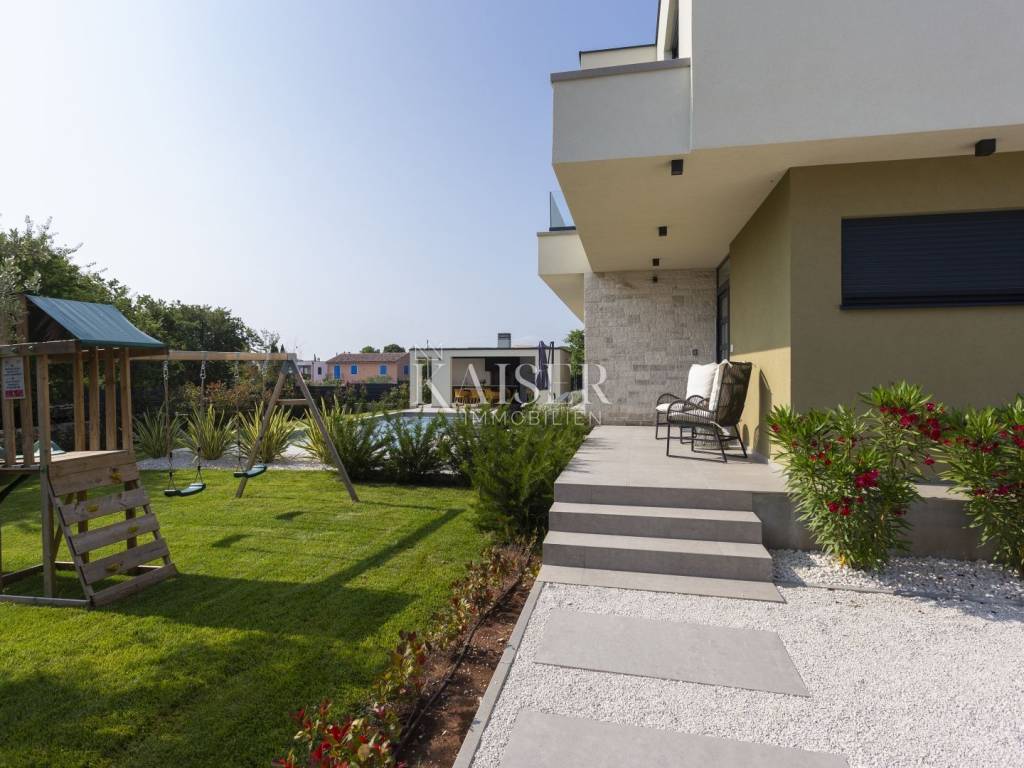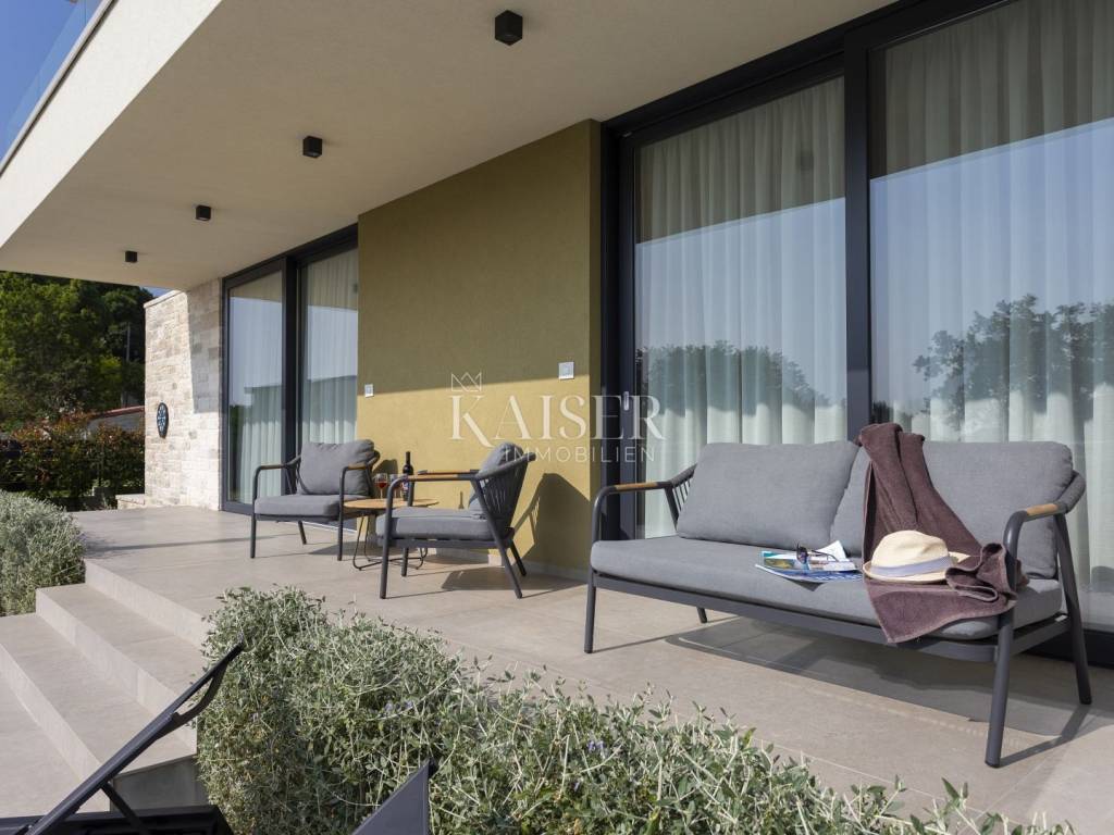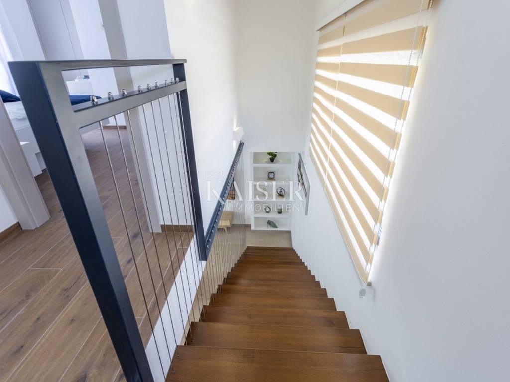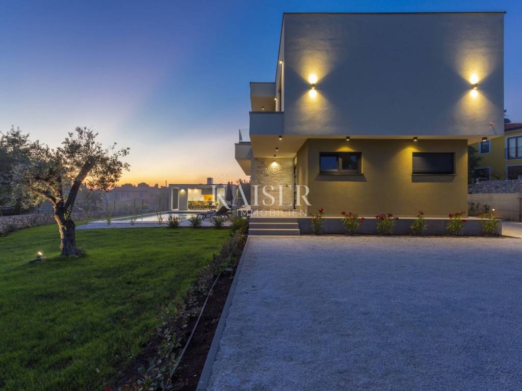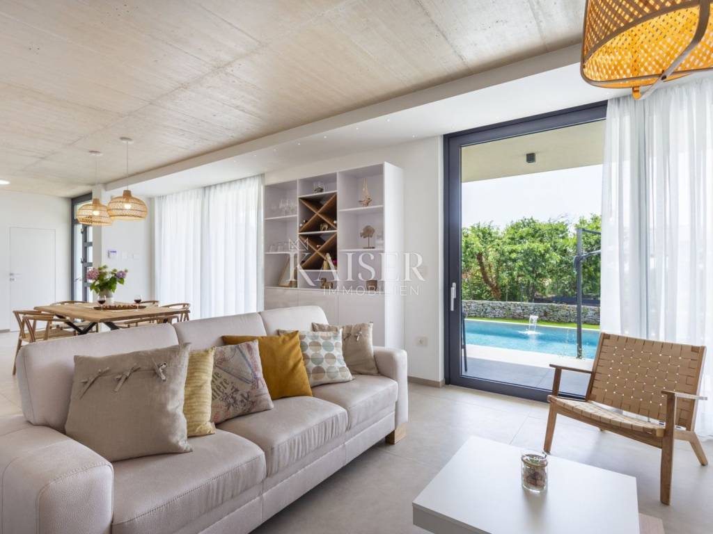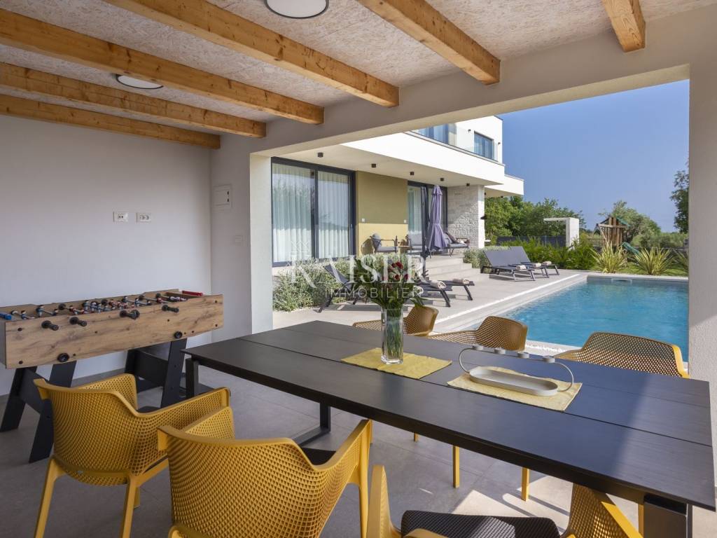 Kaiser Immobilien presents a modern villa with a swimming pool in a quiet location near Svetvinčenat. This elegant new building is located on the last urbanized plot of land in the village, which guarantees maximum privacy and tranquility. The villa covers 200 m² of living space, while the plot is 900 m², with a fully landscaped exterior and swimming pool. The ground floor has a spacious living room with kitchen and dining area, guest toilet, storage room, boiler room, as well as a covered terrace - ideal for relaxing during the warmer months. A special addition is an auxiliary building with a fireplace, perfect for creating a summer kitchen or a socializing area. Upstairs there are three comfortable bedrooms, each with its own bathroom and access to a balcony, from which there is a view of the surrounding nature and greenery. The courtyard is dominated by a 40 m² swimming pool with ceramic tiles, next to which there is a landscaped lawn with automatic irrigation, parking spaces for three vehicles, automatic entrance gates, and a fenced property that provides complete discretion and security. The villa is technically fully equipped – inverter air conditioners provide cooling and heating throughout the year, the first phase of underfloor heating has been installed with preparation for solar collectors, and quality materials have been used, including PVC joinery and high-class ceramic tiles in the interior and pool. The property is being sold fully equipped and furnished, which allows you to move in without additional investments. Located on the edge of the village, this villa offers the perfect balance between peace and accessibility. Nearby are numerous cycling and hiking trails, natural landscapes, wine roads and famous Istrian taverns. Svetvinčenat is a historic town with a rich cultural heritage, and at the same time is located in an excellent location – only a 20–30 minute drive to coastal towns such as Rovinj, Pula or Fažana. This villa is ideal for: -a private villa for year-round living or vacation -a luxury tourist rental with high income potential -family life in a natural and safe environment Proximity to amenities: Sea/beach- 15 km Airport- 32 km Distance from major cities: Ljubljana: 178 km Vienna: 559 km Budapest: 579 km Prague: 829 km Munich: 580 km Zagreb: 243 km If you would like to visit the property in person, please contact: Dean Cvitko E-mail: dean.cvitko@kaiser-immobilien.hr Tel: +385915284449 http://kaiser-immobilien.hr/