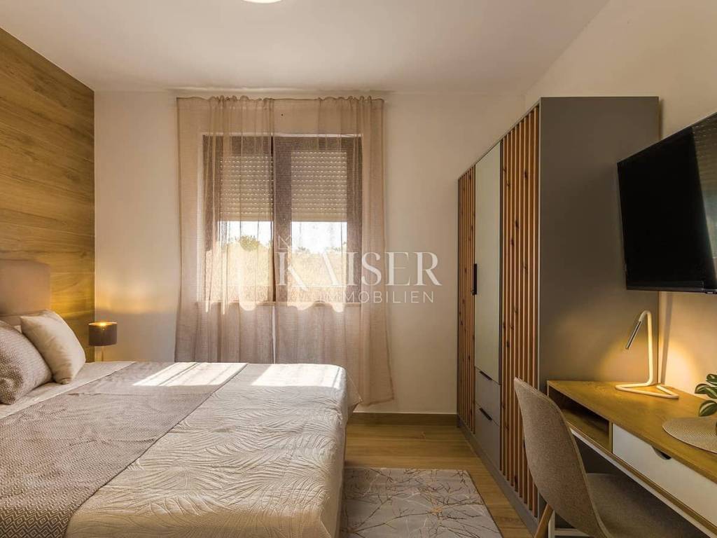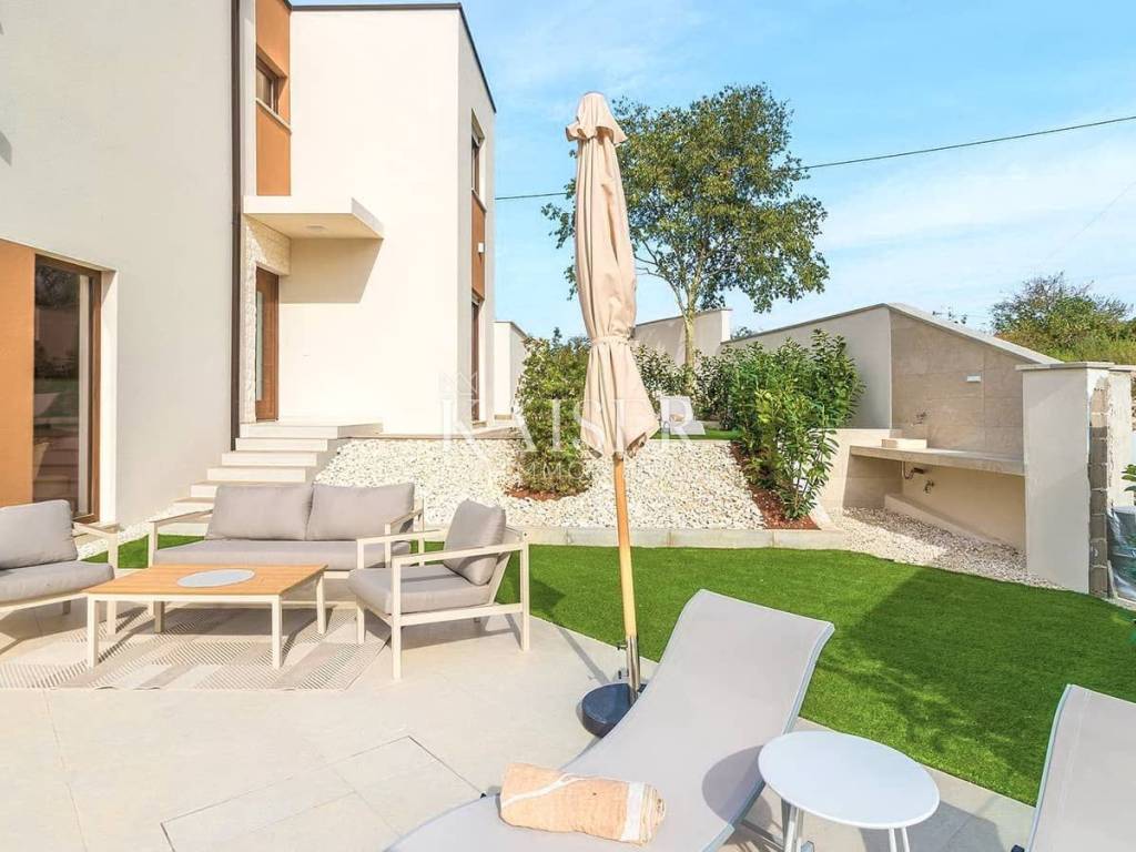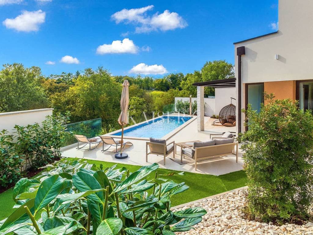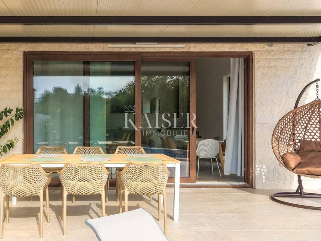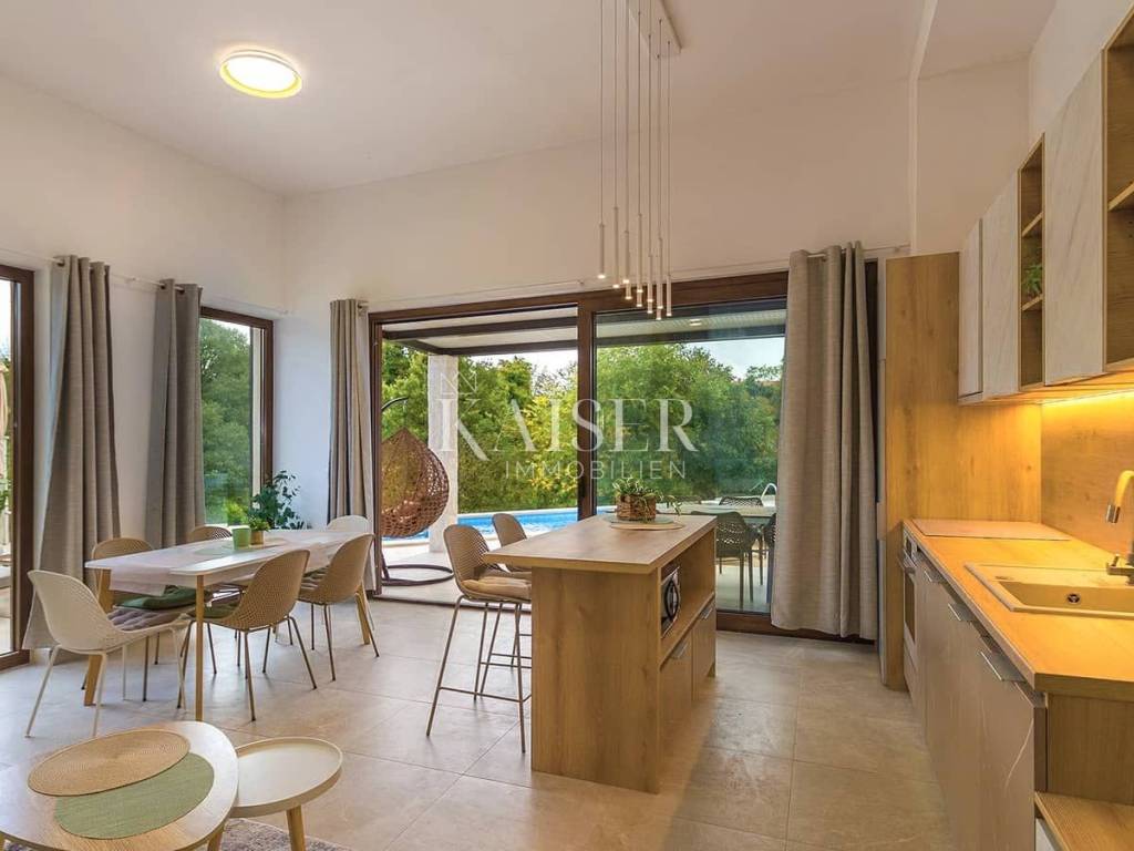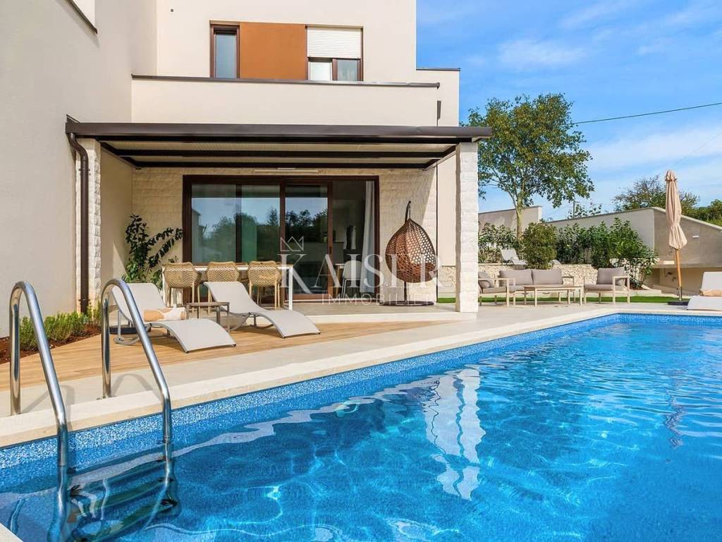 Kaiser Immobilien is offering for sale this beautiful modern semi-detached house located in a peaceful setting near Svetvinčenat, on the edge of a village surrounded by nature. Built in 2024, this property combines contemporary design, top-quality equipment and a functional layout, providing complete comfort for year-round living or tourist rental. The house has 145 m² of living space spread over two floors, and it has a landscaped garden with a 33 m² heated swimming pool, ideal for enjoying throughout the season. On the ground floor there is an entrance hall, a bathroom, one bedroom and a spacious open living room connected to the kitchen and dining room. The living area leads to a landscaped outdoor area with a covered terrace and swimming pool, which provides a perfect connection between the interior and the exterior. On the first floor there are the remaining two bedrooms, each with its own bathroom, ensuring complete privacy and a high level of comfort. The house is equipped with underfloor heating in the living room, kitchen and dining room, while heating and cooling in all rooms is regulated by air conditioning. Each bedroom has its own air conditioning, and each bathroom has an electric heater. The living room also has its own air conditioning. The garden is horticulturally decorated and adapted for carefree use throughout the year. Just 5 kilometers away is Savičenta, one of the most charming Istrian towns, known for its peaceful ambiance and rich historical heritage. The center of the town is dominated by the Renaissance square and the Morosini-Grimani castle, where numerous cultural events and festivals are held throughout the year. In Savičenta there are restaurants, taverns, cafes, shops, a post office and all the facilities necessary for everyday life. The town offers a perfect blend of tradition, comfort and modern amenities, which further complements the value of this property as ideal for living or tourist rental. Distances to key locations: - Pula Airport: 28 km - Rijeka: 104 km - Trieste (Italy): 120 km - Ljubljana: 200 km - Zagreb: 236 km - Munich: 630 km - Rome: 850 km - Prague: 870 km - Vienna: 590 km This house represents the perfect combination of modern comfort, elegant design and excellent location, and the Kaiser Immobilien agency provides professional support throughout the process. sales. The Kaiser Immobilien agency, as an authorized intermediary, charges an intermediary fee in the amount of 3% + VAT when concluding a pre-contract or sales contract. For all additional information, please contact: Dean Cvitko Phone: +385915284449 E-mail: dean.cvitko@kaiser-immobilien.hr