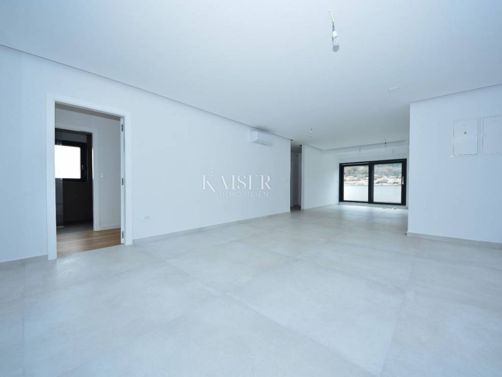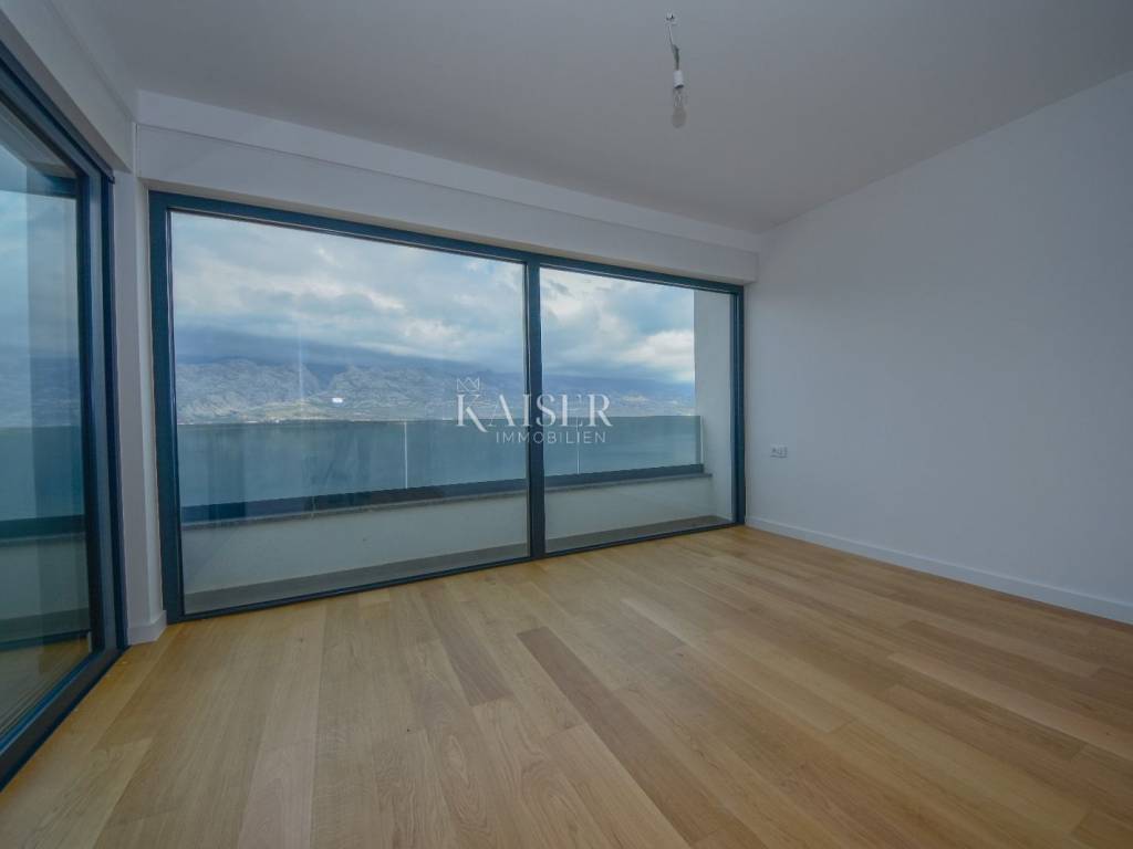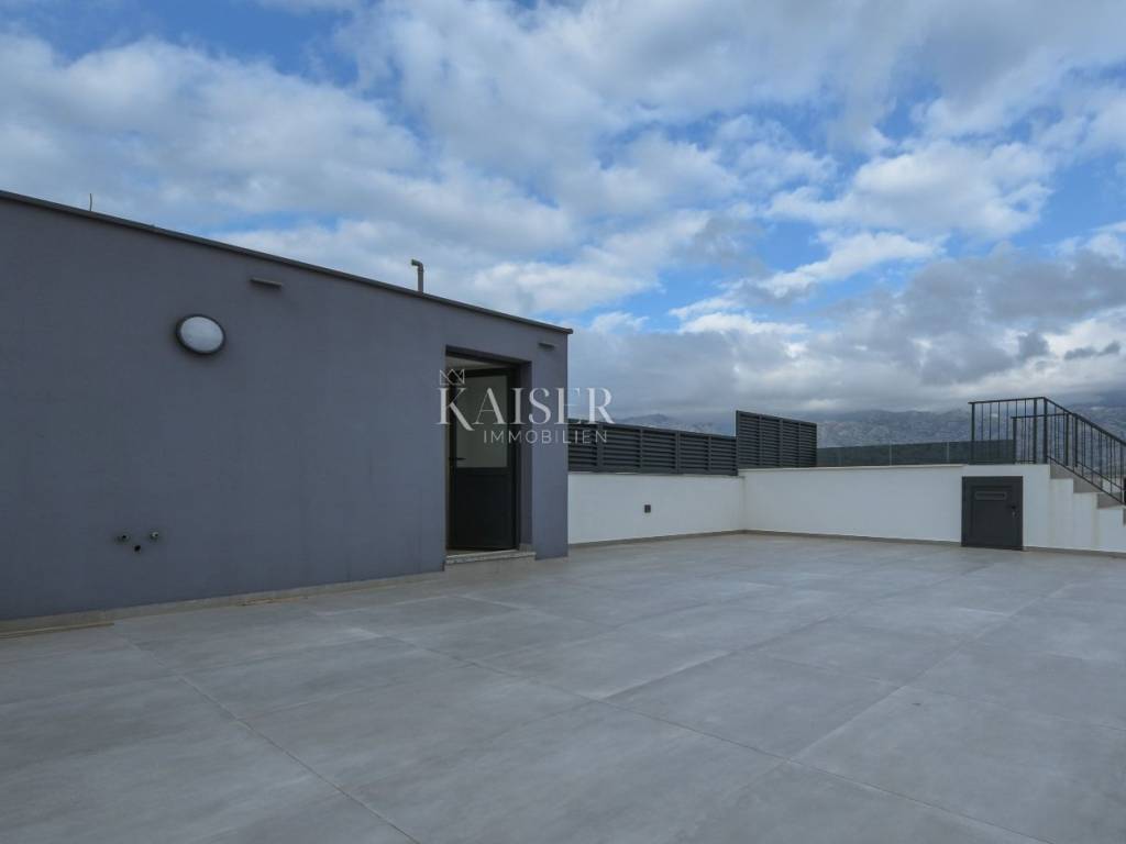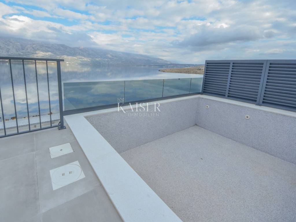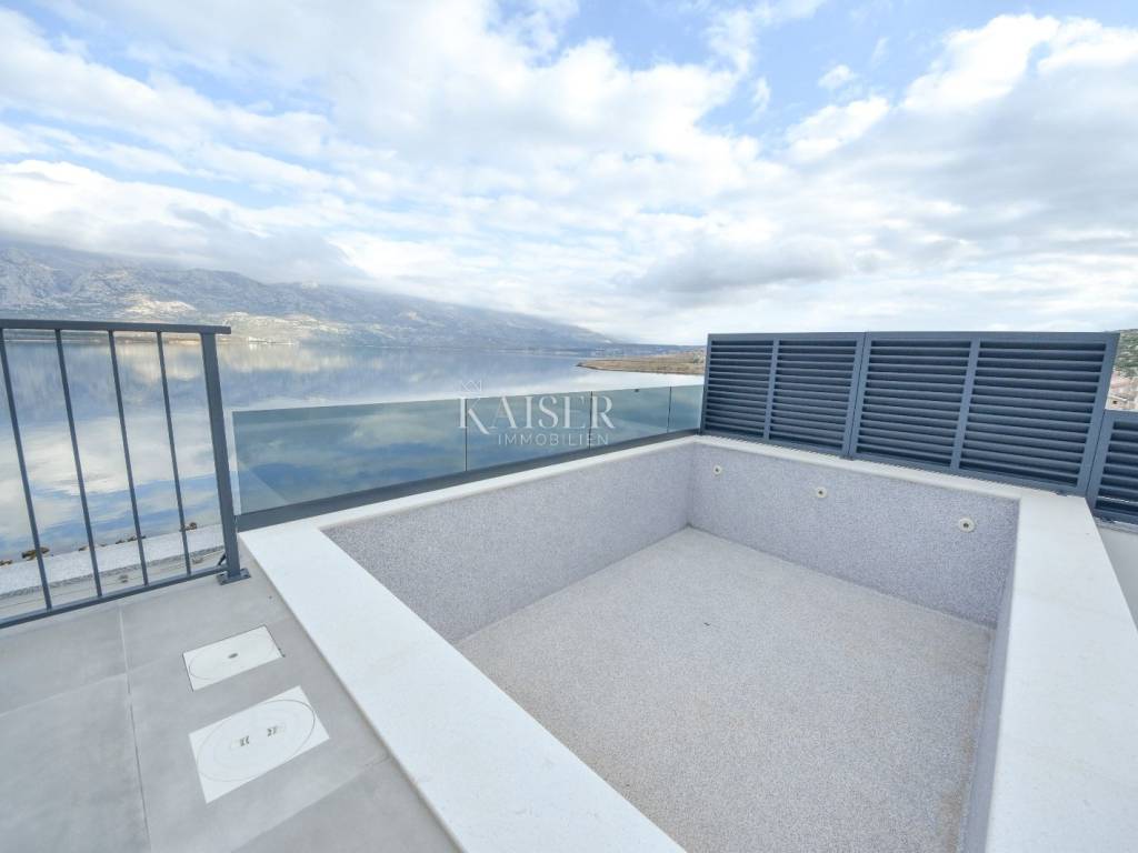 Kaiser immobilien mediates the sale of a luxury penthouse apartment, first row to the sea, in Vinjerac, not far from Zadar. Vinjerac is a picturesque place with a rich maritime tradition and irresistible Mediterranean charm. It is located on a peninsula on the southeast side of the Velebit Channel, about 35 km northeast of Zadar. When you arrive at the place, the panorama you will see will leave you speechless. The apartment with a living area of 134.85 m2 is located on the 1st floor of a newly built building, located in the first row to the sea. It consists of three bedrooms, living room with kitchen and dining room, hallway and two bathrooms. There is also a covered terrace of 14.90 m2, ideal for enjoying summer evenings, and an uncovered terrace of 9 m2 with a glass fence that takes your breath away with its panoramic view of the sea and the Velebit mountain. An additional feature is the roof terrace of 101m2, which can be reached by an internal staircase, where there is a swimming pool with a sunbathing area and a shower. In the construction and furnishing, top-quality materials were used, so that the object has built-in high-quality ceramics, underfloor heating is provided by a heat pump, air conditioning in all rooms, massive aluminum carpentry, automatic shutters and mosquito nets. The apartment comes with a parking space. The commission of the agency for the buyer is 3% + VAT and is paid in case of real estate purchase, when the first legal deed is concluded.