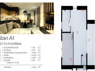 Kaiser Immobilien presents: Modern one-bedroom apartment with loggia in a new building, Rogoznica In the heart of Dalmatia, in the picturesque and increasingly sought-after town of Rogoznica, is located this beautiful, modern one-bedroom apartment. As part of a new residential complex, this property offers the perfect blend of functional design, high-quality materials and proximity to the sea, making it an ideal investment opportunity or a perfect holiday retreat. ABOUT THE PROPERTY: The apartment has been carefully designed to maximize space and emphasize an open and bright ambiance. With a total net usable area of 41.78 m², it offers everything you need for a comfortable stay. APARTMENT LAYOUT: Entrance / Hallway: 1.55 m² Kitchen: 5.01 m² Living room and Dining room: 15.66 m² Bedroom: 10.00 m² Bathroom: 4.68 m² Loggia: 6.51 m² (calculated 4.88 m²) The layout is modern and efficient, with an "open-space" living room and dining room that maximizes natural light and provides direct access to a private loggia for outdoor relaxation. KEY FEATURES AND BENEFITS: New construction in a prime location: Be the first owner of an apartment in a new, modern building. Private loggia: The perfect place for morning coffee or evening relaxation, with access from the living room. High-quality materials: High-quality materials are used in the construction and furnishing, ensuring durability and value. Functional layout: Ideal for a vacation or as a profitable investment for tourist rental. Possibility of customization: Buyers are offered the flexibility and the ability to choose certain finishing materials during construction. LOCATION: Rogoznica is one of the most beautiful and protected bays on the Adriatic, known for its crystal clear sea, beautiful beaches and the famous Marina Frapa. The proximity of Split, Šibenik and the airport makes it an extremely accessible and sought-after destination. Don't miss the opportunity to become the owner of this beautiful property in one of the most attractive locations on the Dalmatian coast! The agency commission for the buyer is 3% + VAT and is paid in the case of purchasing a property, upon conclusion of the first legal act. Viewing the property is possible only with the prior signing of a real estate brokerage contract. If you would like to visit the property in person, please contact: Joško Bašić E-mail: josko@kaiser-immobilien.hr Tel: +385-91-511-2993 http://kaiser-immobilien.hr/