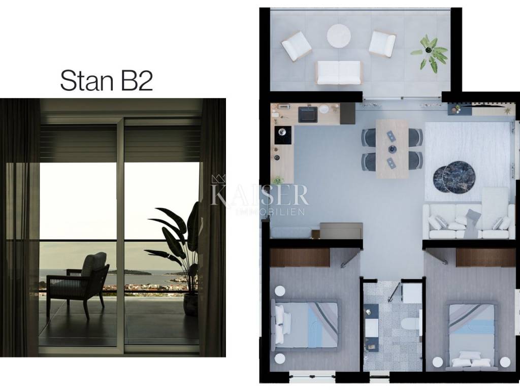 Kaiser Immobilien presents: Spacious two-bedroom apartment with loggia and sea view, Rogoznica In the heart of Dalmatia, in the picturesque and increasingly sought-after town of Rogoznica, is this beautiful, modern two-bedroom apartment. As part of a new residential complex, just 400 meters from the sea, this property offers the perfect blend of functional design, high-quality materials and a beautiful view, making it an ideal opportunity for family life, vacation or as a top investment. ABOUT THE PROPERTY: The apartment has been carefully designed to maximize space and emphasize an open and bright ambiance. With a total gross area of 68.50 m², it offers everything needed for a comfortable stay for a larger family or group. APARTMENT LAYOUT: Entrance area / Hallway: 4.34 m² Kitchen: 7.29 m² Living room and Dining room: 19.31 m² Hallway (sleeping area): 2.29 m² Bedroom 1: 10.14 m² Bathroom: 4.68 m² Bedroom 2: 10.14 m² Loggia: 10.31 m² The layout emphasizes the "open-space" concept, connecting the kitchen, dining room and living room, while ensuring privacy with two separate bedrooms and a spacious loggia for outdoor relaxation. KEY FEATURES AND BENEFITS: New construction in Rogoznica: Be the first owner of an apartment in a new, modern building with a sea view. Private loggia (10.31 m²): Spacious loggia with access from the living room, ideal for enjoying the view and fresh air. High-quality materials: High-quality materials are used in the construction and furnishing, ensuring durability and value. Functional layout: Ideal for a family, vacation or as a highly profitable investment for tourist rental. Customization: Buyers are offered flexibility and the ability to choose certain finishing materials during construction. Parking: Secured parking space. LOCATION: Rogoznica is one of the most beautiful and protected bays on the Adriatic, known for its crystal clear sea, beautiful beaches and the famous Marina Frapa. The proximity of Split, Šibenik and the airport makes it an extremely accessible and sought-after destination. Do not miss the opportunity to become the owner of this beautiful property in one of the most attractive locations on the Dalmatian coast! The agency commission for the buyer is 3% + VAT and is paid in the case of purchasing a property, upon conclusion of the first legal act. Viewing the property is possible only with the prior signing of a real estate brokerage contract. If you would like to visit the property in person, please contact: Joško Bašić E-mail: josko@kaiser-immobilien.hr Tel: +385-91-511-2993 http://kaiser-immobilien.hr/
